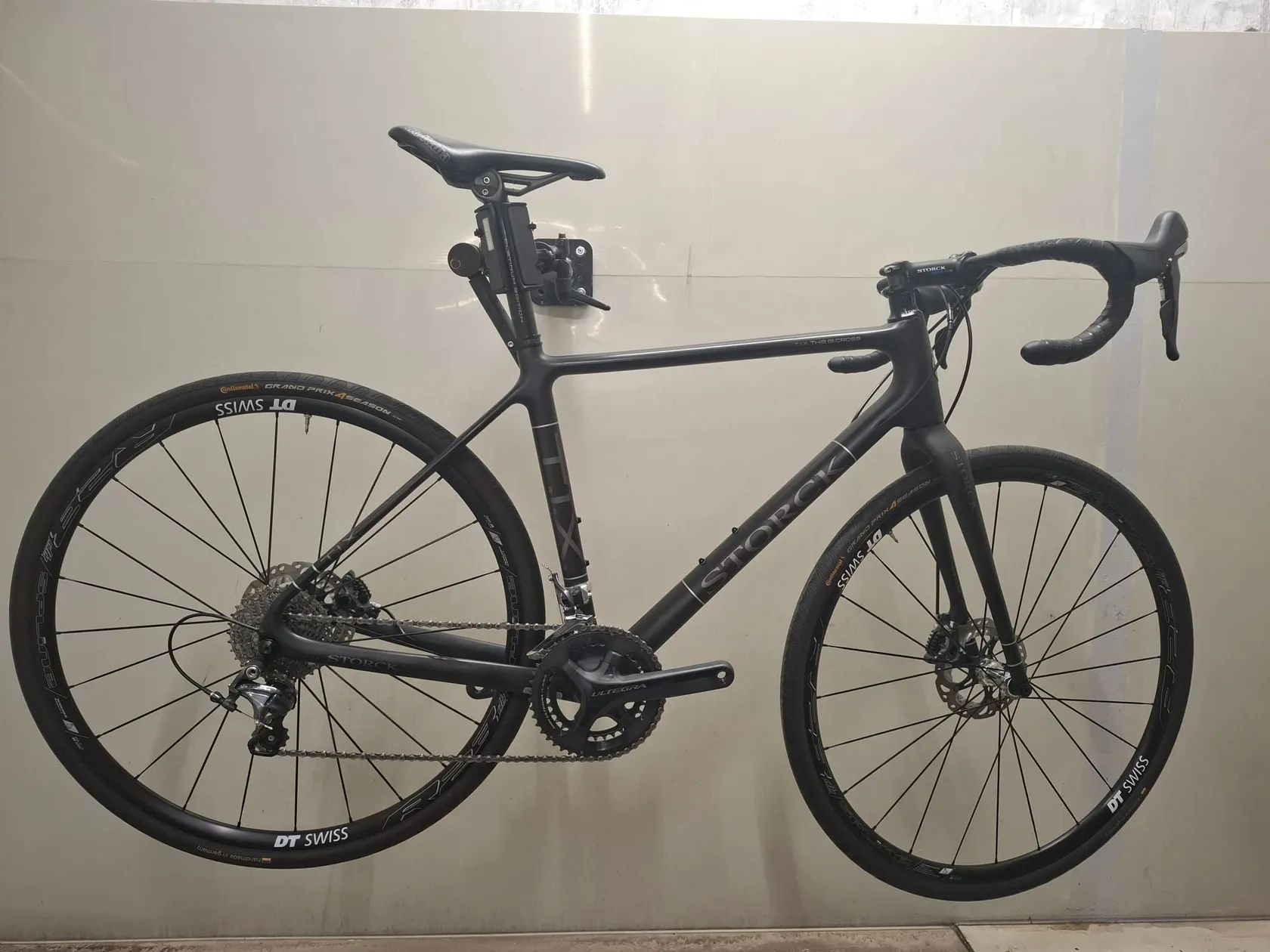 Komponenty Shimano Ultegra 2x11 s převody 46/34 kazeta 11/36 Zapletená kola DT Swiss R23 DB Spline Řidítka: Karbonové ENVE gravel Sedlo, sedlovka, představec přímo od výrobce Storck Pláště Continental GP 4-season 32mm