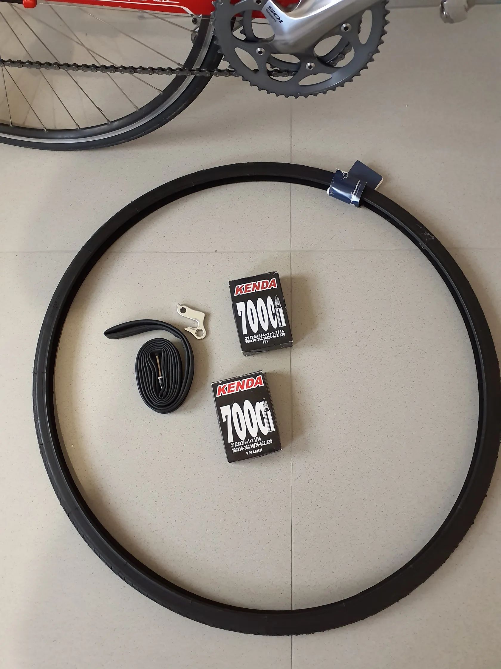 Součástí jsou náhradní díly (patka, plášť, 3× duše); kolo se prodává bez pedálů.