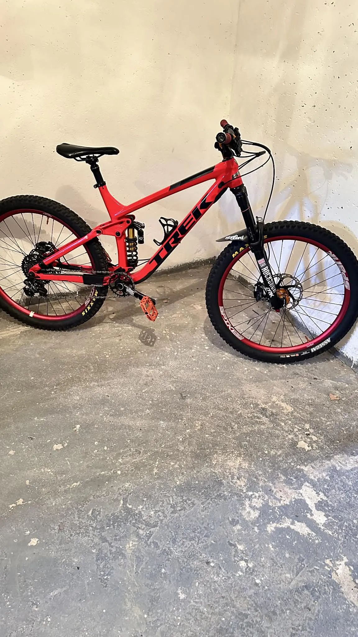Prodám celoodpružené enduro kolo Trek Remedy 9, velikost L, ročník 2017. Specifikace : - rám hliník Alpha Platinum Aluminum, ABP, Boost148, ochranná trubka Knock Block, plovoucí uchycení tlumiče Full Floater, EVO link, kónická hlavová trubka E2, Mino Link, vnitřní vedení lanek Control Freak, chránič dolní trubky, PF92, ISCG 05, zdvih 150 mm - vidlice RockShox Lyrik RC, vzduchová vidlice s dvojitou polohou, tlumič Charger Damper, kónický sloupek E2, Boost110, zdvih 130 mm/160 mm - řazení, přehazovačka a kliky Sram X1 - kazeta SRAM XG-1150, 10-42, 11 rychlostí Specifikace oproti sérii: - teleskopická sedlovka KS Lev Integra, zdvih 150 mm - představec Burgtec Enduro MK3 - 4pístové brzdy Shimano ZEE - brzdové kotouče Shimano ICE-TECH – vpředu 203 mm, vzadu 180 mm - gripy Lizard Skins Lock-On Peaty s objímkami - zapletená kola 27,5´ na ráfcích Spank Spike 33 mm, bezduše - vložky Pepi’s Tire Noodle v obou kolech - náboje HOPE PRO 4 - pláště Maxxis Assegai 2.50 - zadní tlumič Cane Creek Double Barrel Coil CS, pružina VALT 2.25 x 550 - bashguard s vodítkem řetězu - pedály Bontrager Line Elite Kolo vlastním cca 5. rokem a má bohužel kosmetiku s kterou jsem kolo pořídil, nejsem 1. majitel. Za mě kolo nedostávalo žádnou bídu - nejsem profík ani letec, s tímhle stylem ježdění jsem začal až s pořízením kola, poslední větší servis 2 roky zpátky, kdy proběhlo odvzdušnění brzd, výměna ložisek v zadní stavbě a přepákování, komplet servis vidlice, servis tlumiče u Krabcycles v Praze. Na obou kluzácích vidlice jsou oděrky viz foto,nemají vliv na funkci a vidle olej netahá. Za poslední dva roky jsem na kole skoro vůbec nejezdil a závody vůbec, letos max nějaká vyjížďka kolem komína, loni bikepark Polevsko a to bych spočítal na prstech jedné ruky, jinak mi kolo visí v bytě na zdi a práší se něj, takže jsem další servis neřešil. Ke kolu přidám papíry, původní vzduch. tlumič RockShox Deluxe RT3, tlumič RE:aktiv se 3 polohami a teleskopku (zdvih myslím 125mm)