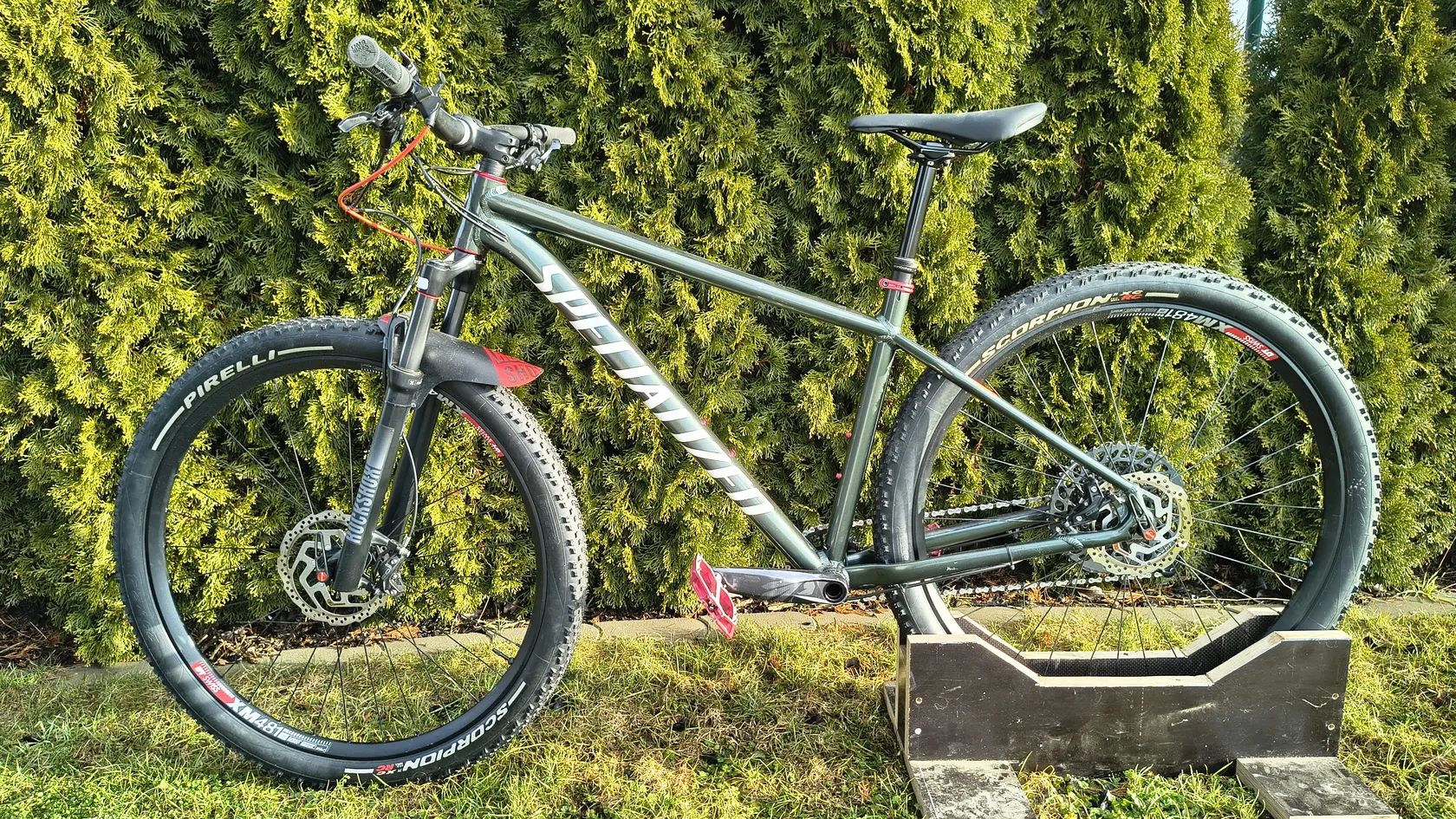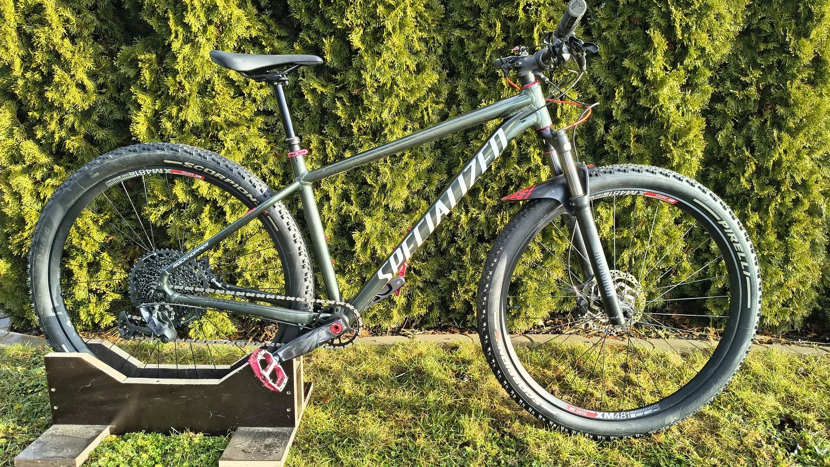 Byl to Specialized Rockhopper Expert, z něj však zbyl jenom rám, vidlice RockShox Judy a sedlo Specialized bridge sport. Ostatní jsem vylepšil: Vidlice předělaná na ovládání na řídítkách Karbonová řídítka průměr 35mm a k tomu odpovídající představec Hlavové složení na průmyslových ložiscích místo věnečků Středové složení DUB + sada Sram GX eagle, kazeta 10-52, převodník 30 Ráfky DT Swiss XM481 + náboje DT Swiss 350 s RWS Alu rychloupínáky Nové Pirelli Scorpion XC RC 29x2.4 pláště a bezdušové ventilky Brzdy Sram G2 RSC s původními kotouči shimano Teleskopická sedlovka Crankbrothers Highline 3 se zdvihem 125mm Nechám k němu i pedály nukeproof horizon sam hill a původní sadu kol. Jezdil jsem na něm skoro 4 roky takže má pár šrámů, ale staral jsem se o něj hezky, takže všechno funguje jak má.