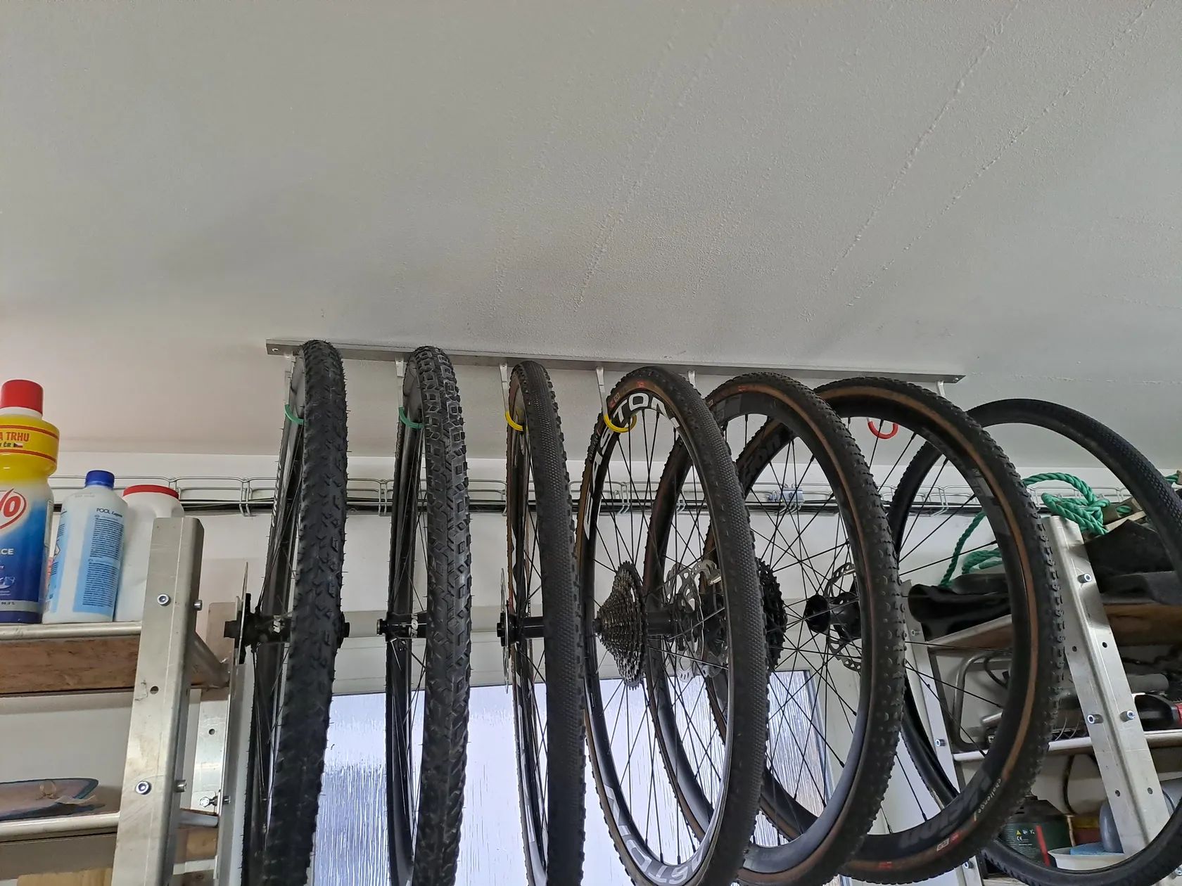 Držák na kola. Prodám drzak na kola jak je na foto samostatně. Materiál nerez tl. 6mm délka 110cm. Přišroubuje se do stropu.