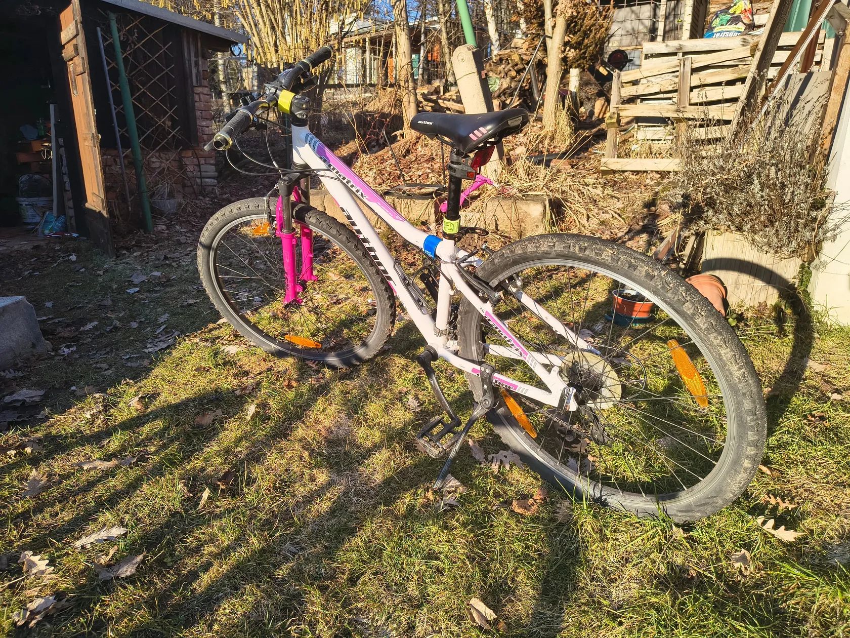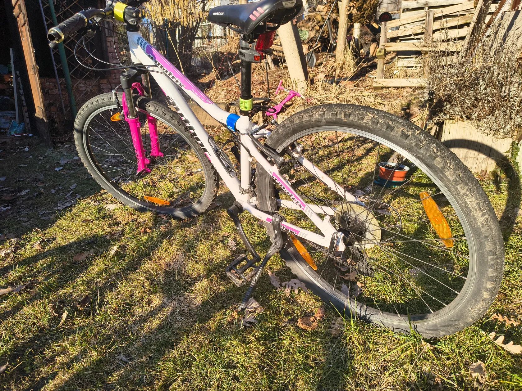 Dobrý den, prodám ve své třídě jedno z nejlehčích kol. Kolo je používané, nicméně každý rok servisované. Na kole se jezdilo pouze na cyklostezkách. Kolo má odpruženou vidlici. Brzdy Vbrake, brzdí skvěle. Protože dcera měla problém s přehazováním, původně na kole byl grip shift, proběhla výměna na páčkové řazení. Počet rychlostí je na kole 3 x 6. Na kole nechám košík, světla, blatníky a stojánek. Pláště jsou ještě hodně dobré. Původní cena kola byla 15000,-. Podívejte se na fotky, pokud jakýkoliv dotaz, neváhejte mne kontaktovat. Ještě mám jedno stejné kolo, ale stříbrné. Jako důvod prodeje, holky z nich už vyrostli. Musím pořídit větší.