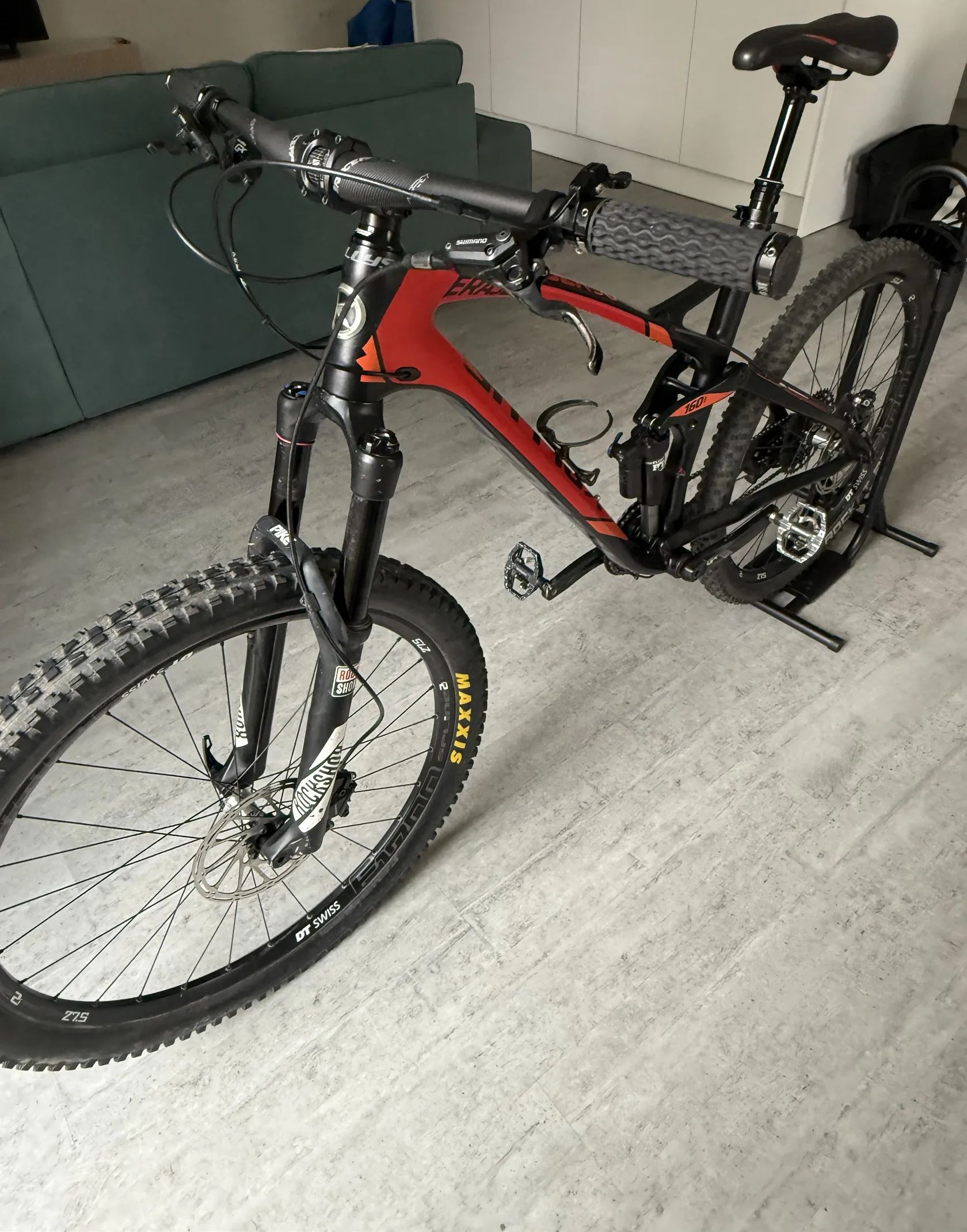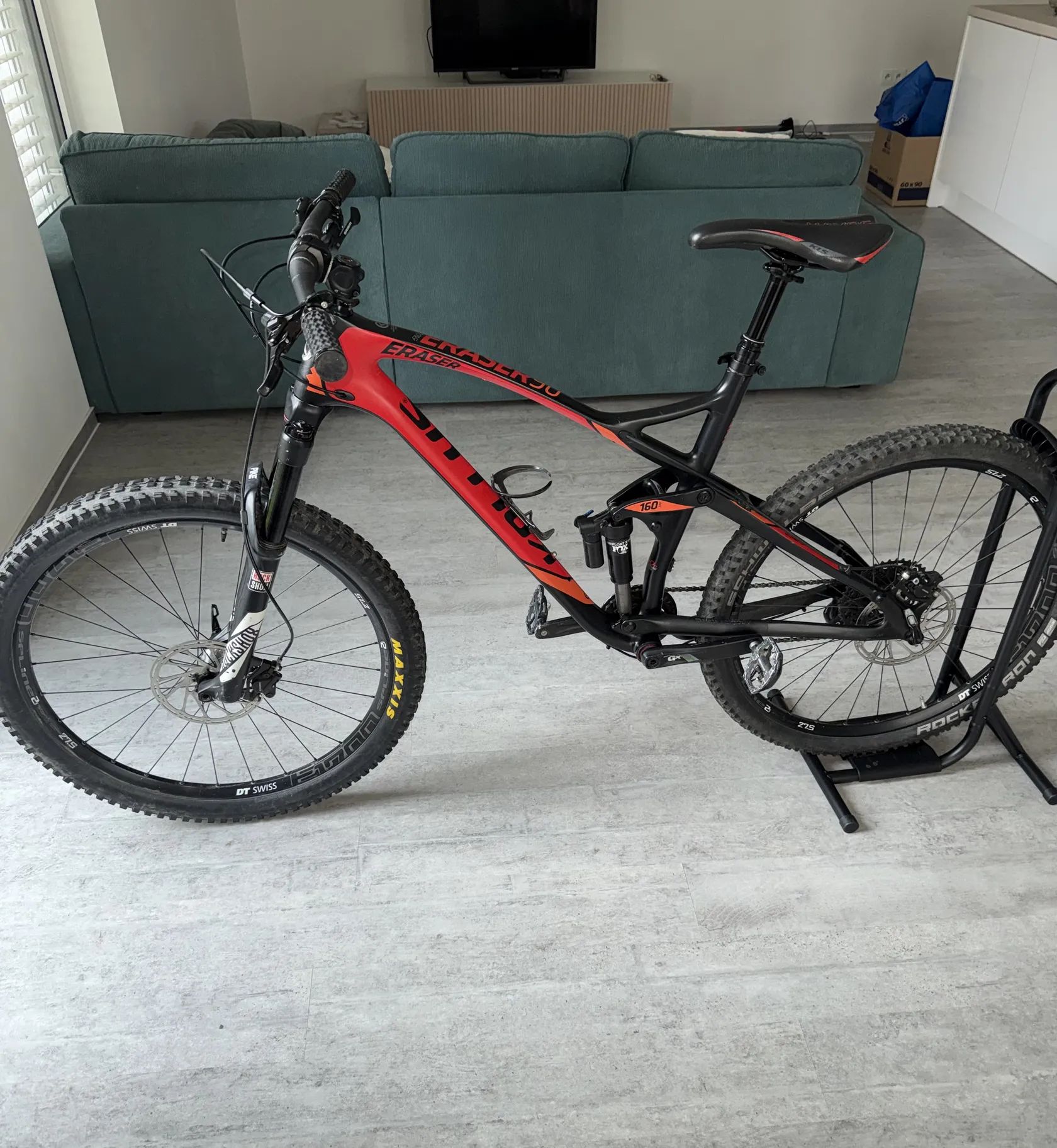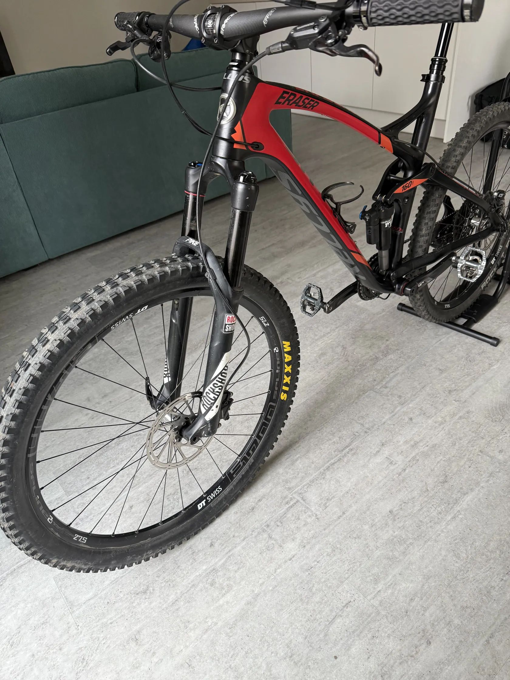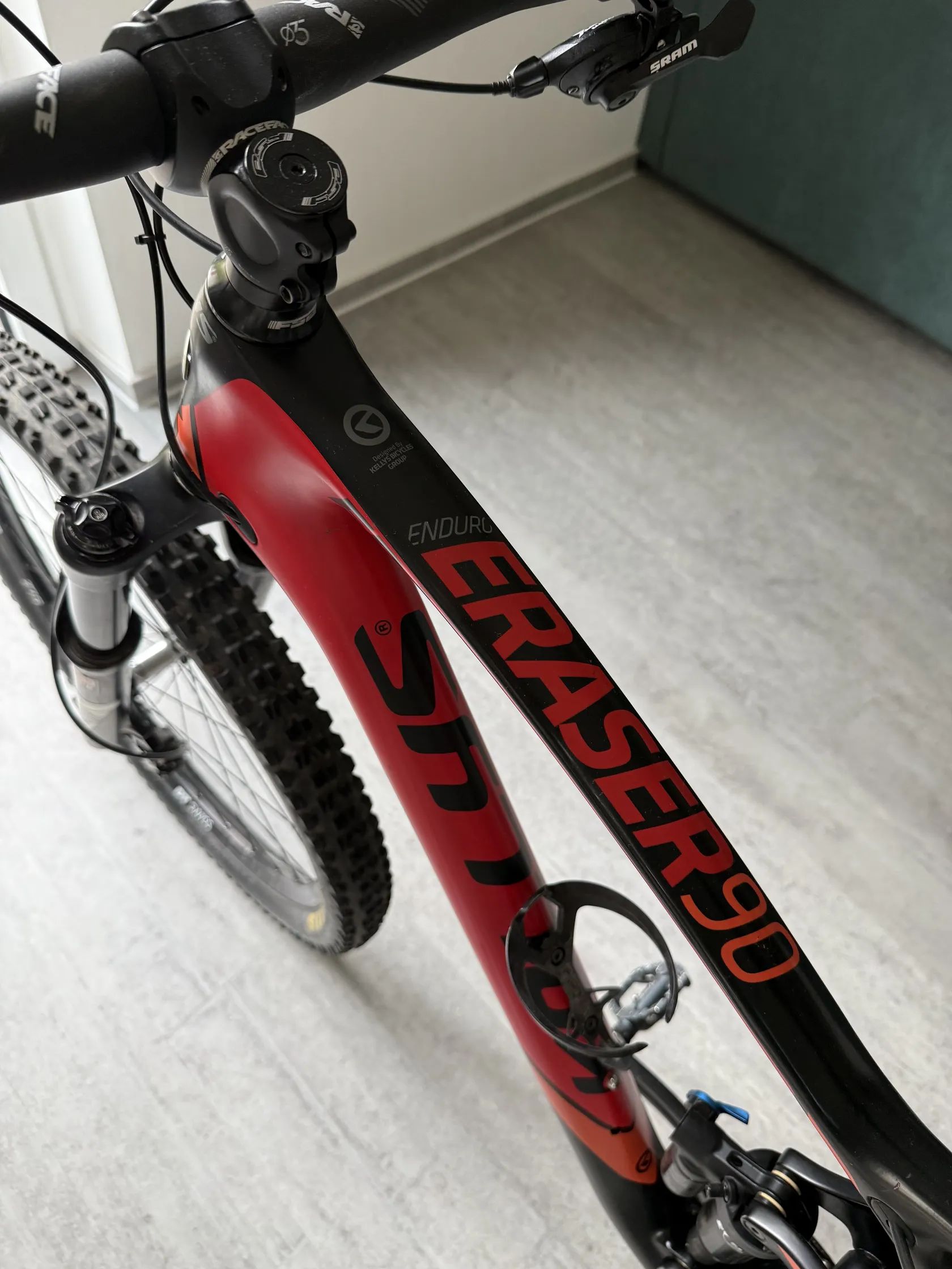 Prodám Kellys Eraser 90, karbonový rám velikost L na 27,5 kolech, zdvih 160mm Přední vidlice Rockshox, zadní tlumič FOX Brzdy Shimano, přehazovačka Sram 1x11 Kliky Sram GX Teleskopická sedlovka Pedály Shimano Lehké oděrky, jinak si myslím pěkný stav
