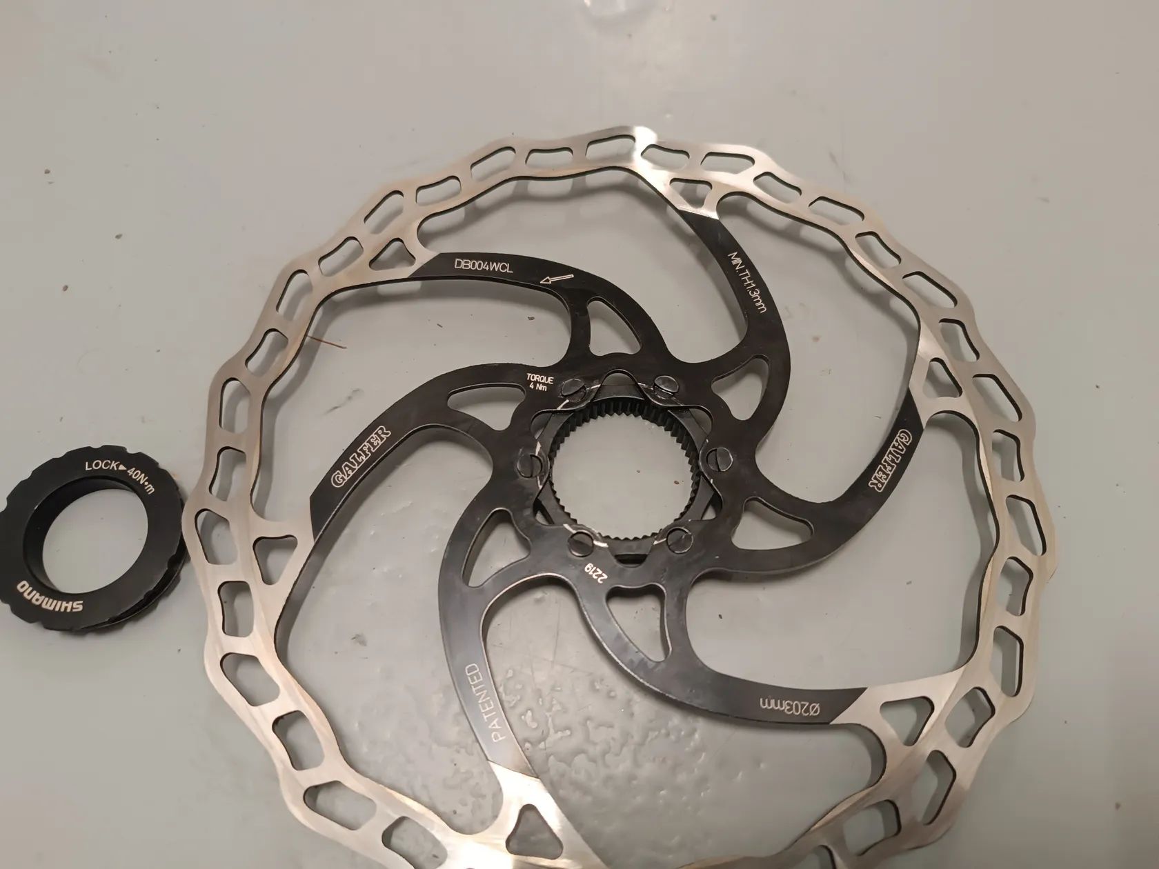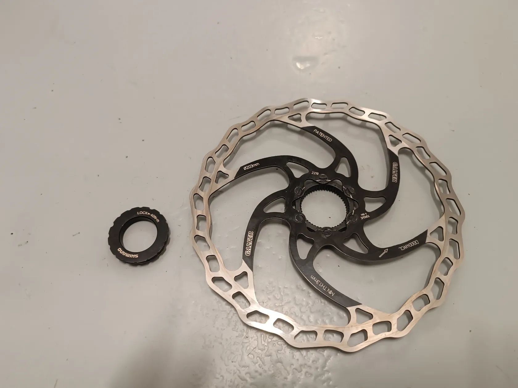 Prodám kotouč Galfer DB004WCL Fixed Wave - 203 mm, centrlock, nehází, málo ježděný, téměř nesjetý, aktuální tloušťka 1,8mm (tloušťka nového kotouče 1,8mm).