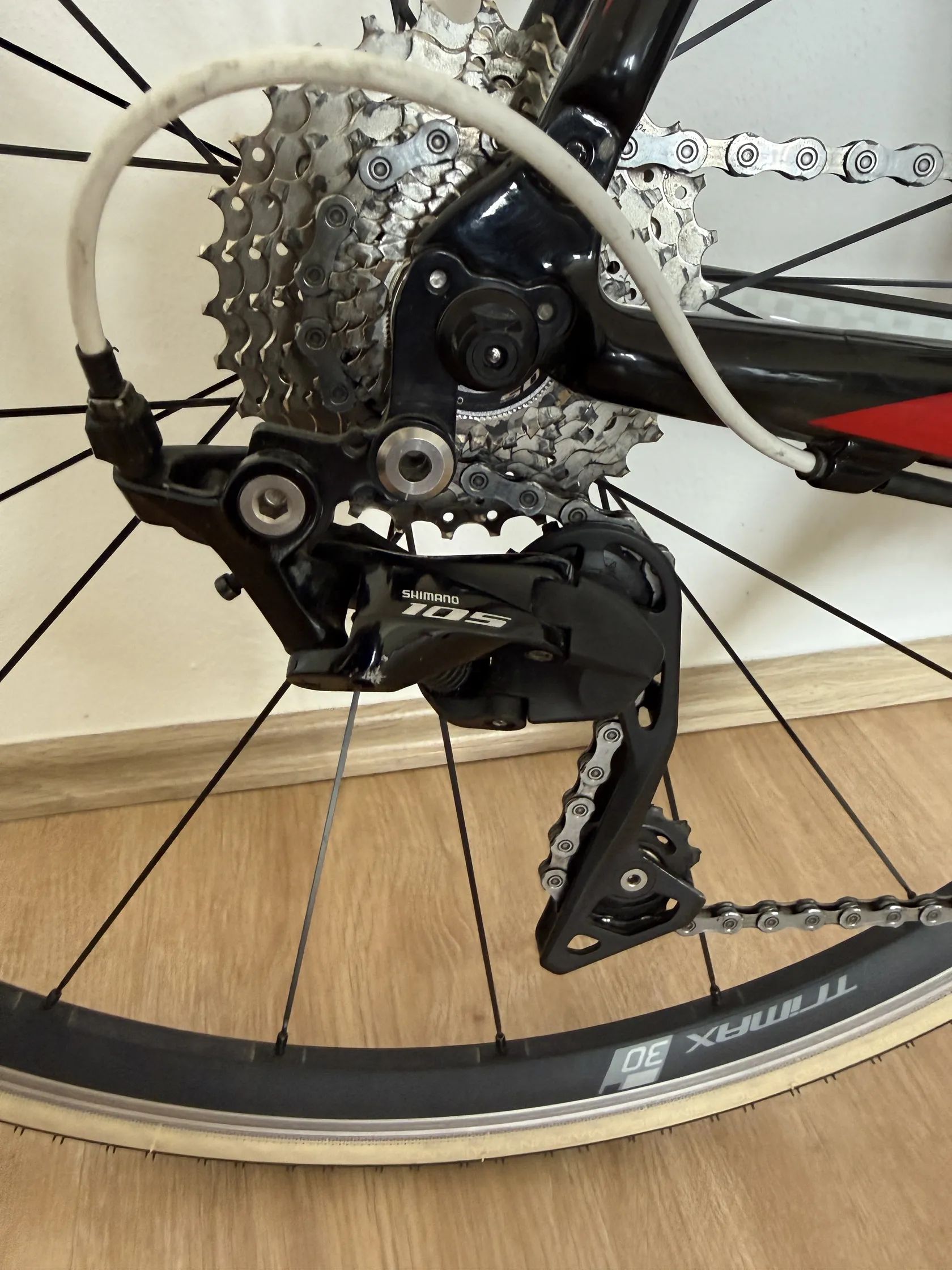 Sada Shimano 105 2x11 (mechanická, cca rok stará) – spolehlivá střední třída vhodná i pro sportovní jízdu