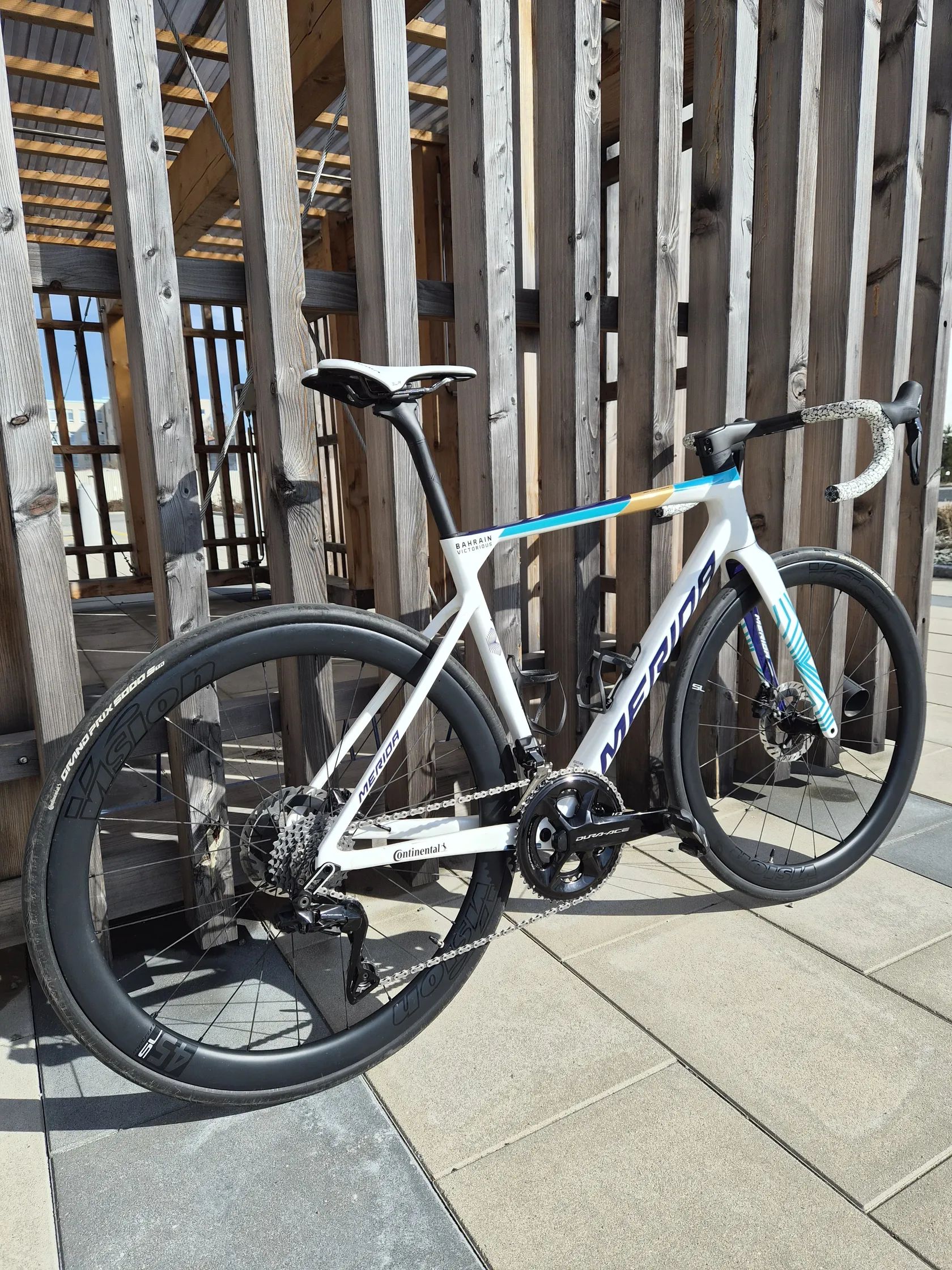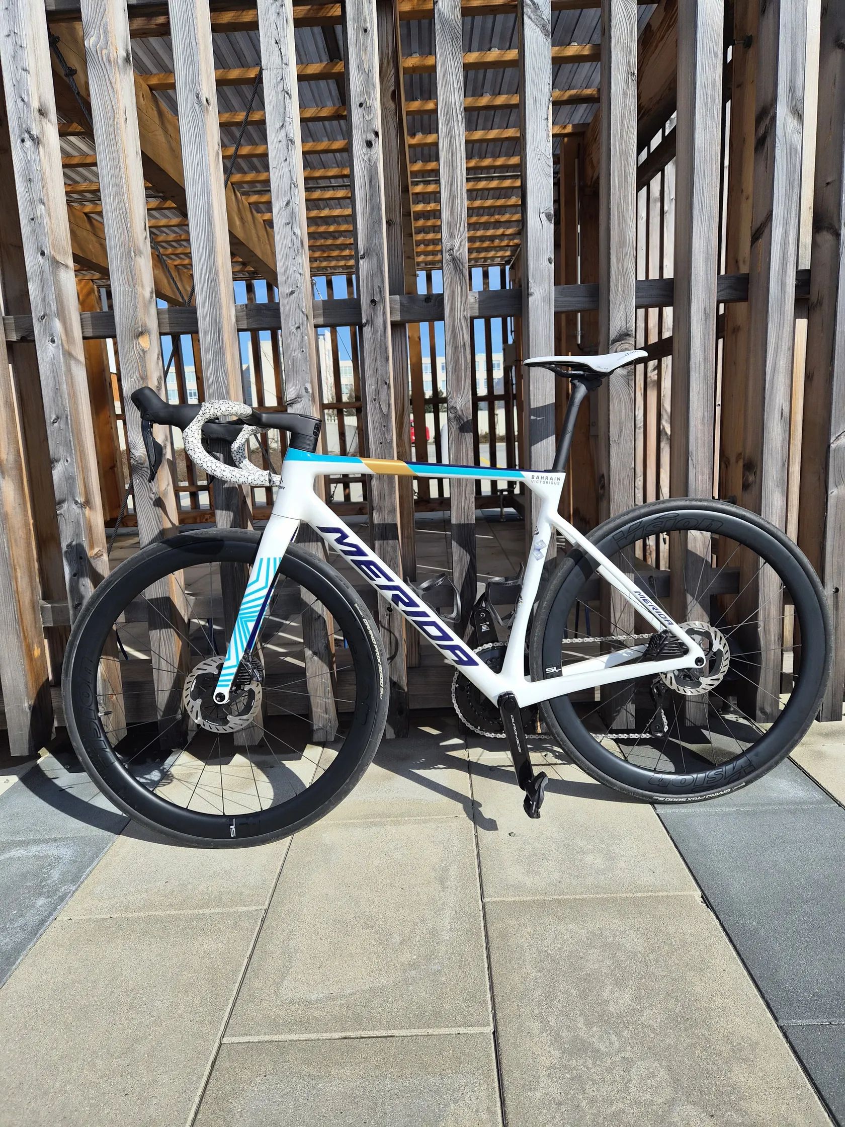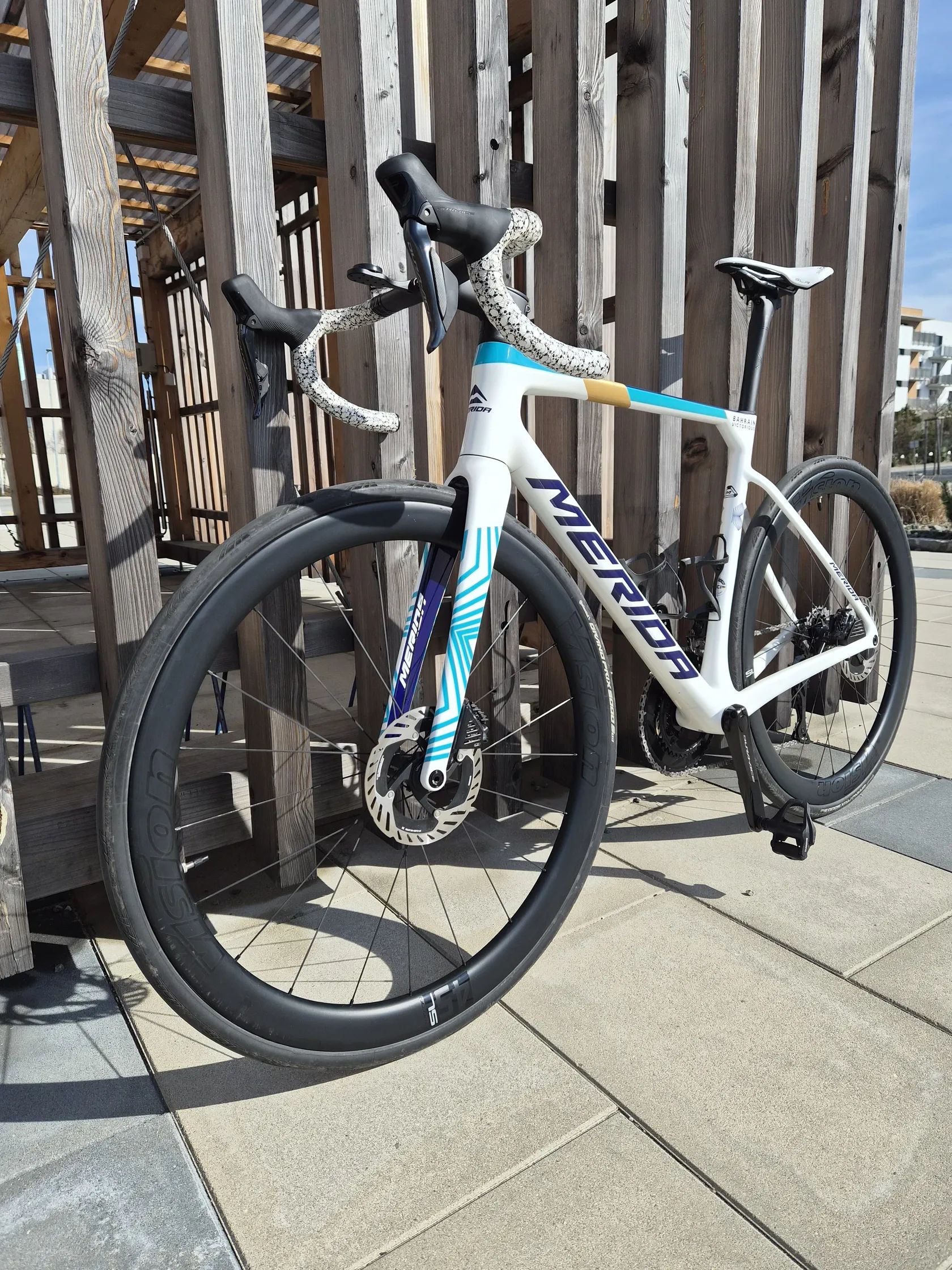 Prodám top lightweight model s aero prvky od Meridy na sadě Shimano Dura Ace Di2 včetně Wattmeteru. Karbonový kokpit, karbonová kola VISION Metron 45SL. Oproti sérii je na kole sedlo Selle Italia SLR Boost Superflow Kit Carbon a omotávka Supacaz, aby to ladilo do barvy s rámem . U Meridy je to velikost M, ale za mě je to L, vrchní rámová trubka je 560mm. Na mých 182cm ideální. Kolo jsem koupil na konci února 2025 v Cyklopoint Jičín kde bylo i po celou dobu servisováno. Poslední servis proběhl letos v březnu, je připravené na sezónu. Stav nového kola bez jediného škrábance, kolo je na kritických místech opatřebo ochrannou fólií.