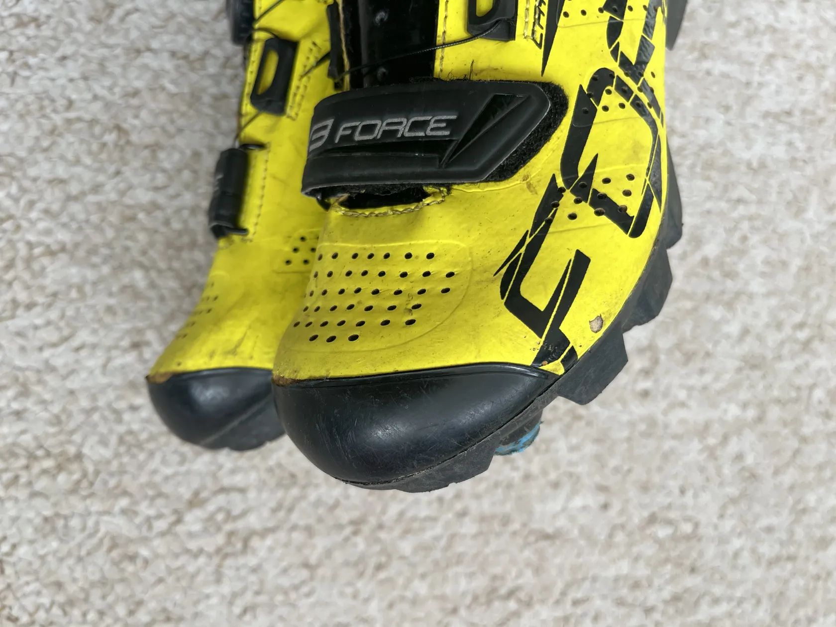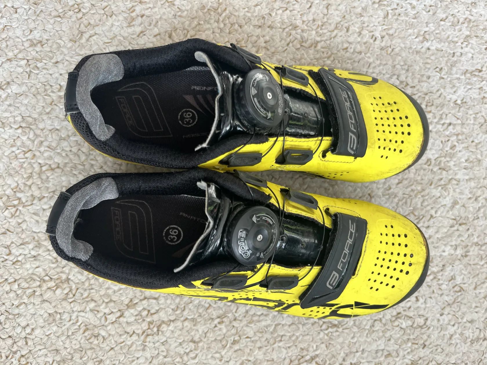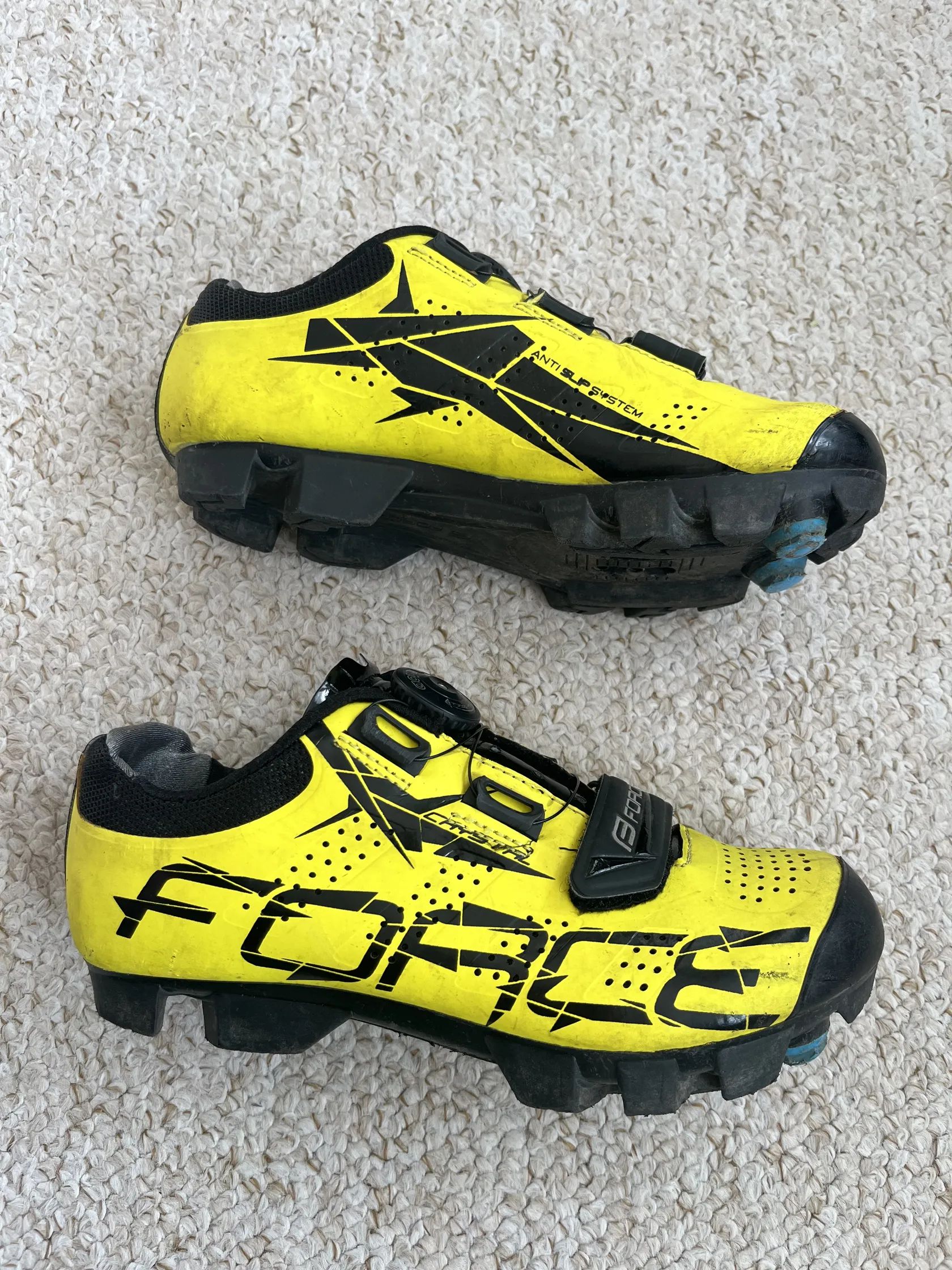 Prodám po jednom dítěti MTB tretry na kolo Force, vel. 36, 22,5 cm. Drobné oděrky na špičce, jinak vše funkční.