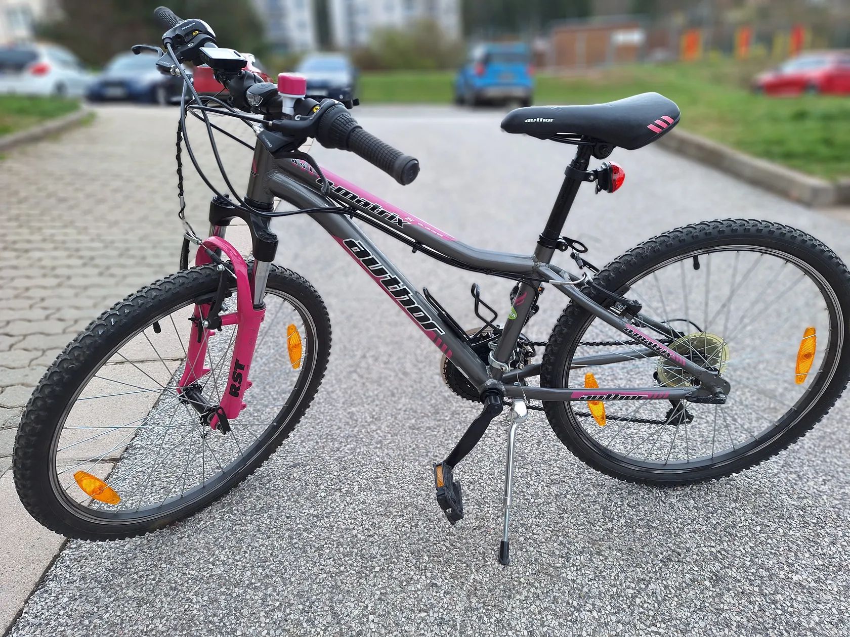 Prodám dětské jízdní kolo Author A-Matrix 24, barva stříbrná-růžová, včetně cyklopočítače, držáku na lahev a osvětlení.