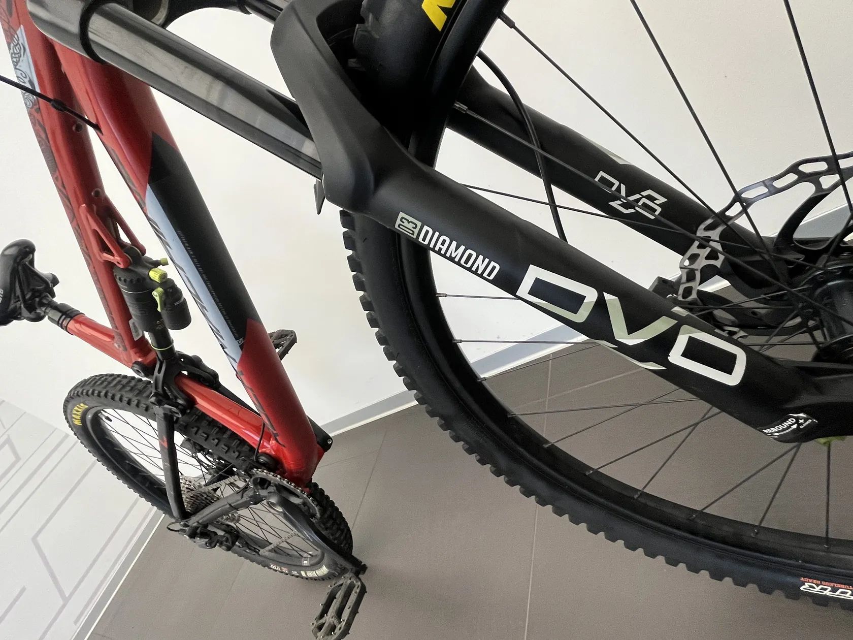 Podvozek: vzduchová vidlice DVO Diamond D3 150 mm + tlumič DVO Topaz T3Air 140 mm – kvalitní, laditelný trail/enduro set