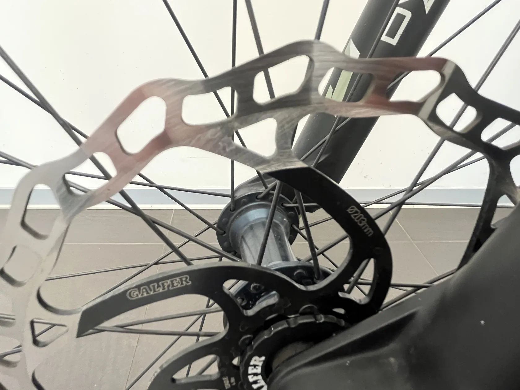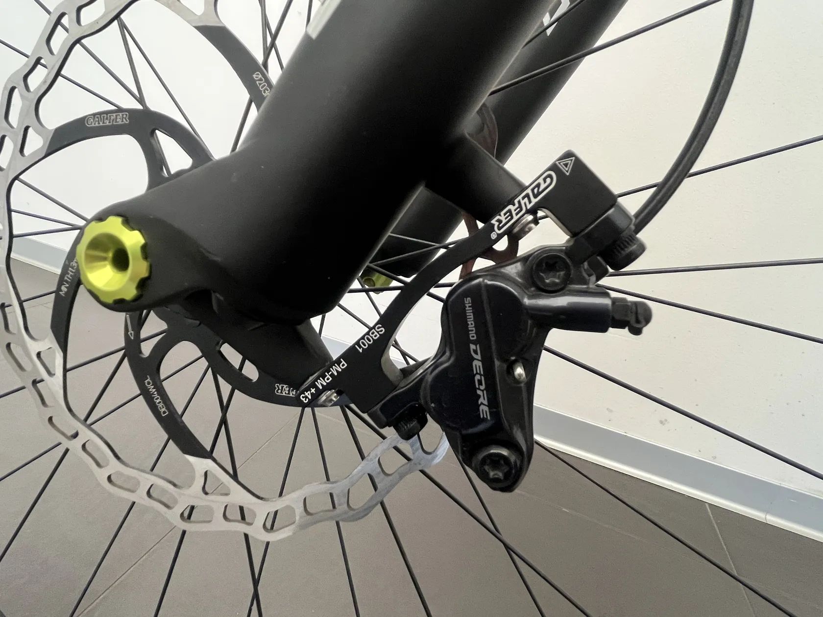 Brzdy: čtyřpístové Shimano M6120, nově osazené Galfer 203 mm + zelené destičky – silný brzdný výkon pro těžší terén