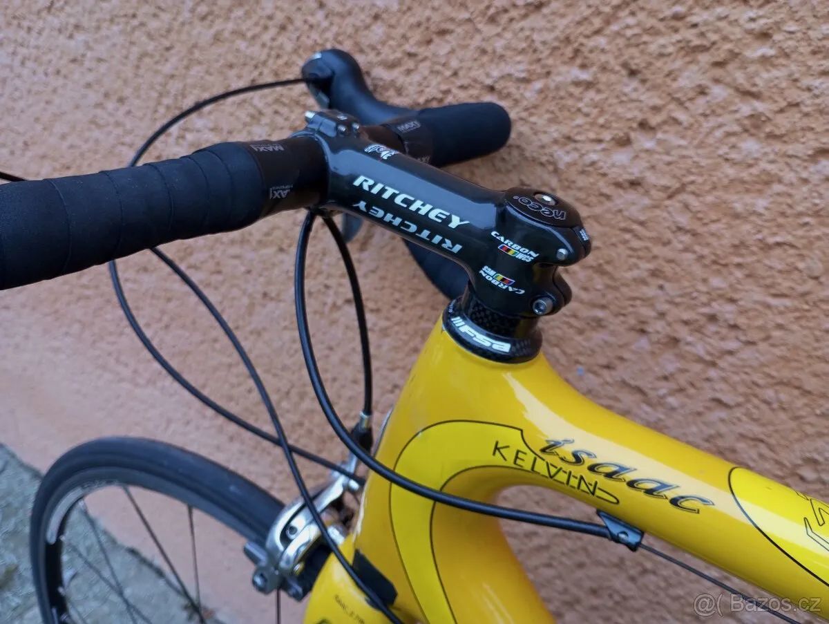 Závodní silniční karbonové kolo Isaac Kelvin ,vel. M (55,5 cm) na postavu 170 až 185 cm, komponenty: kompletní sada Shimano Ultegra, kola Mavic Axium Race (AL). Hmotnost 8,0 Kg (bez pedálů). Převody: 2 x 10 (50/32 + 23/12 z.) Na fotkách nastaveno na výšku 175 cm.