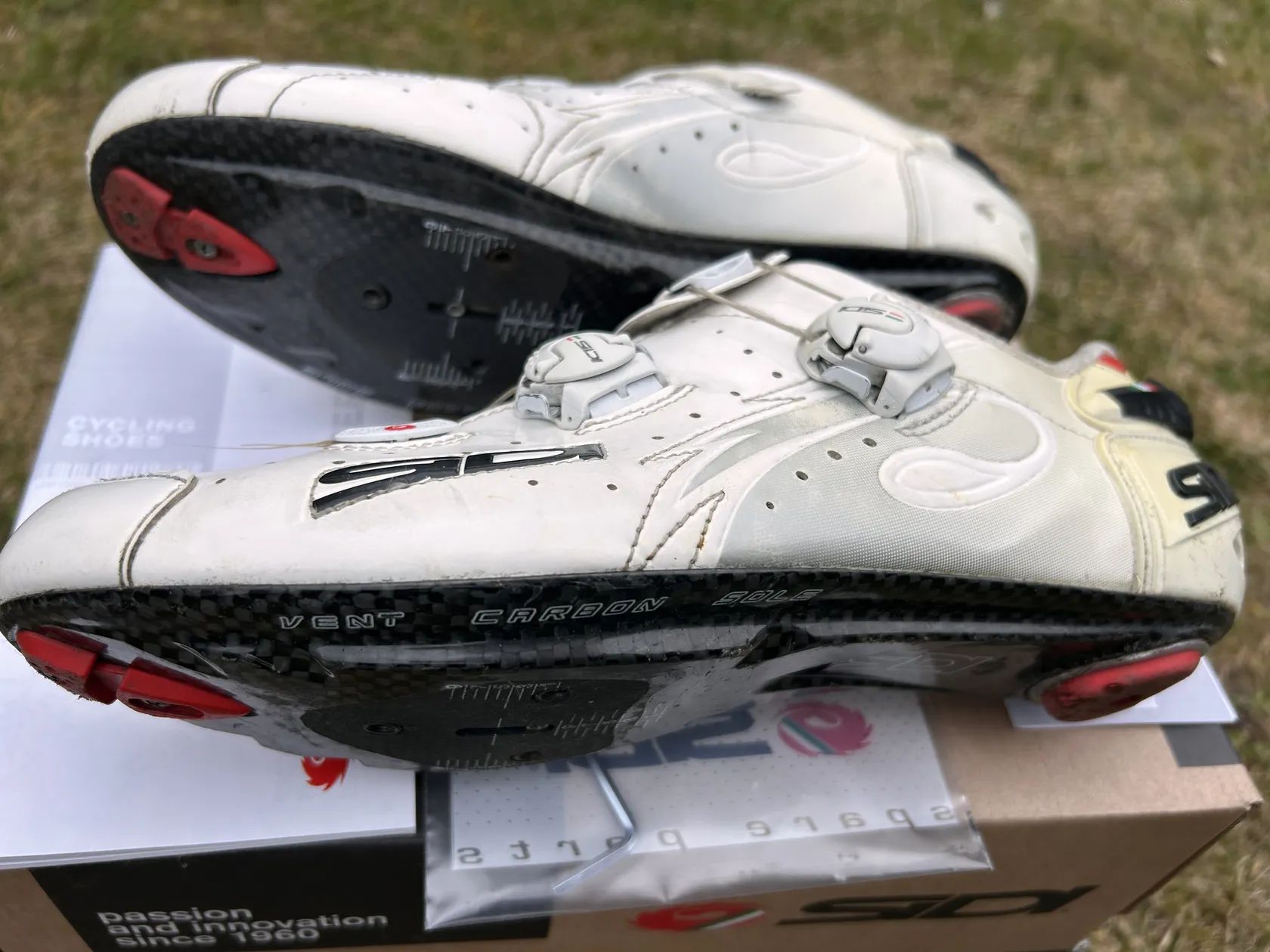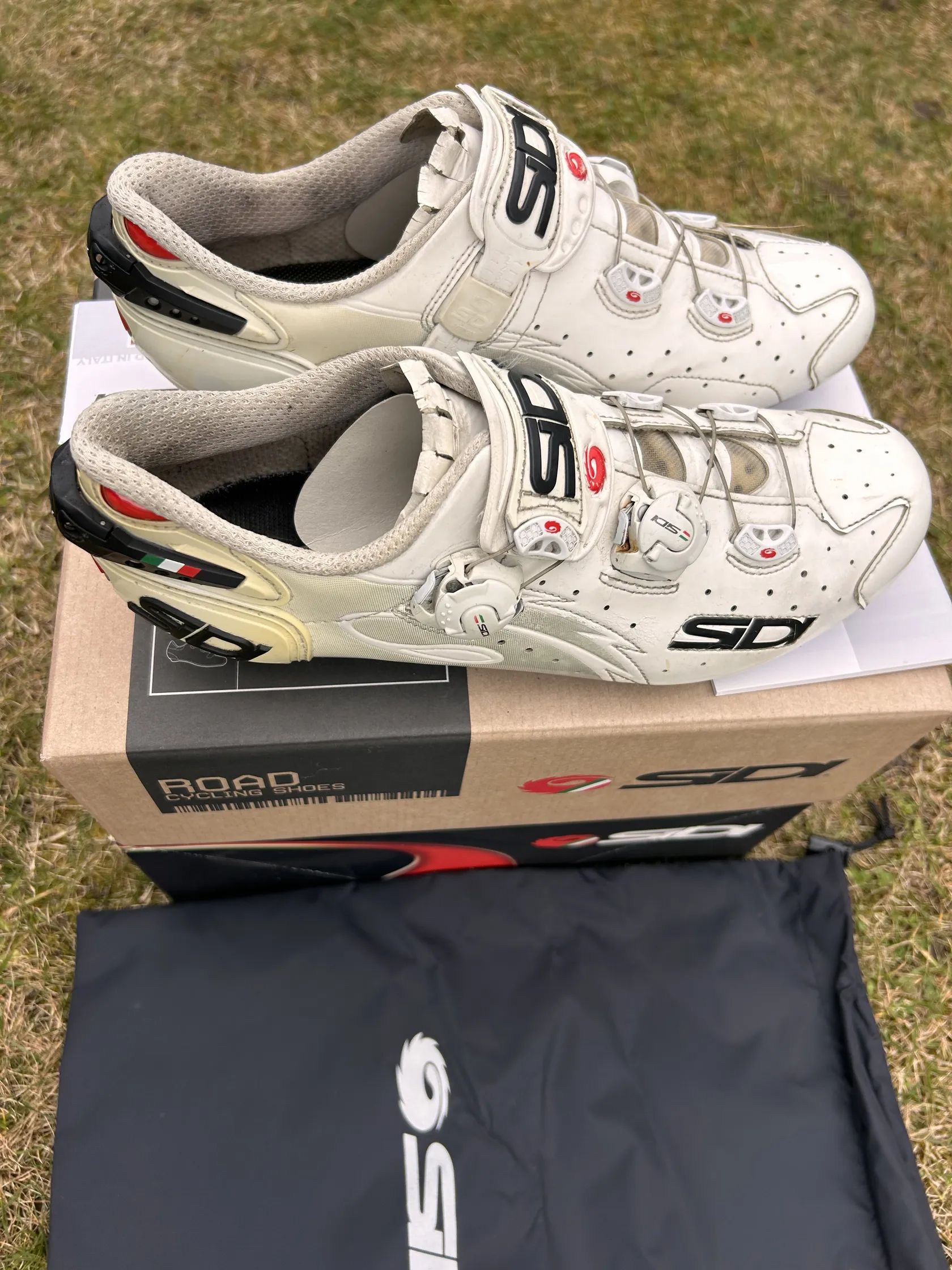 silniční tretry použité, ale zachovalé a plně finkční, velikost 43 3/4. Nyní mám sidi velikost 44 a jsou mi stejně.