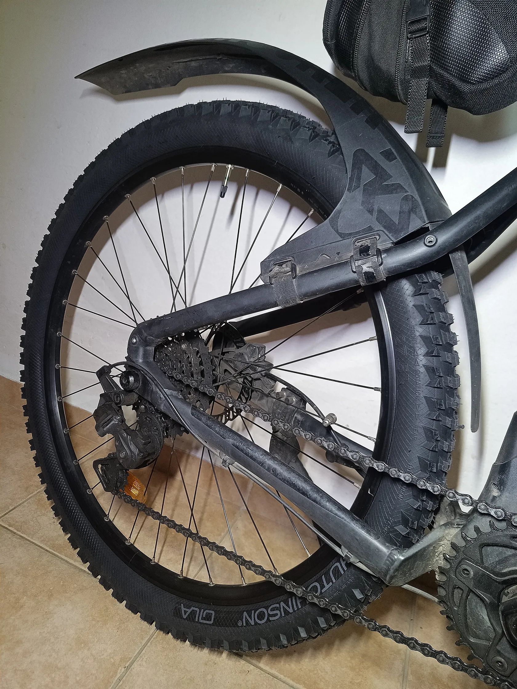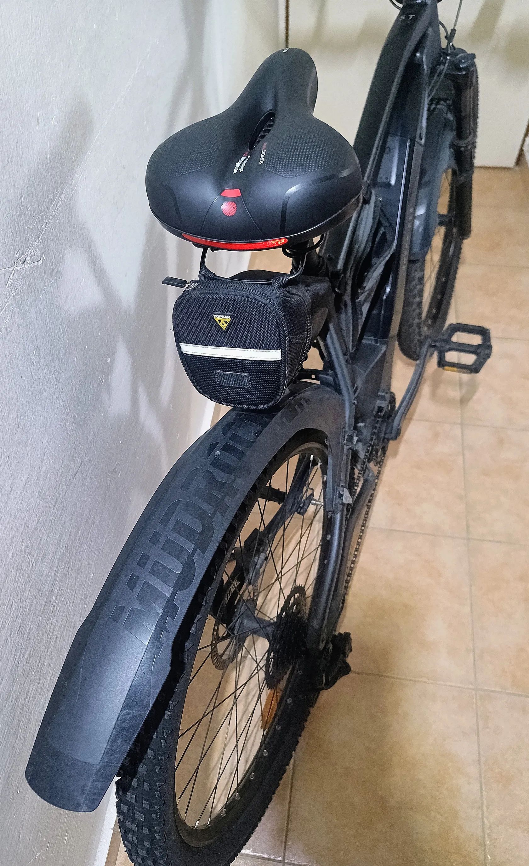 Bohatá praktická výbava: blatníky Mudrock, přední i zadní dobíjecí světla a blikačky, 2× zvonek, držák na láhev, brašna na rámu a pod sedlem, zpětné zrcátko