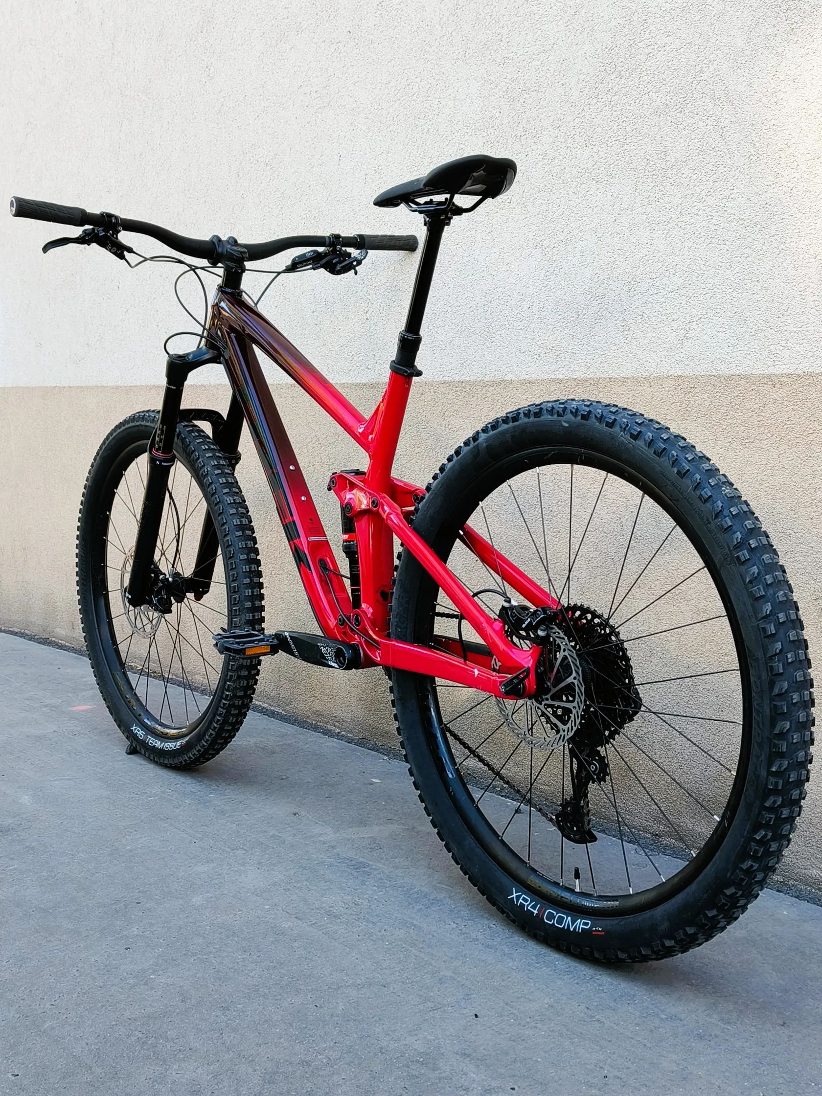 Prodám bytelný enduro bike Trek Slash 8 velikost L. Vhodné na postavu cca 174 - 187 cm, na fotkách seřízeno na cca 177 cm. Stav kola: Kolo bylo používané 2 sezóny, poté delší dobu stálo. Přední pneumatika stále původní z výroby, zadní před prodejem vyměněná za novou. Před prodejem byl proveden servis vidlice a tlumiče, byl dán nový řetěz a nové destičky vpředu i vzadu. Na rámu jsou pouze kosmetické vady, největší poškození laku je na zadní stavbě (viz foto), jedná se ale pouze o vady laku, nikoli o nějaké poškození rámu. Kolo je tuhé, bez vůlí, hezky řadí, brzdí, tlumí, připraveno na novou sezónu. Na kolo se zároveň vztahuje ode mě 12 měsíců záruka na případné skryté vady.