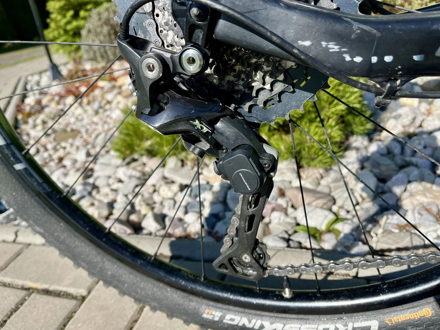 Pohon: novější Shimano Deore XT přehazovačka, kazeta Shimano SLX 11–46 – spolehlivý, přesný a dostatečně široký rozsah do kopců.