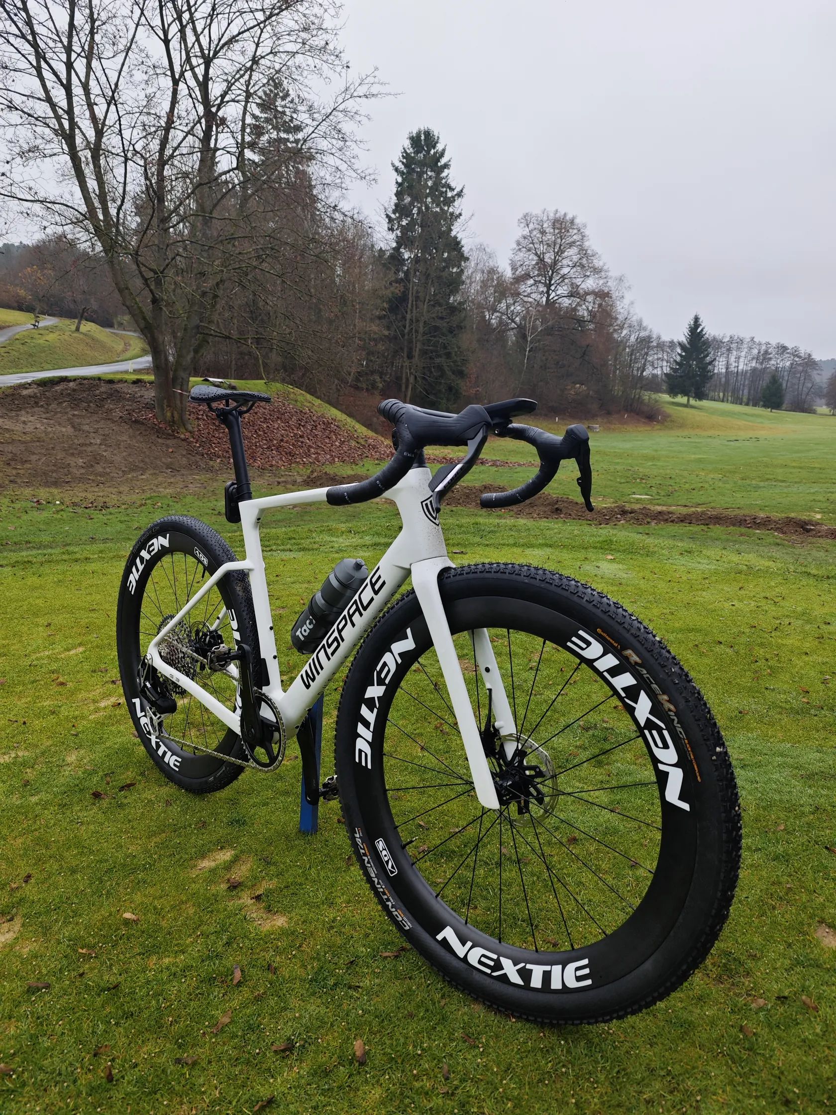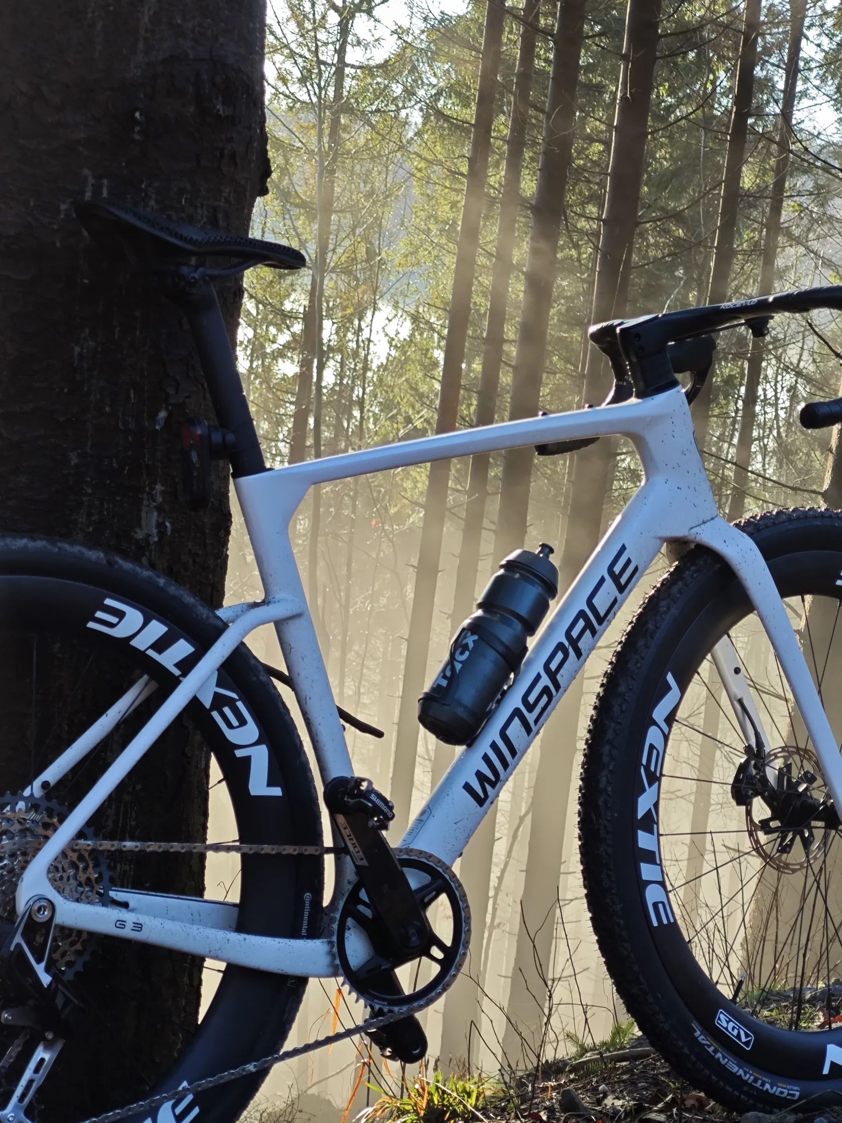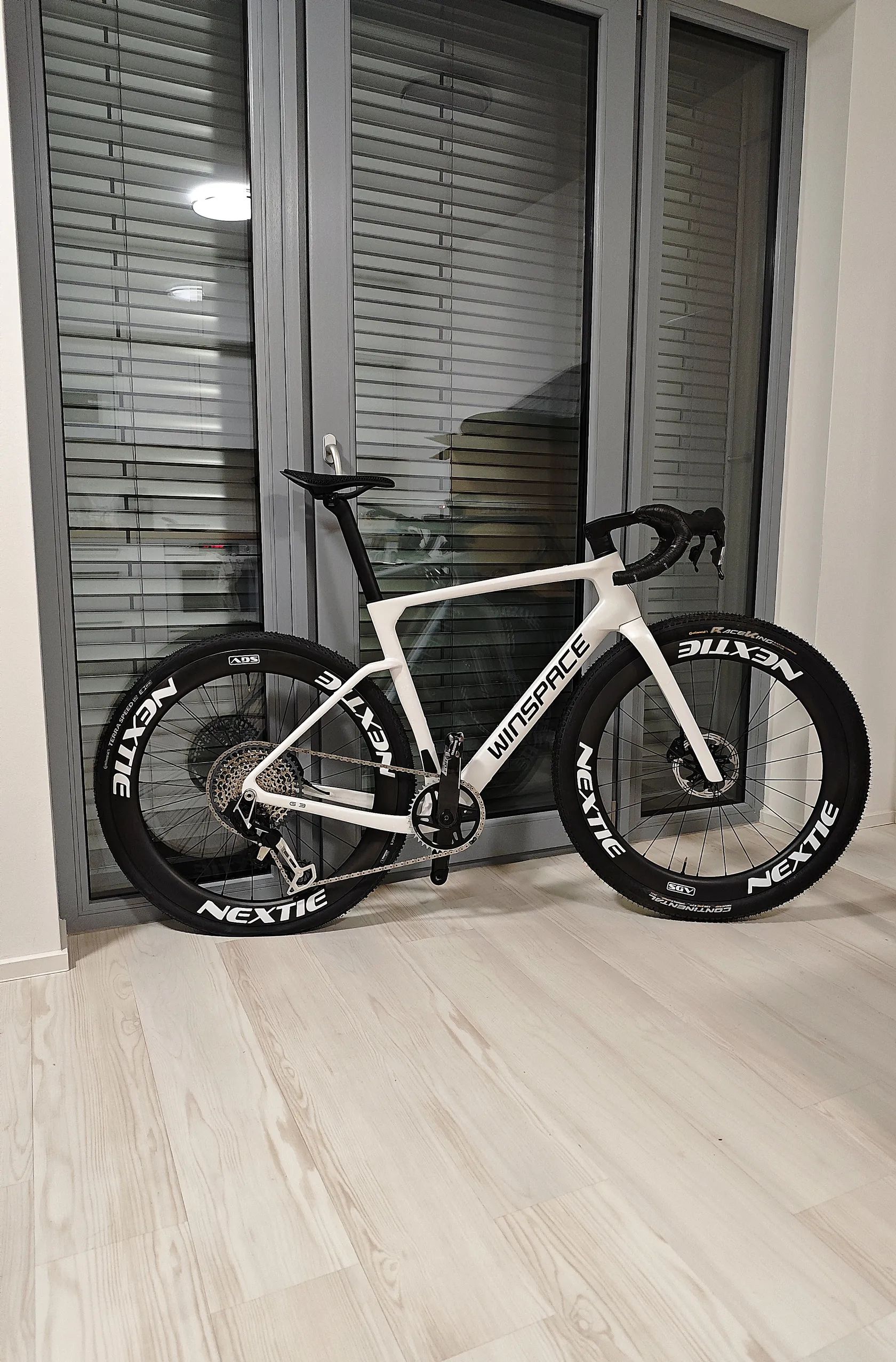 Dobrý den, prodávám gravel Winspace G3, nový model vydaný na konci roku 2025. Jedná se o špičkový aero gravel rám s možností až 50mm plášťů vzadu a 55mm ve předu. Gravel je osazen ráfky Nextie (1255g), jedná se o nejvyšší řadu supreme, model SGV NXT 54. Ráfky jsou 54mm hluboké s vnitřní šířkou 32mm. Náboje na keramických ložiscích, ratchet systém s 54 zuby zajistí skvělí zvuk a okamžitou odezvu na šlápnutí. Přehazovačka: SRAM XX AXS transmission Řazení: SRAM Force AXS (nejnovější model s tlačítky) Kliky: SRAM Force xplr s wattmetrem. Kolo má karbonové sedátko i řidítka. Brzdy jsou plně integrované, hadičky tedy nejsou vidět a řazení je elektronické/bezdrátové. Kolo váží cca 7,4 kg. Kolo je postavené s důrazem na aerodynamiku ale zároveň je možné s ním jezdit i v těžším terénu díky možnosti širokých plášťů, ty jsou na kole nyní nasazeny. Ve předu Conti raceking protection, nejrychlejší plášť se šířkou 2.2 palců na trhu. V zadu je Conti Terra speed. Spolu s širokými a vysokými ráfky maximalizují aerodynamiku, při jízdě po asfaltu jede skoro stejně jako silniční kolo. Při jízdě v terénu se nemusíte bát to pustit, pláště jsou dost široké aby dostatečně tlumily nerovnosti.