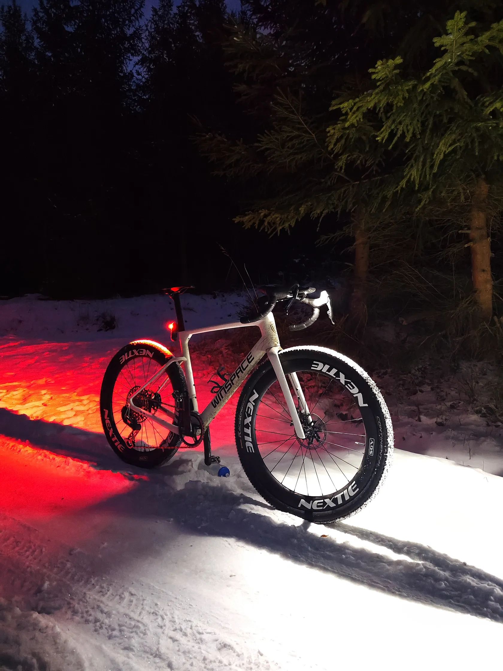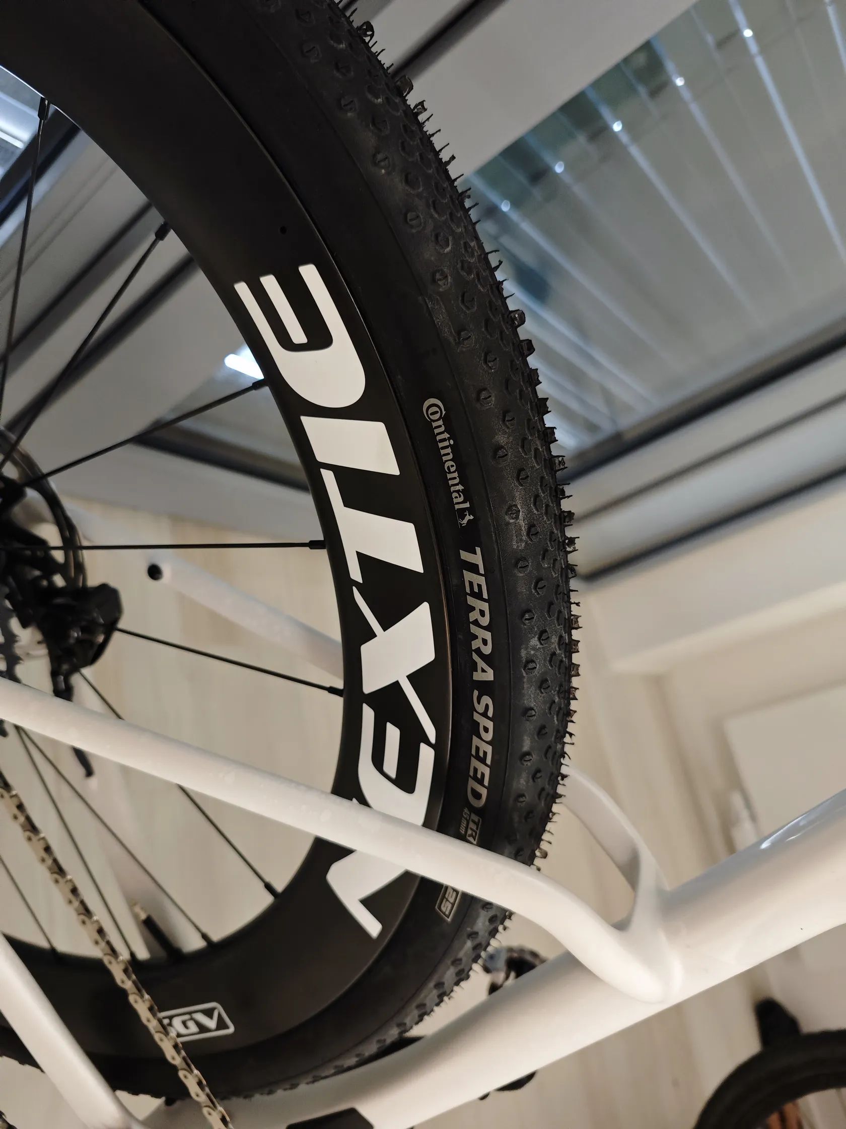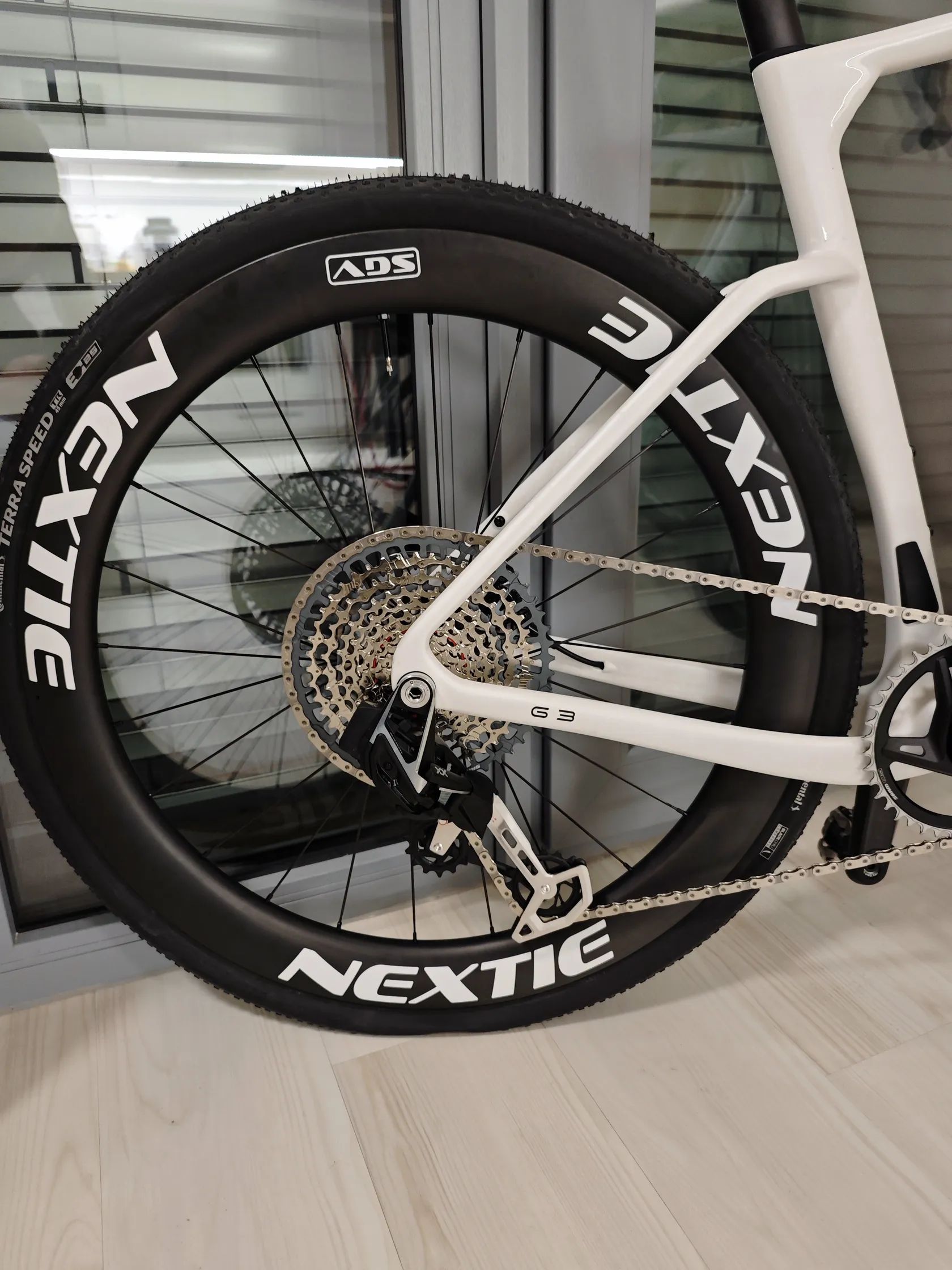 Dobrý den, prodávám gravel Winspace G3, nový model vydaný na konci roku 2025. Jedná se o špičkový aero gravel rám s možností až 50mm plášťů vzadu a 55mm ve předu. Gravel je osazen ráfky Nextie (1255g), jedná se o nejvyšší řadu supreme, model SGV NXT 54. Ráfky jsou 54mm hluboké s vnitřní šířkou 32mm. Náboje na keramických ložiscích, ratchet systém s 54 zuby zajistí skvělí zvuk a okamžitou odezvu na šlápnutí. Přehazovačka: SRAM XX AXS transmission Řazení: SRAM Force AXS (nejnovější model s tlačítky) Kliky: SRAM Force xplr s wattmetrem. Kolo má karbonové sedátko i řidítka. Brzdy jsou plně integrované, hadičky tedy nejsou vidět a řazení je elektronické/bezdrátové. Kolo váží cca 7,4 kg. Kolo je postavené s důrazem na aerodynamiku ale zároveň je možné s ním jezdit i v těžším terénu díky možnosti širokých plášťů, ty jsou na kole nyní nasazeny. Ve předu Conti raceking protection, nejrychlejší plášť se šířkou 2.2 palců na trhu. V zadu je Conti Terra speed. Spolu s širokými a vysokými ráfky maximalizují aerodynamiku, při jízdě po asfaltu jede skoro stejně jako silniční kolo. Při jízdě v terénu se nemusíte bát to pustit, pláště jsou dost široké aby dostatečně tlumily nerovnosti.