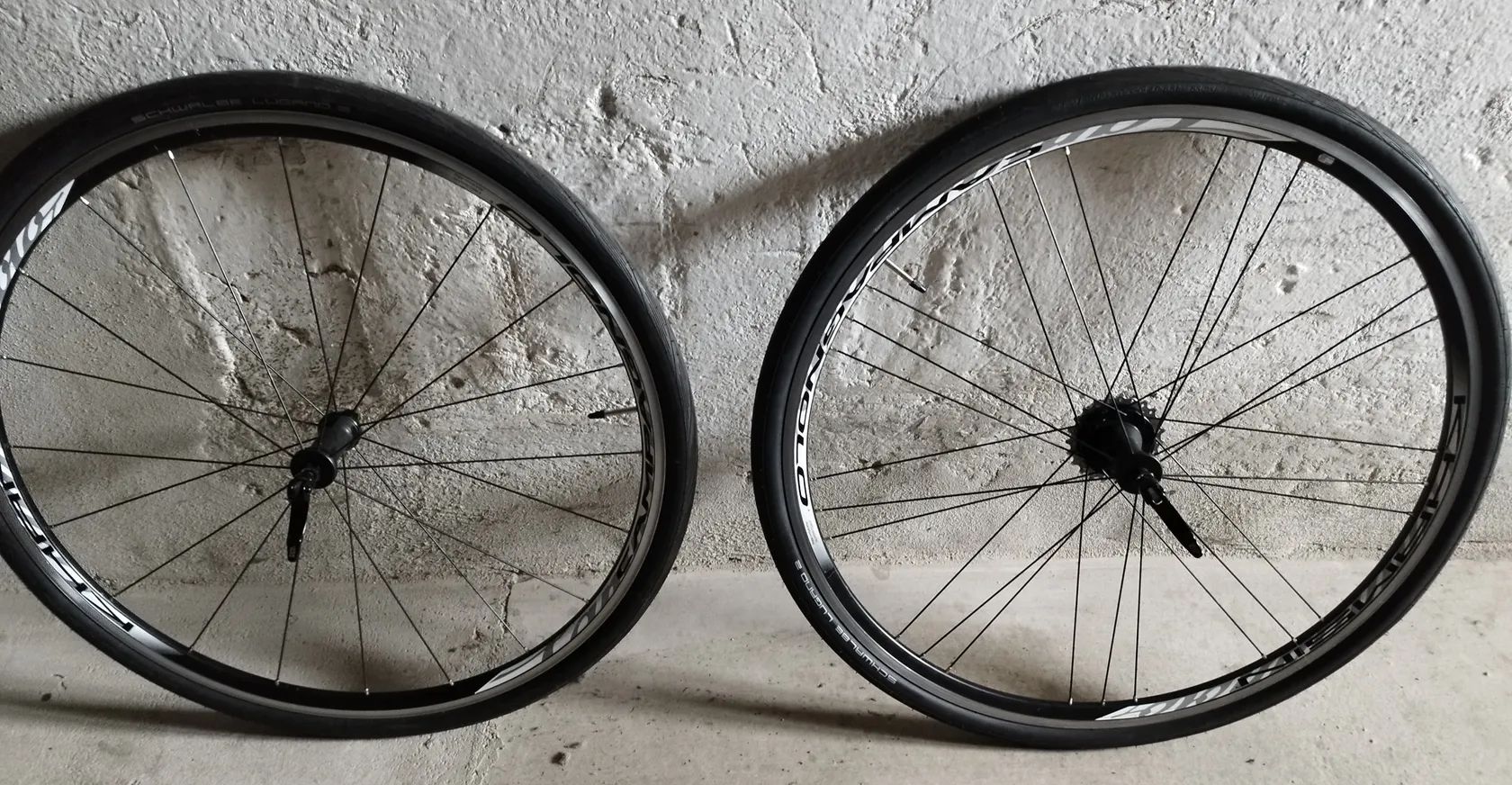 Prodám zapletená silniční kola Campagnolo Khamsin s kazetou Campagnolo Veloce 12-23 10 speed a plášti Schwalbe Lugano 700x32