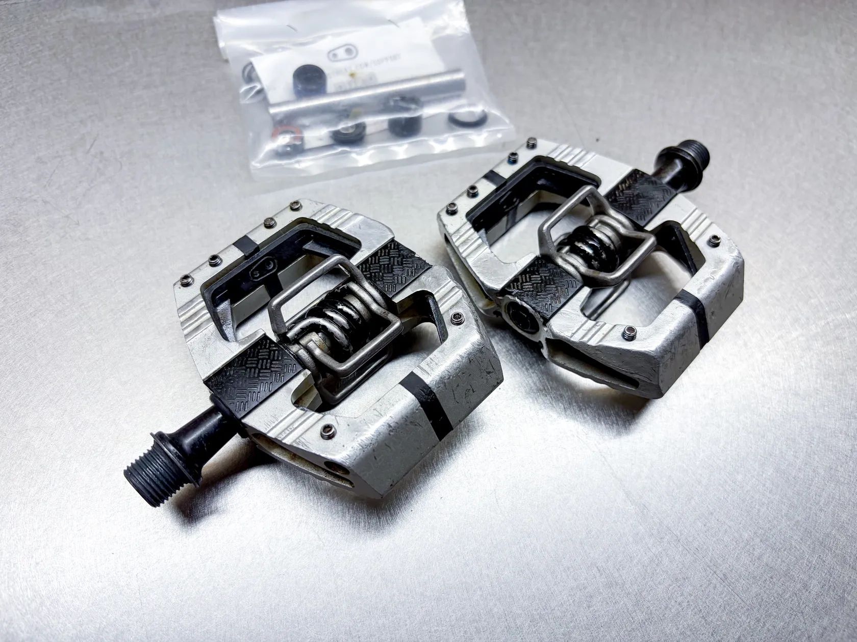 Prodám použité pedály Crankbrothers Mallet E LS Silver. Pedály jsou plně funkční, mají běžné kosmetické známky používání, bez vlivu na funkci. Součástí je sada náhradních ložisek.