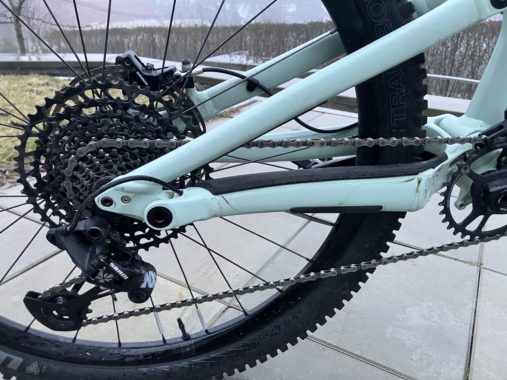 Obuty jednu sezonu ježděné pláště WTB (přední Vigilate 29 x 2,5; zadní Trail boss 27,5 x 2,4) - bezdušové provedení. V průběhu léta nové pohodlné gripy ESI a servis brzd včetně nových destiček. Servis pružení léto 2024. Na kole je na přední vidlici, klikách a zadní stavbě starší ochranná folie. Na rámu jsem měl v plánu dávat novou. Na rámu minimální kosmetické vady, až na dvě místa - u převodníku po spadnutí řetězu a u zadního kotouče. Viz foto.
