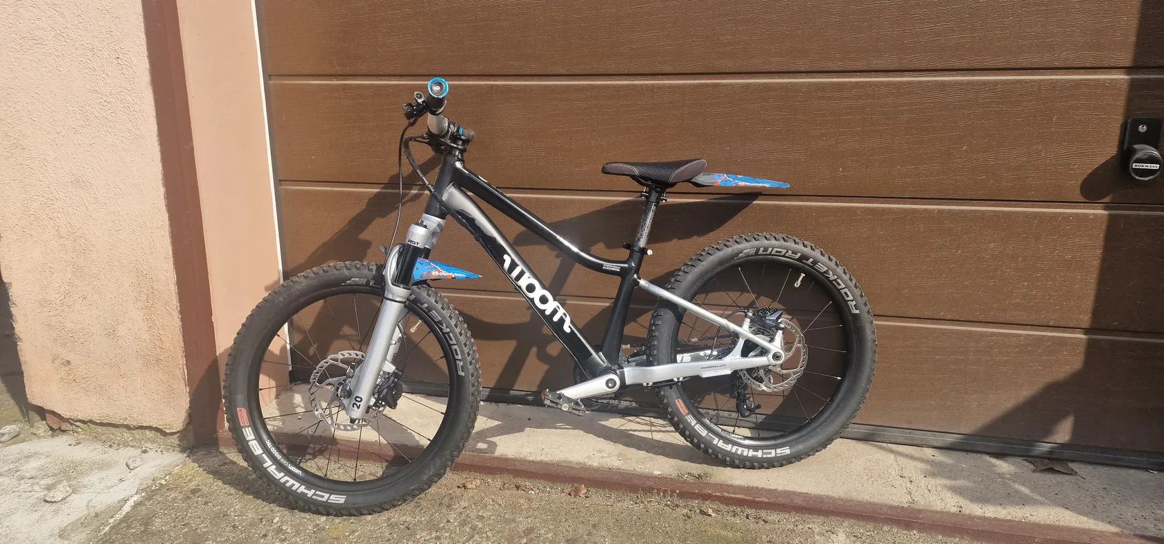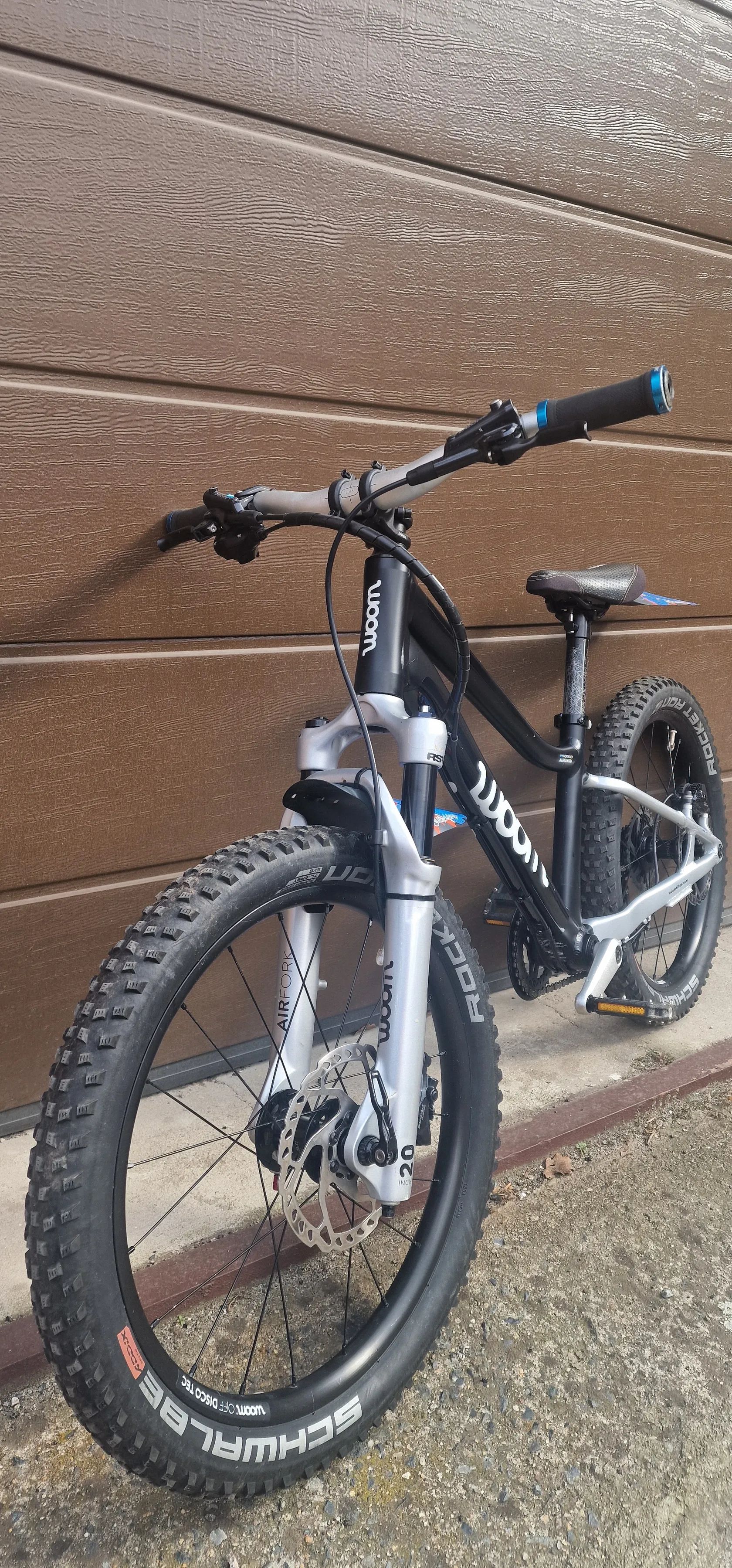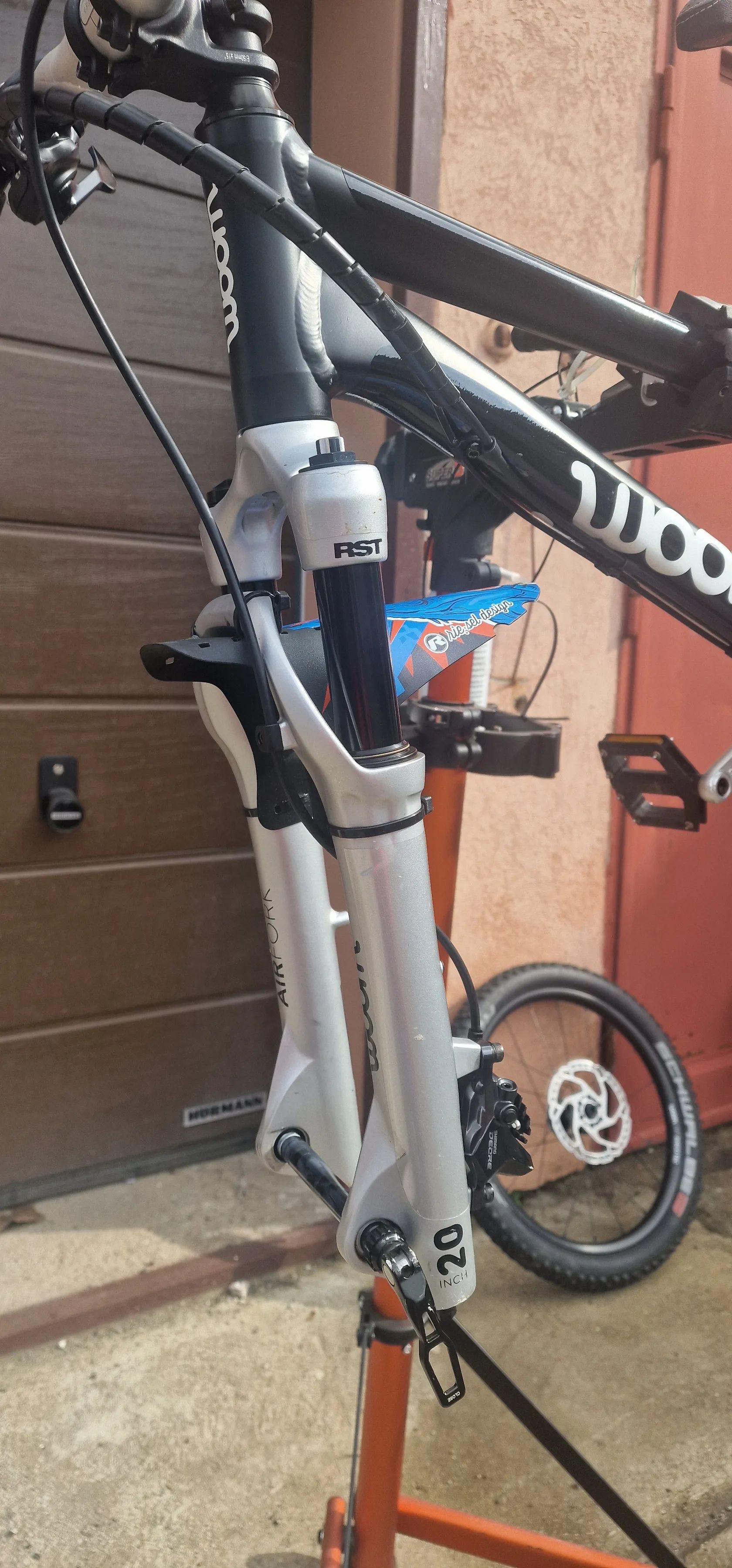 Zustalo nam tu paradni detske kolo Woom 4 Off Air (20" kola). Je to paradni stroj pro maly strelce. Vidlice je RST 80mm zdvih se stelovatelnou kompresi a odskokem (vse funguje). Kolo je v tovarnim vybaveni. Jedine co je jine jsou brzdy, kde jsem menil za Shimano Deore BR-M6100 a 160mm kotouce, protoze puvodni tektra porad tekly. Razeni je kompletne na SRAMu.