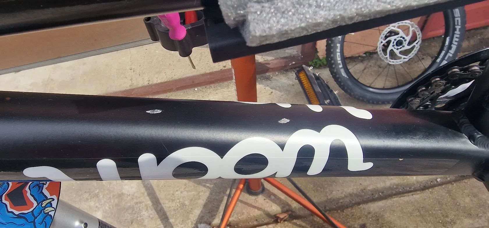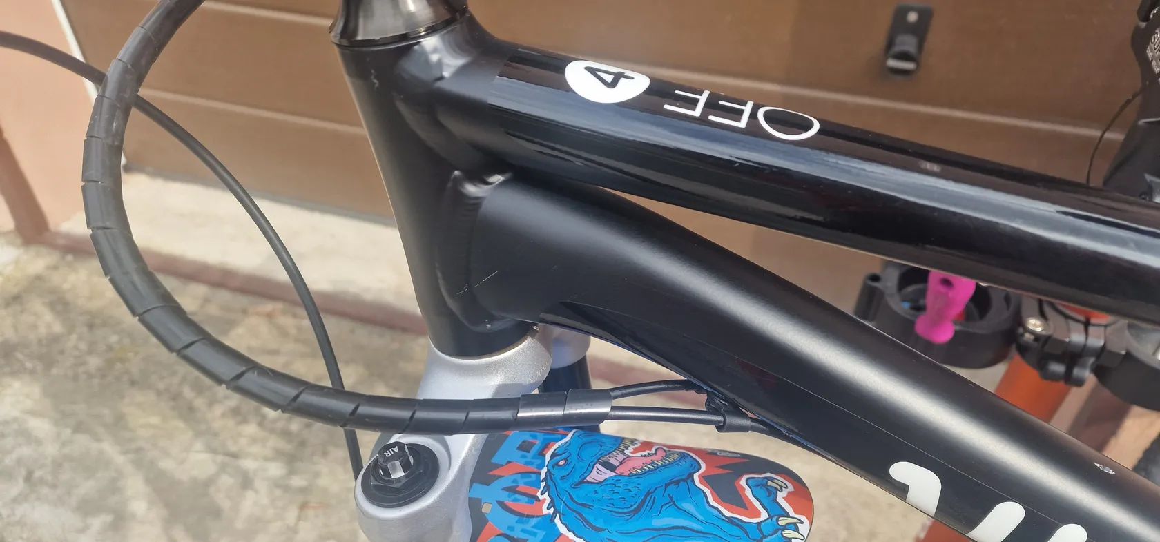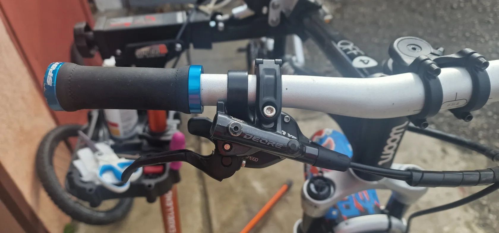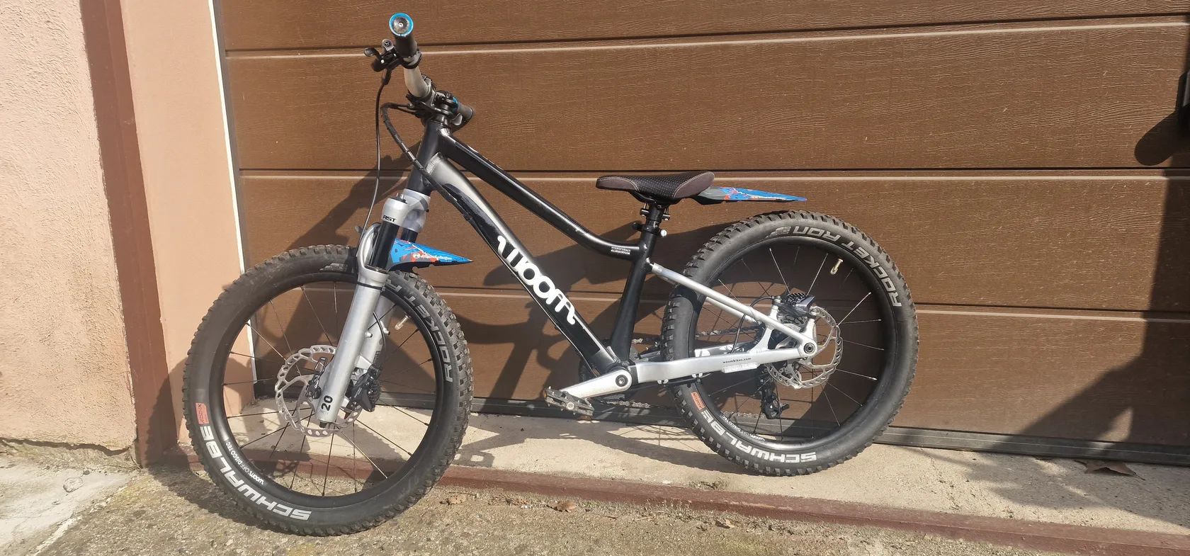 Zustalo nam tu paradni detske kolo Woom 4 Off Air (20" kola). Je to paradni stroj pro maly strelce. Vidlice je RST 80mm zdvih se stelovatelnou kompresi a odskokem (vse funguje). Kolo je v tovarnim vybaveni. Jedine co je jine jsou brzdy, kde jsem menil za Shimano Deore BR-M6100 a 160mm kotouce, protoze puvodni tektra porad tekly. Razeni je kompletne na SRAMu.