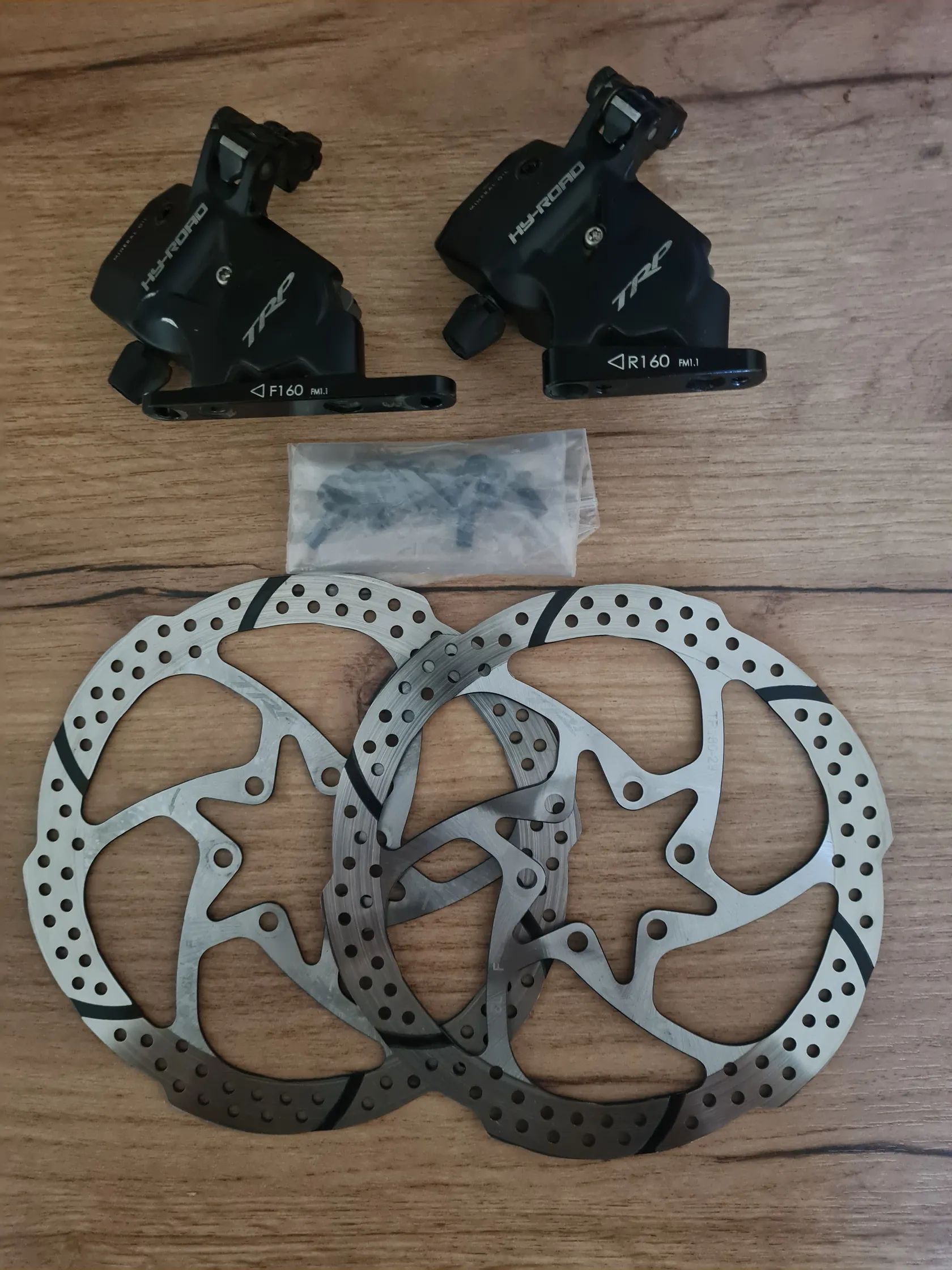 Set brzd přední/zadní, včetně FM adaptérů na 160mm, originálních kotoučů 160mm včetně šroubů. Brzdy jsou v dobrém stavu, plně funkční, nové desky. Kotouče bez vad, minimálně použité. Mozno i se základními silničními koly pro kotoučové brzdy, pevné osy, TL ready, HG shimano Road ořech (8-12 sp. ) + 600. Mozno místo 6děr TRP kotoučů přiložit SM-RT54 CL kotouče, včetně závěrných matic.