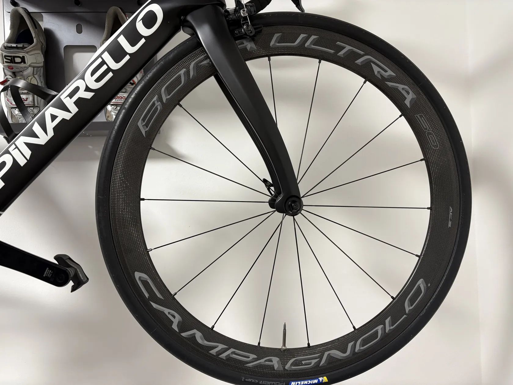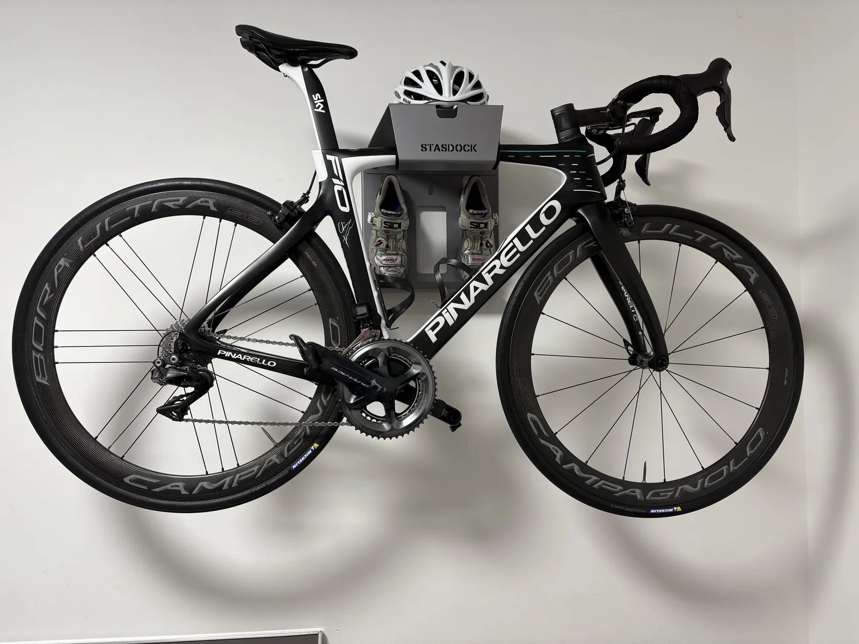 Prodám kolo Pinarello F10 Team Sky, kolo koupeno v r. 2021 v Trevisu, kolo bylo celou dobu pravidelně servisováno, celkový stav je perfektní, výbava je Shimano duraAce 9100 di2, převodníky 52/36 , kazeta 11/28,kola campagnolo Bóra ultra 50,(bez jediného škrábance) sedlo, řídítka -Most, kolo je podepsané Chrisem Froomem , jo a velikost je 53 ,