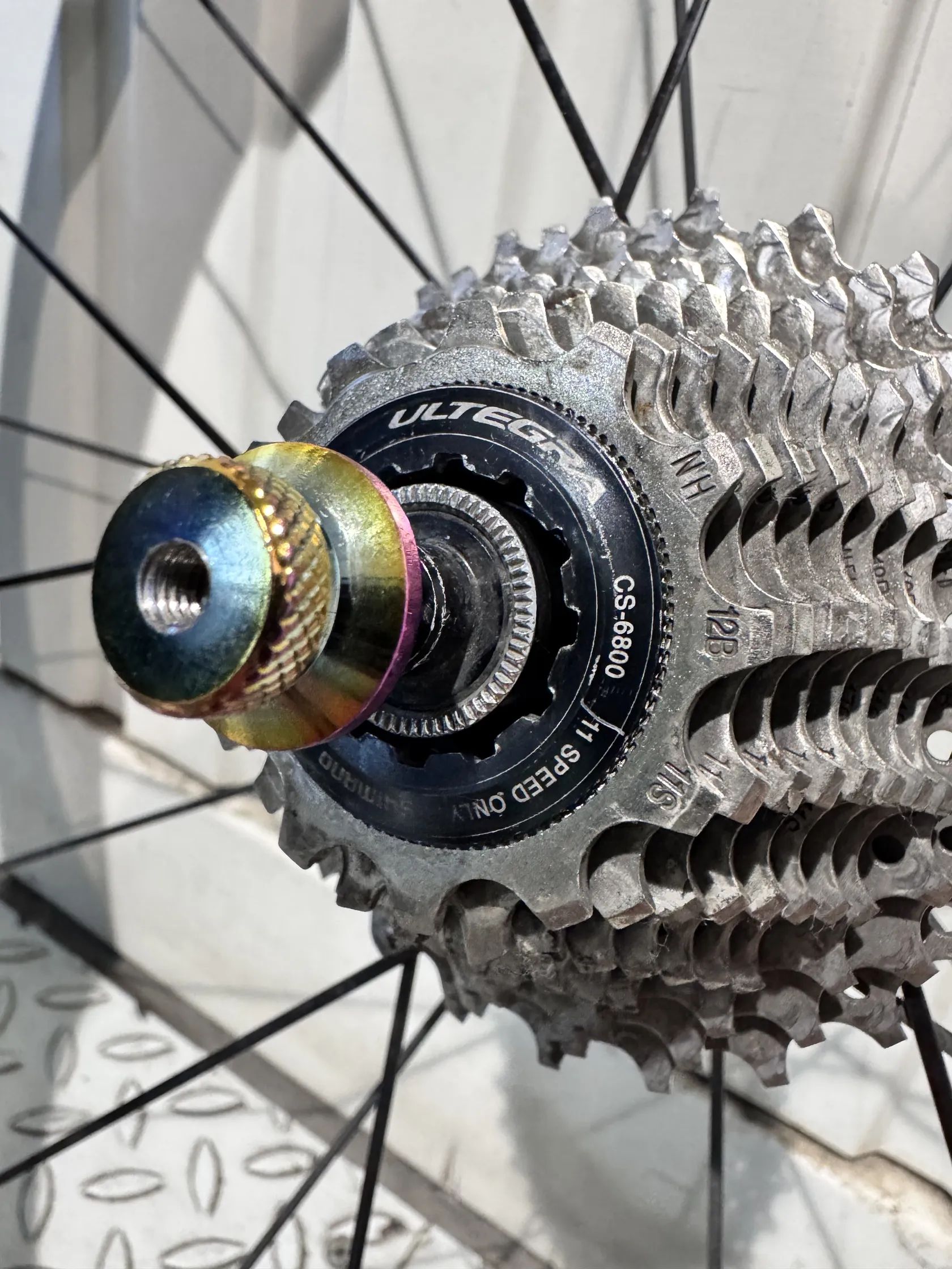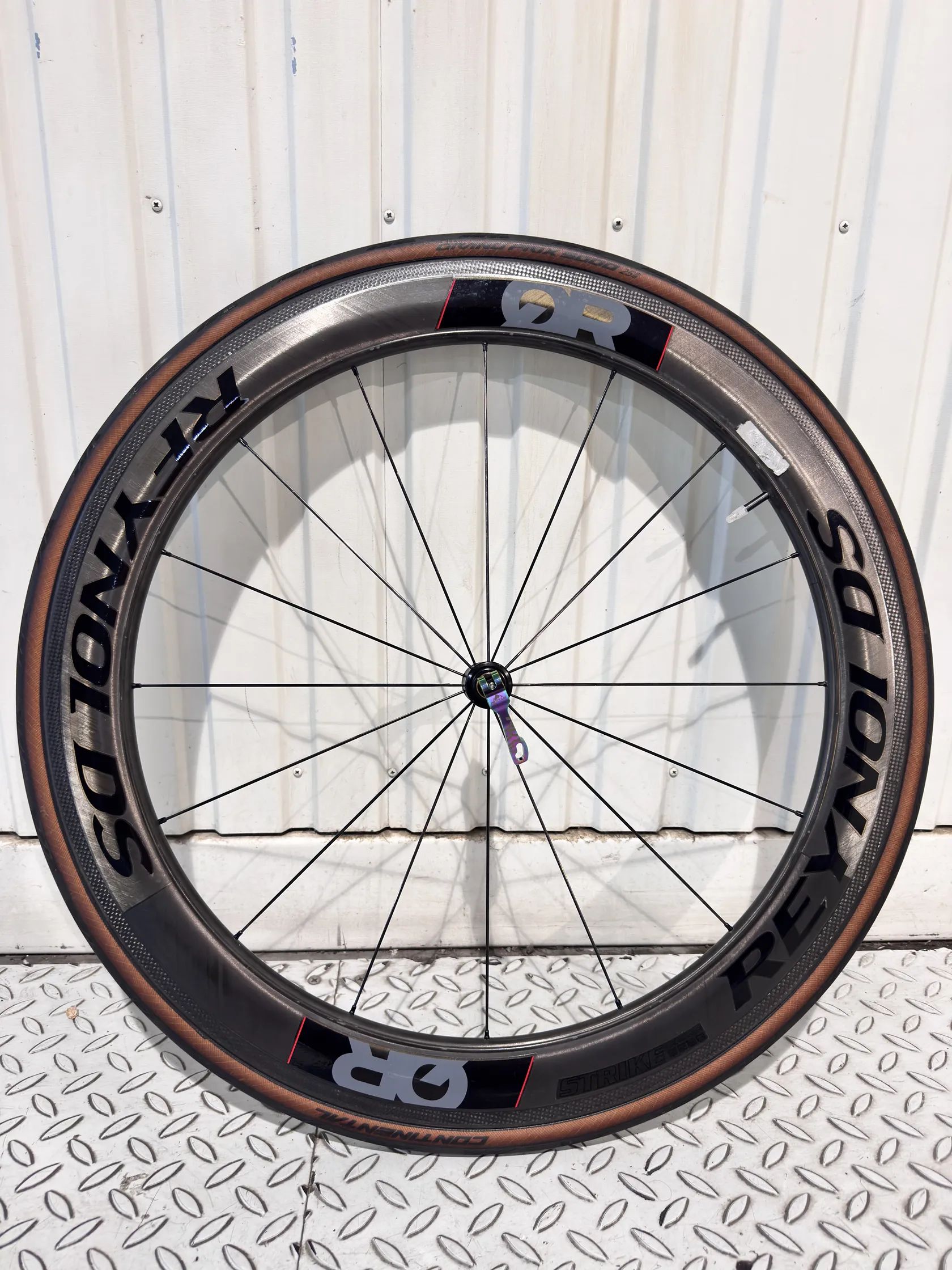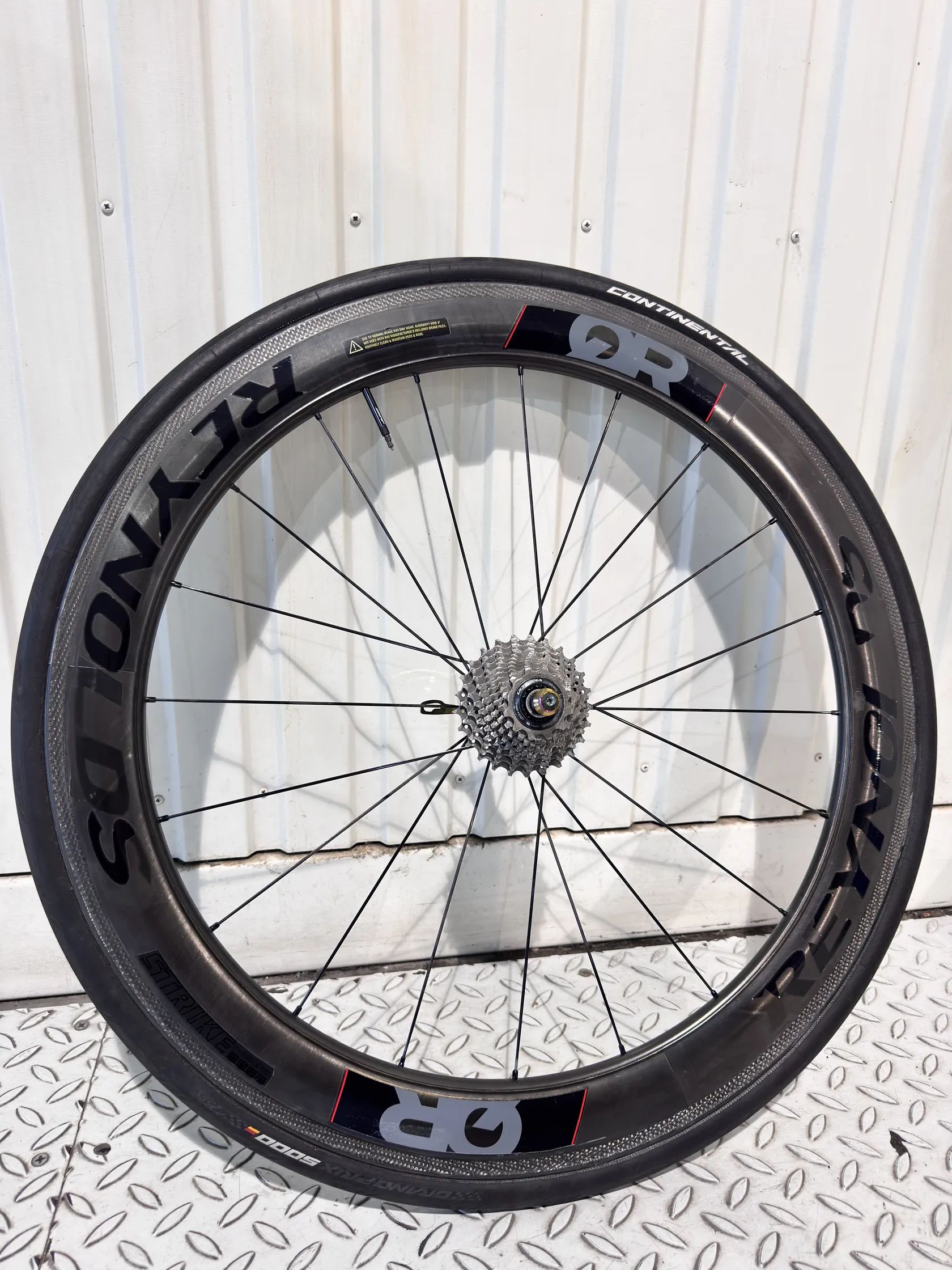 Karbonová kola značky Raynolds. Obuté na pláštích Continental 5000, zadní kolo 28mm, přední 25mm. Kazeta Shimano Ultegra 11s. Zadní kolo prodělalo drobnou opravu.