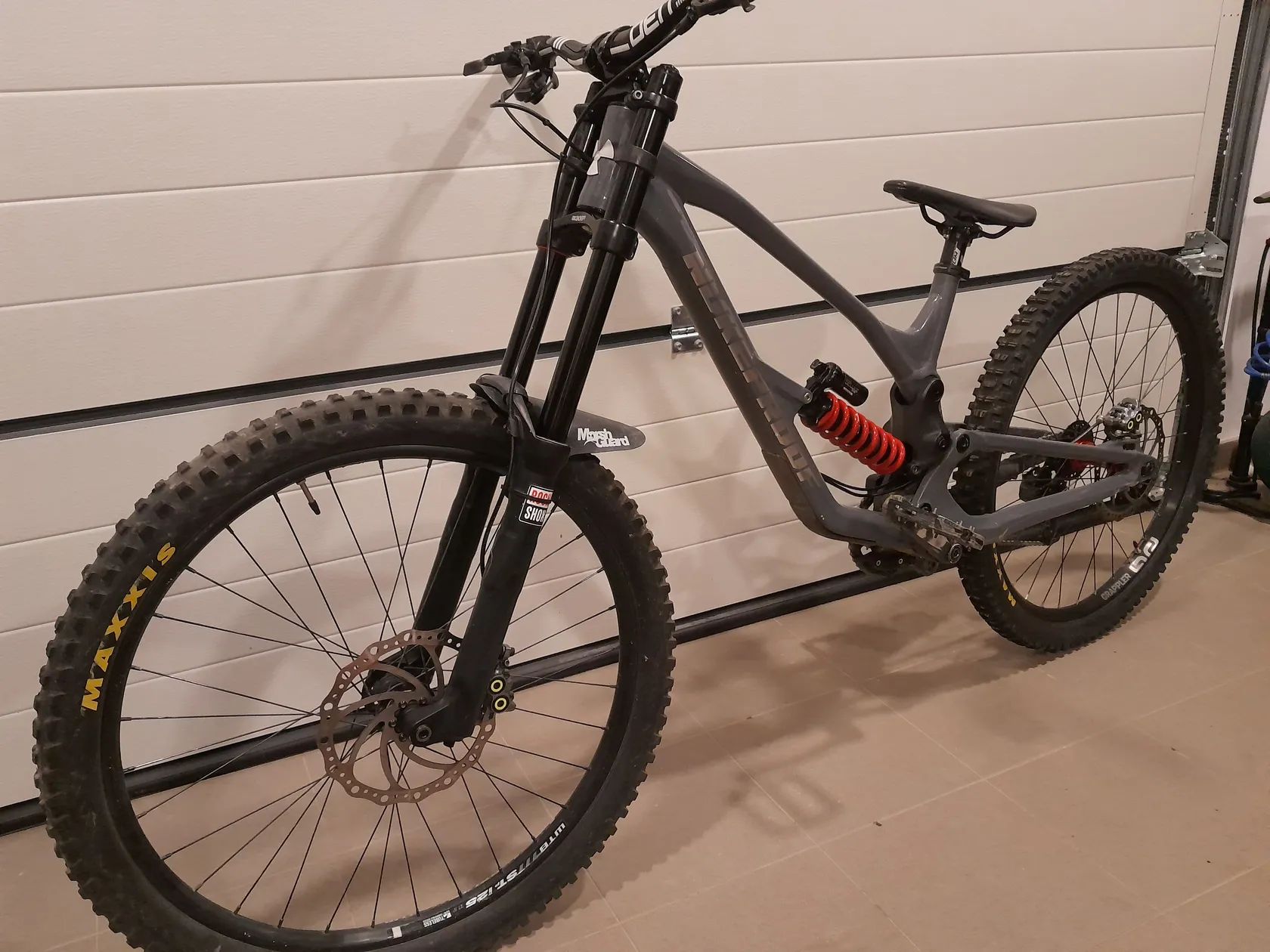 Prodávám tenhle DH bajk, Velice pěkný, je pod folií, pouze pár oděrek, velikost L. Součástí je náhradní patka i sada na změnu geometrie-zadní osy i tlumiče. Brzdy MAGURA MT7 pro - 4pístky s kotouči 203mm-1balení desek GALFER k tomu Řazení SRAM GX7, řídítka DEITY BG800 s představcem a gripy Nukeproof, Napínák řetězu E13 Tlumič Rock Shox Super deluxe Ultimate-regulace komprese a odskoku, pružina 450lb. Vidlice Rock shox Boxxer, zdvih 200mm-regulace odskoku, komprese. Gumy mají vzorek tak 80%.