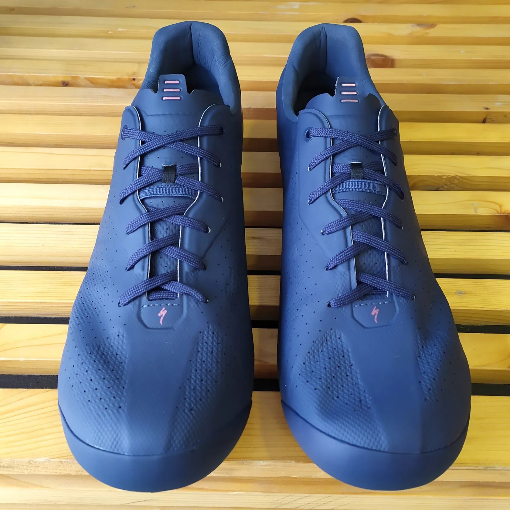 Tretry jsou ve 100% stavu, pouze opatrně vyzkoušeny na koberci. Barva je tmavě modrá (dark navy) s měděnými akcenty.