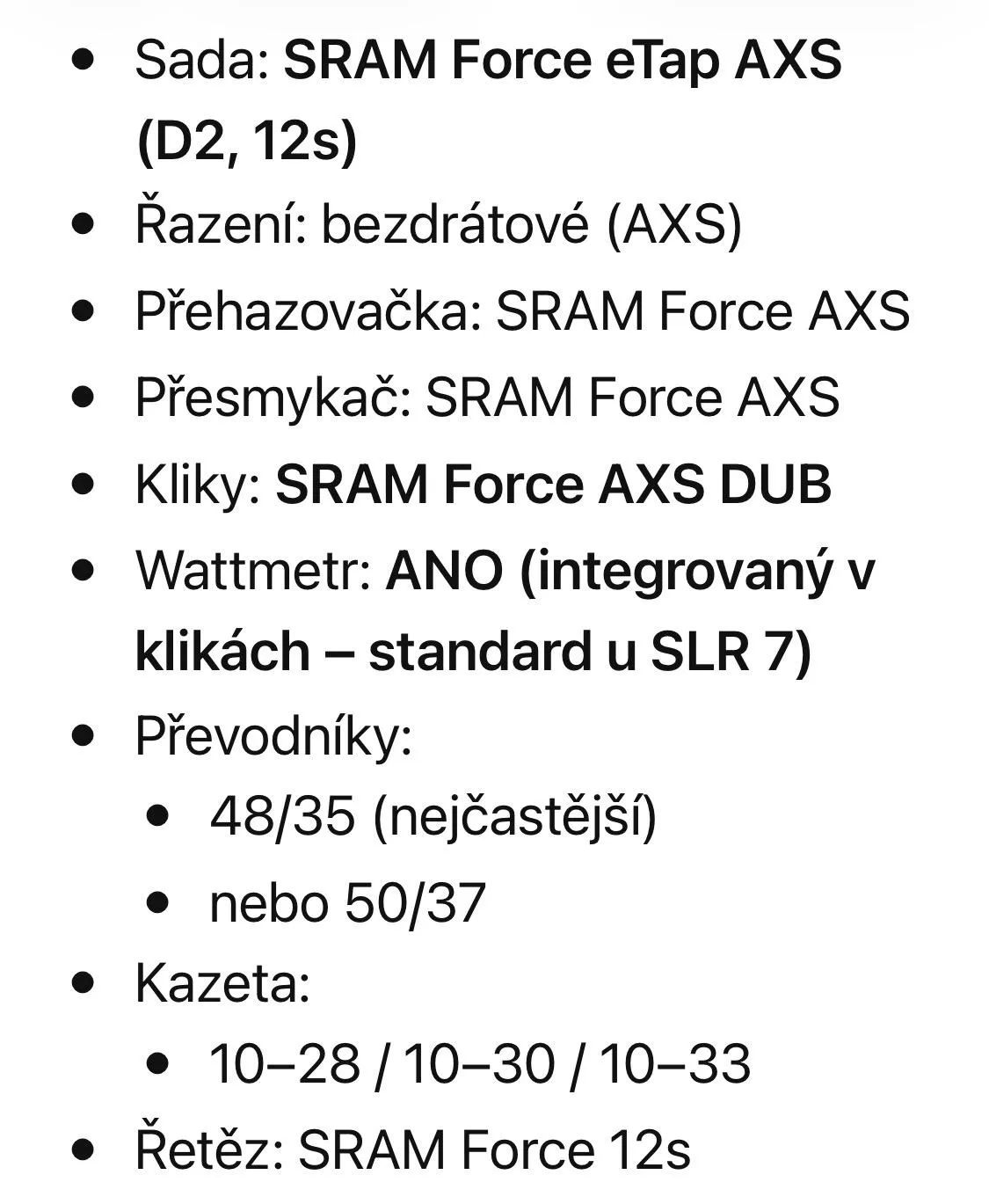 Použití: pro jezdce hledající rychlé, špičkové závodní aero kolo s elektronickým řazením a wattmetrem