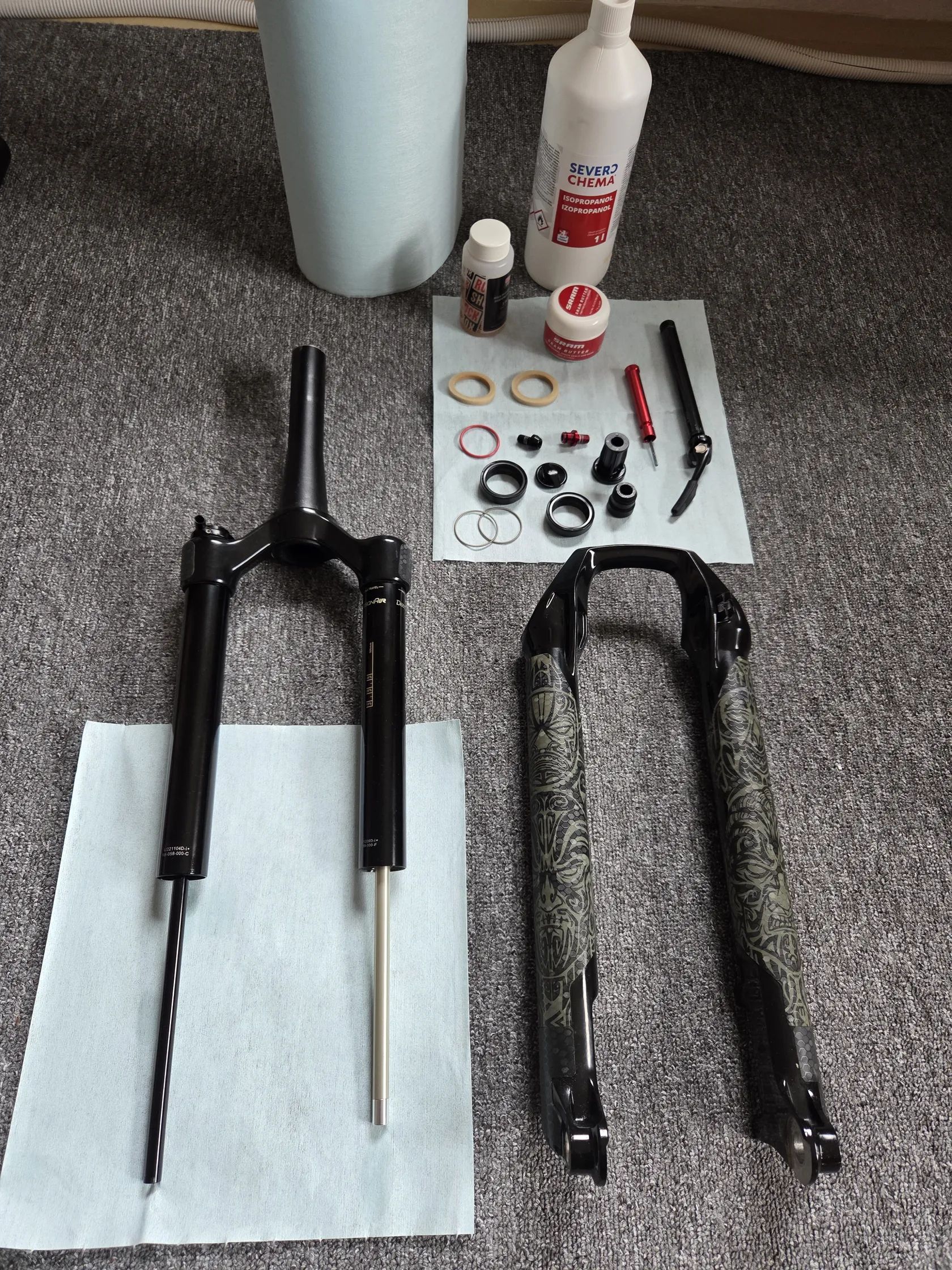 Krk (sloupek): Tapered, délka 16,5 cm. Stav: Kluzáky 100%, bez vaklu, spodní nohy od novoty v ochranné fólii Riesel Design TAPE 3000 (Maori). Servis: Čerstvě po malém servisu spodních noh (čištění isopropanolem, nový olej 3WT, gufera Sram Butter). Mám fotodokumentaci z průběhu servisu. Příslušenství: Včetně páčky dálkového ovládání OneLoc (levá horní) – páčka má drobné kosmetické škrábnutí, jinak 100% funkční. Bez lanka a bowdenu. S/N: 06T31166673.