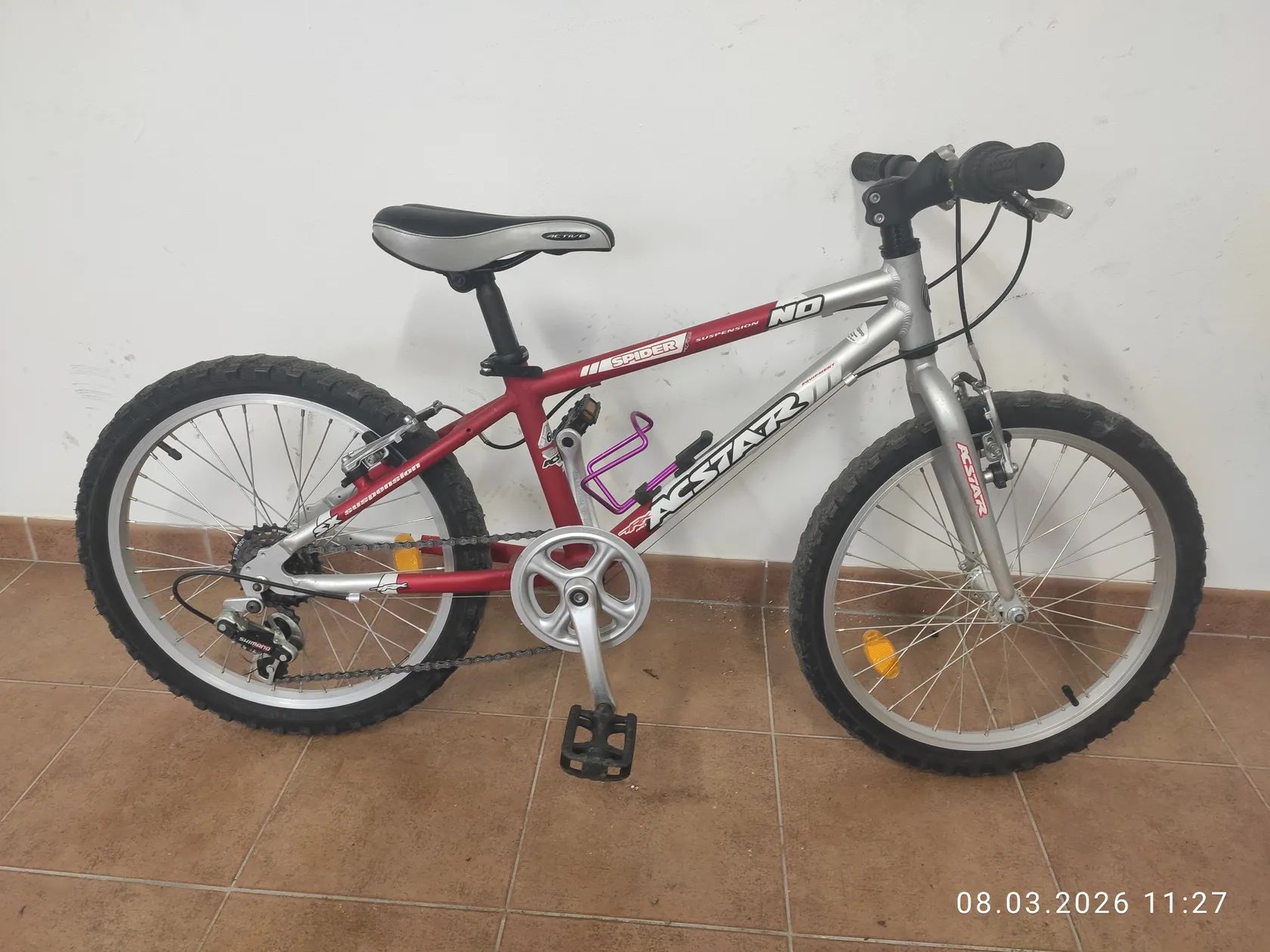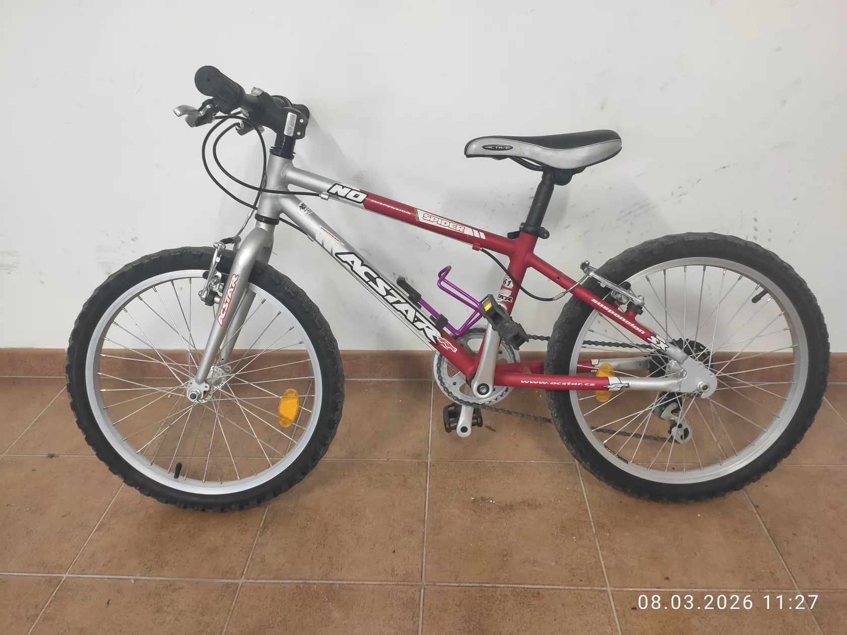 Prodám zachovalé funkční kolo NO SPIDER od ACSTAR, velikost 20", brzdy přední i zadní funkční, řazení Shimano na řídítku (6 stupňů), pohodlné sedlo, odrazky, nosič na pití, barva červenobílá (vhodná pro kluka i holku) - viz. foto. Jedná se o kolo z roku 2009 (viz doklad o pořízení), používané 2 dětmi (ale minimálně), je běžně opotřebené, neservisované. Prodej pouze osobně.