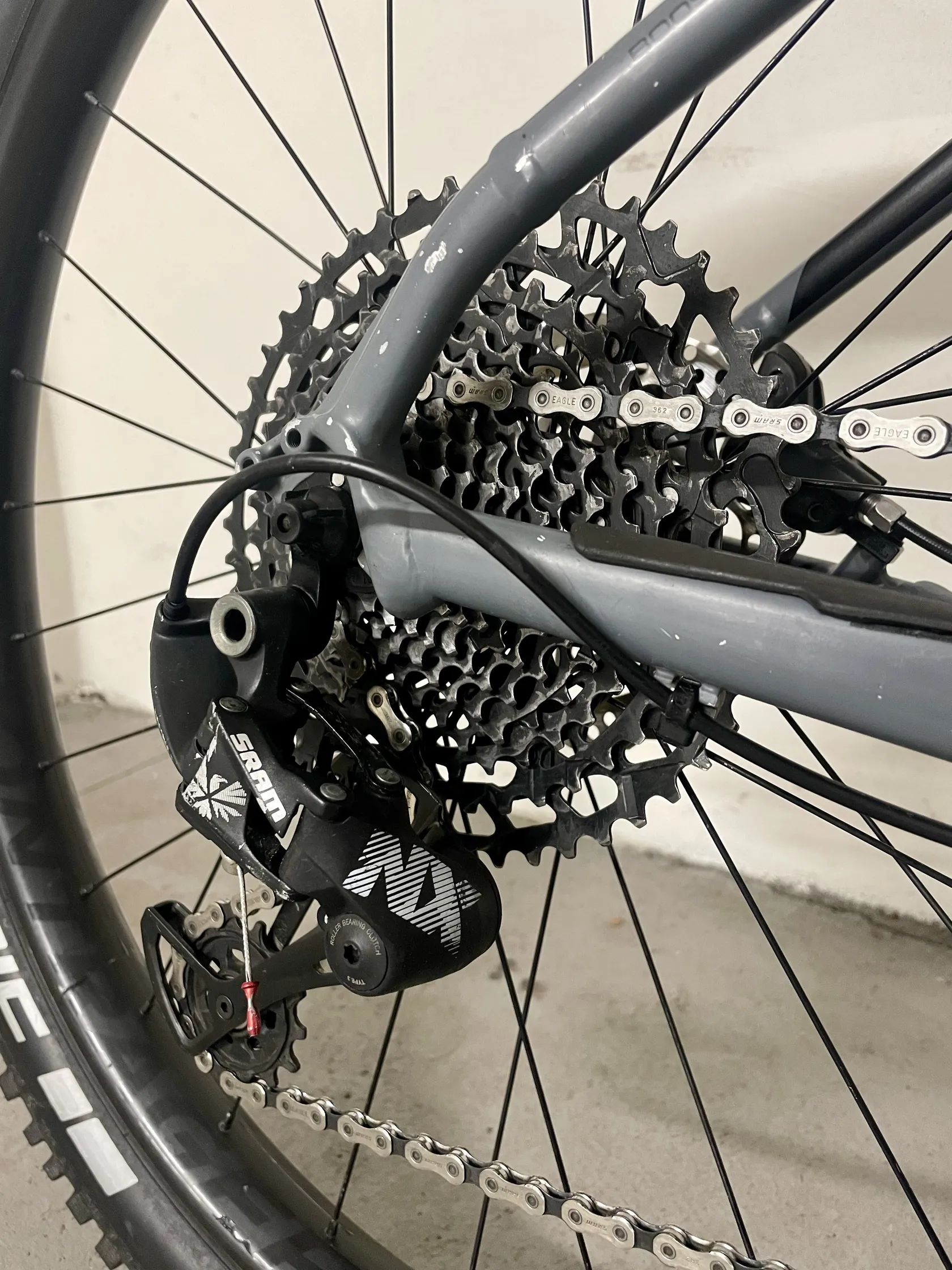 Pohon SRAM NX Eagle 1x12 – moderní 1x12 s velkým rozsahem, převodník zvětšený (+2 zuby) pro rychlejší převody; kazeta už na hraně životnosti (nutno počítat s výměnou)