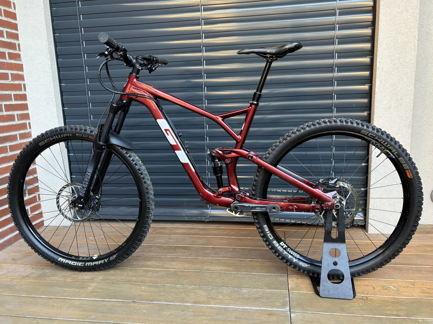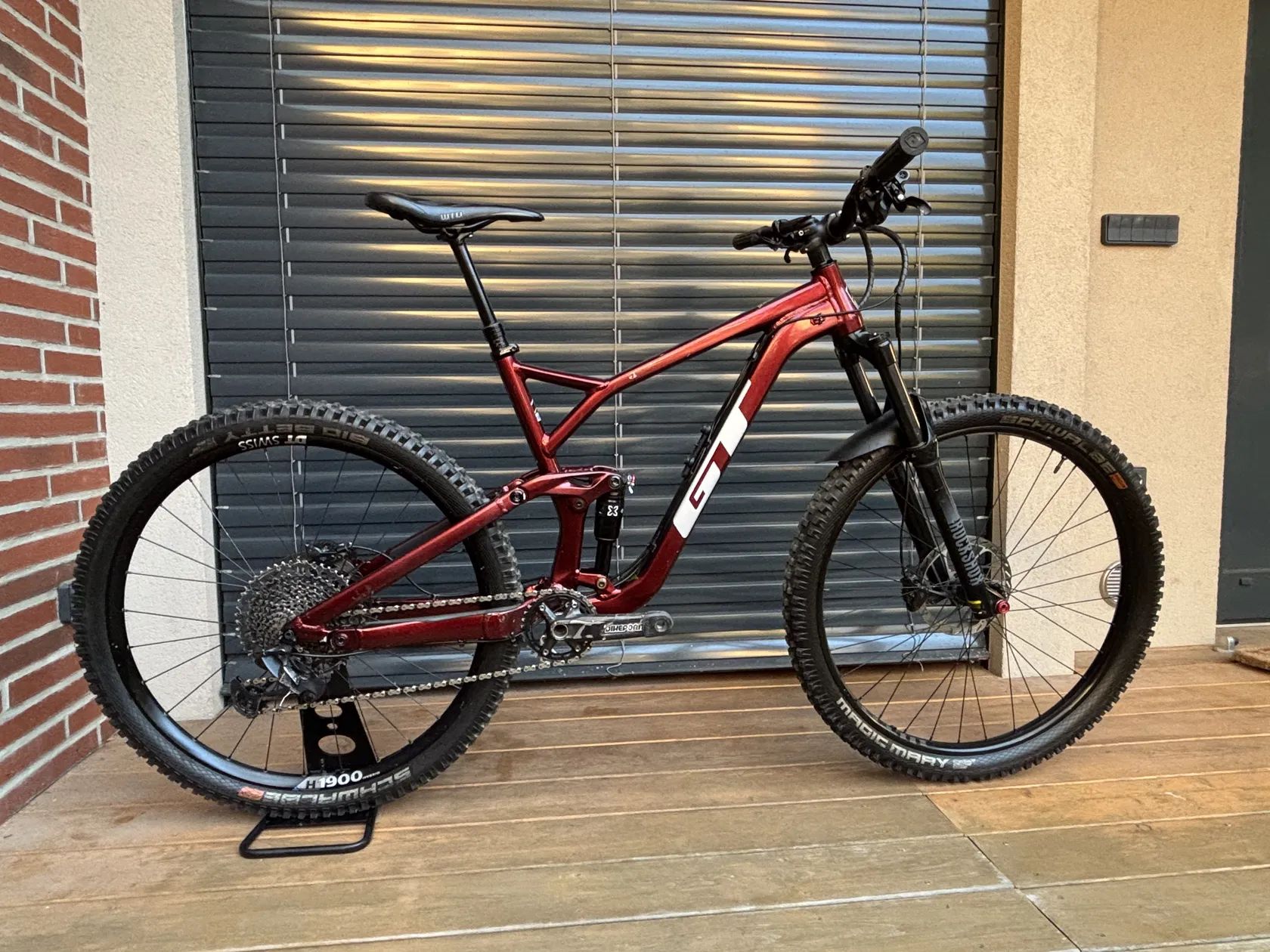 Rám: Al. zdvih 130 mm, vel. L, s flip chipem, tlumič x fusion, před sezónou v servisu, v rámu měněná ložiska Vidlice: Rockshox 35 silver, před sezónou v servisu Kola: Z: DT Swiss 1900H, P: WTB Obutí: Schwalbe - Magic marry/Big betty, směs addix soft (oranžová), v zadním kole vložka Peppis tire noodle Řazení: komplet Sram GX Lunar 12 rychlostí, kromě klik (Shimano deore) Brzdy: Shimano m6100, nová kapalina, nové metalické destičky s chladiči (XTR) Kotouče: Sram HS2, 200 mm Řidítka: GT, 800 mm, 30 mm rise Gripy: Burgtec bartender soft Sedlo: WTB silverado Sedlovka: GT, 125 mm