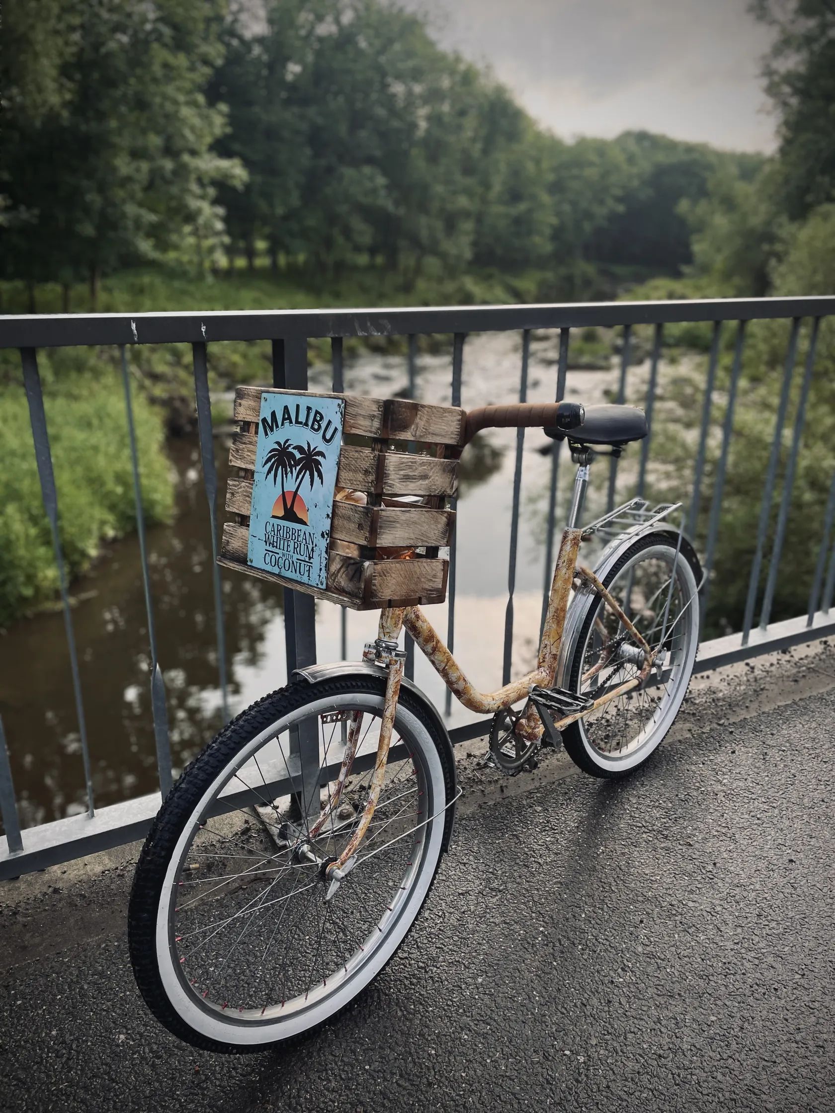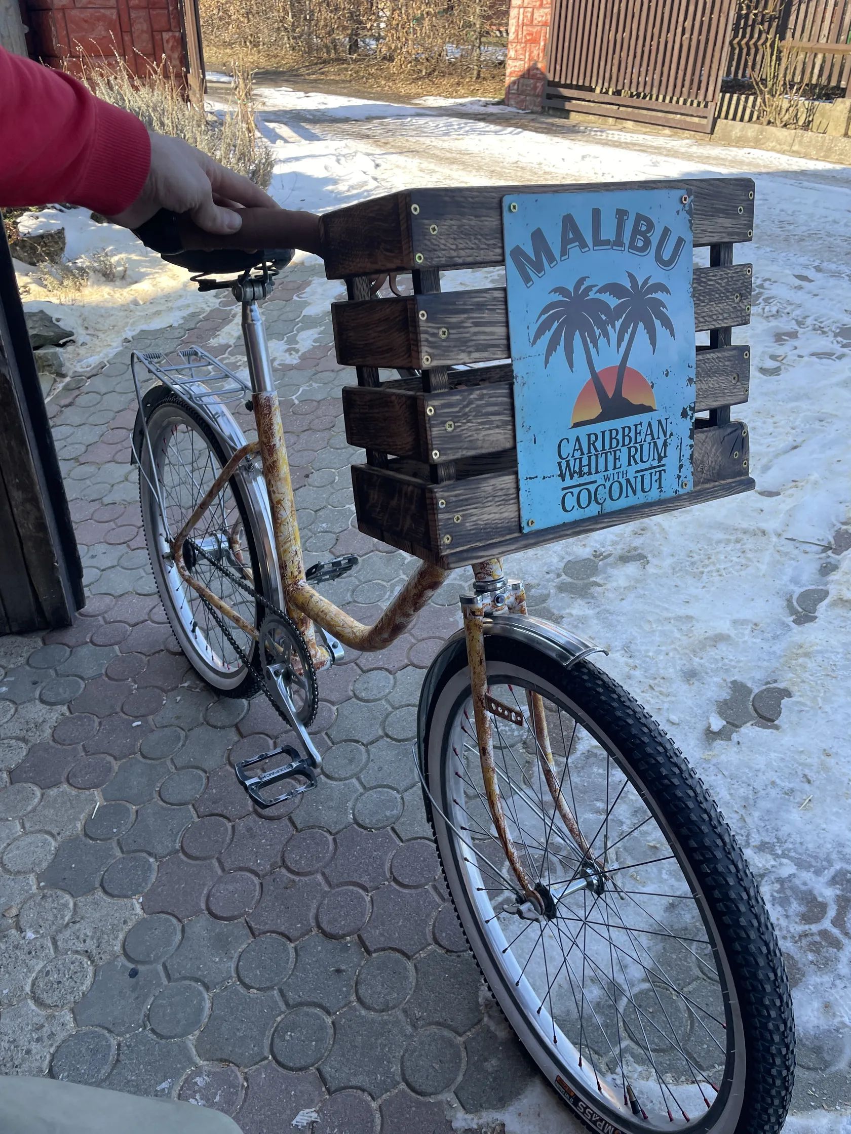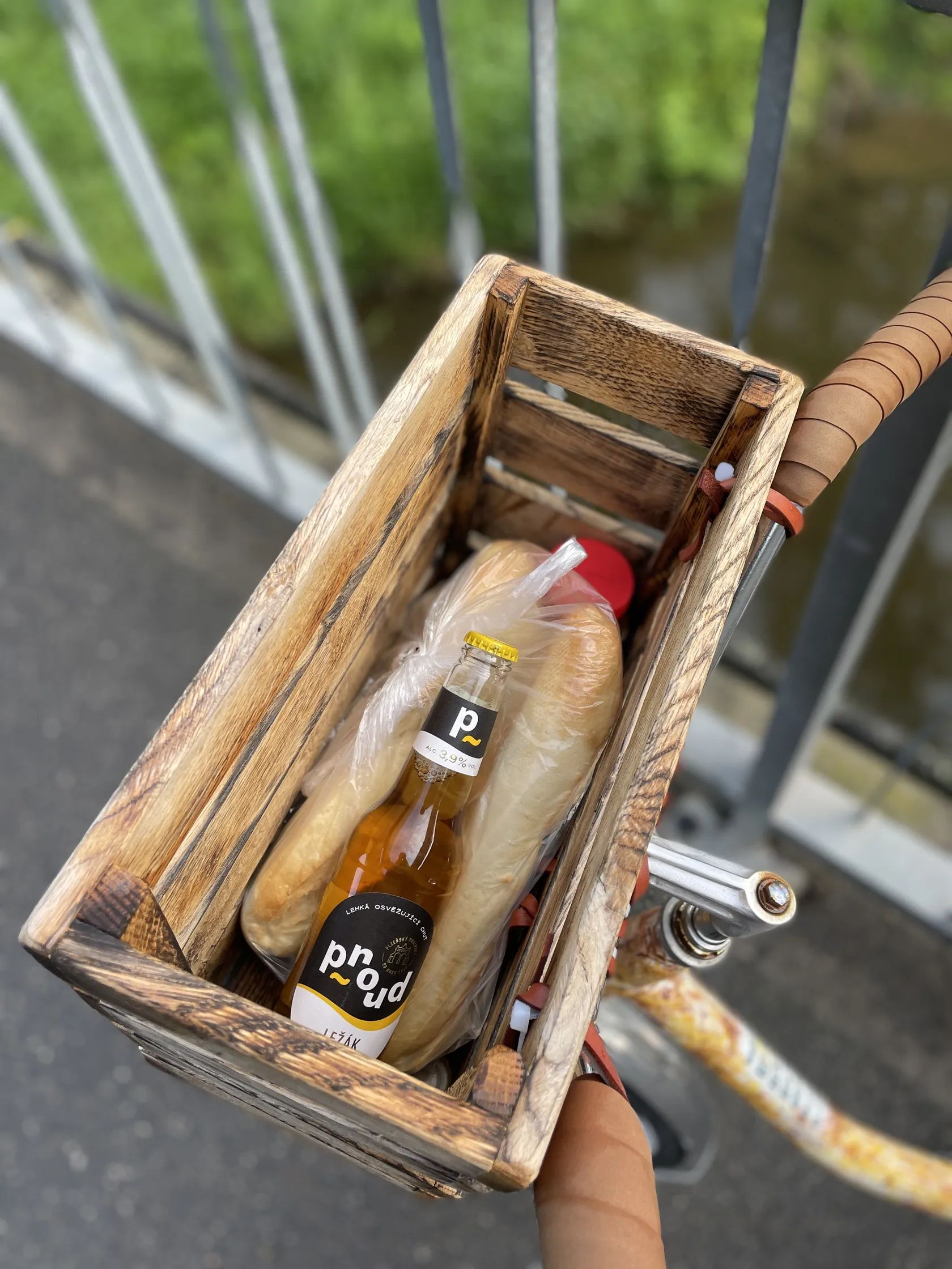 Dřevěný koš na řídítkách je z dubového dřeva.