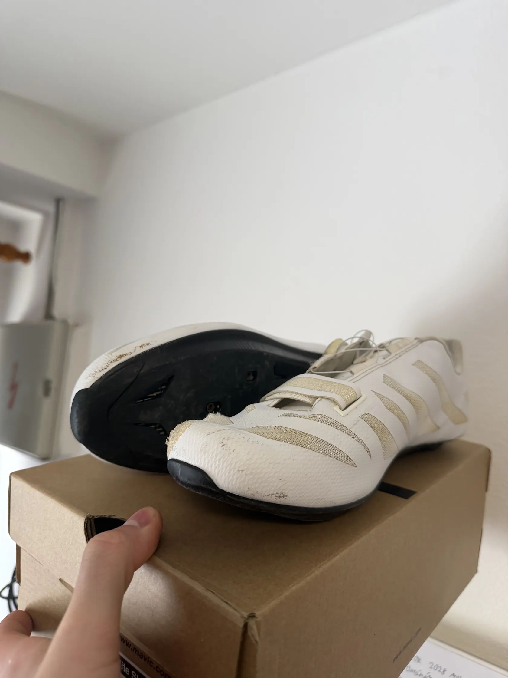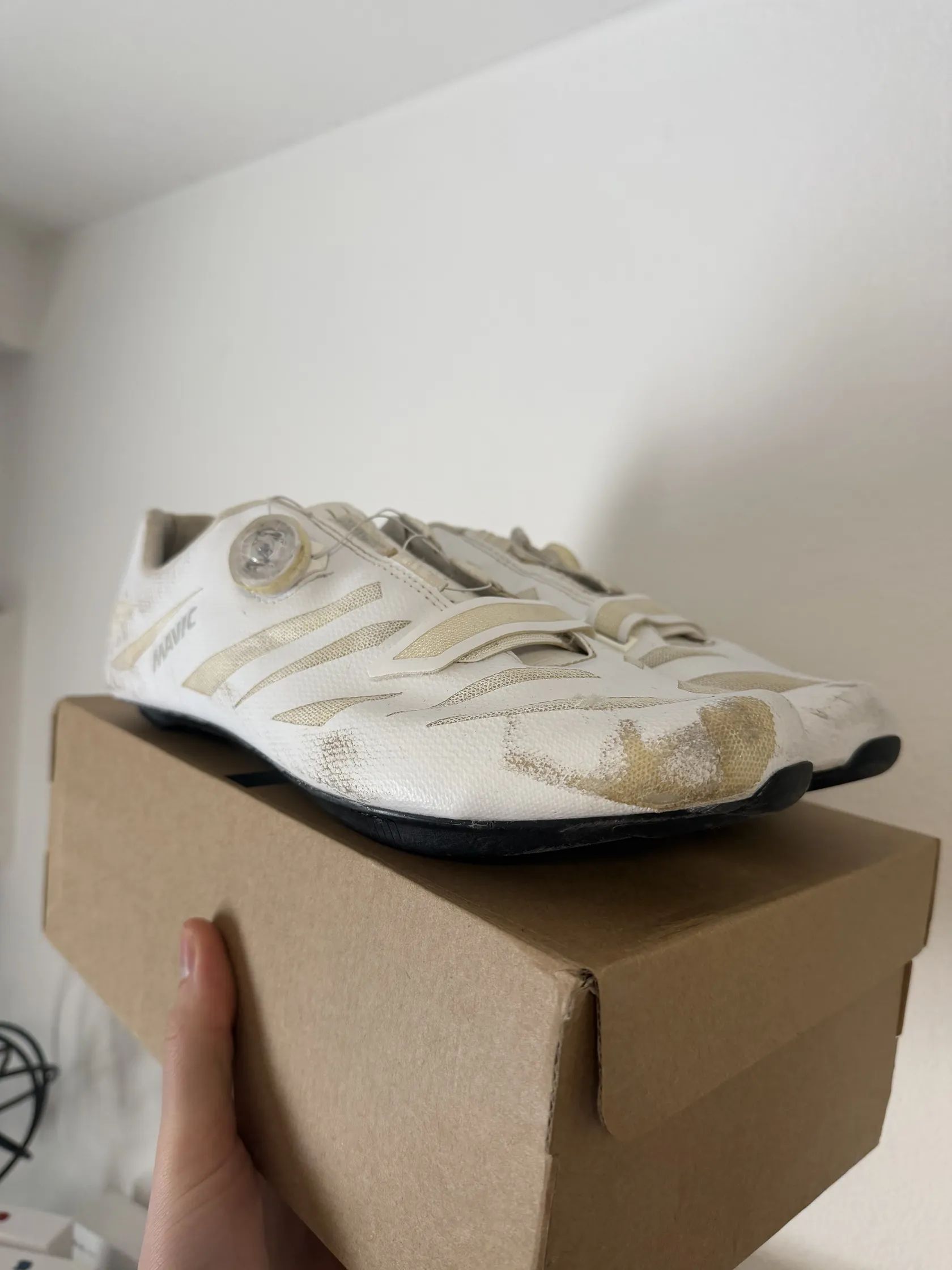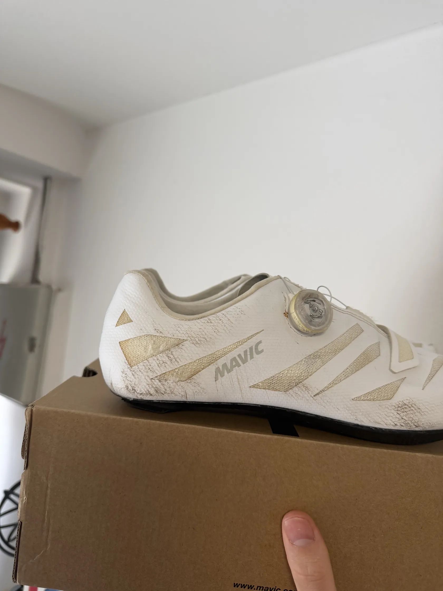 Prodám boty značky Mavic. jedná se o model Elite SL 21 Boty jsem měl v Kadetských kategoriích od té doby jsem s nimi nejzedil jelikož jsem z nich vyrostl. Boty mají karbonovou podrážku a systém utahování boa bohužel jsem spadl a pravá tretra je odřená viz foto