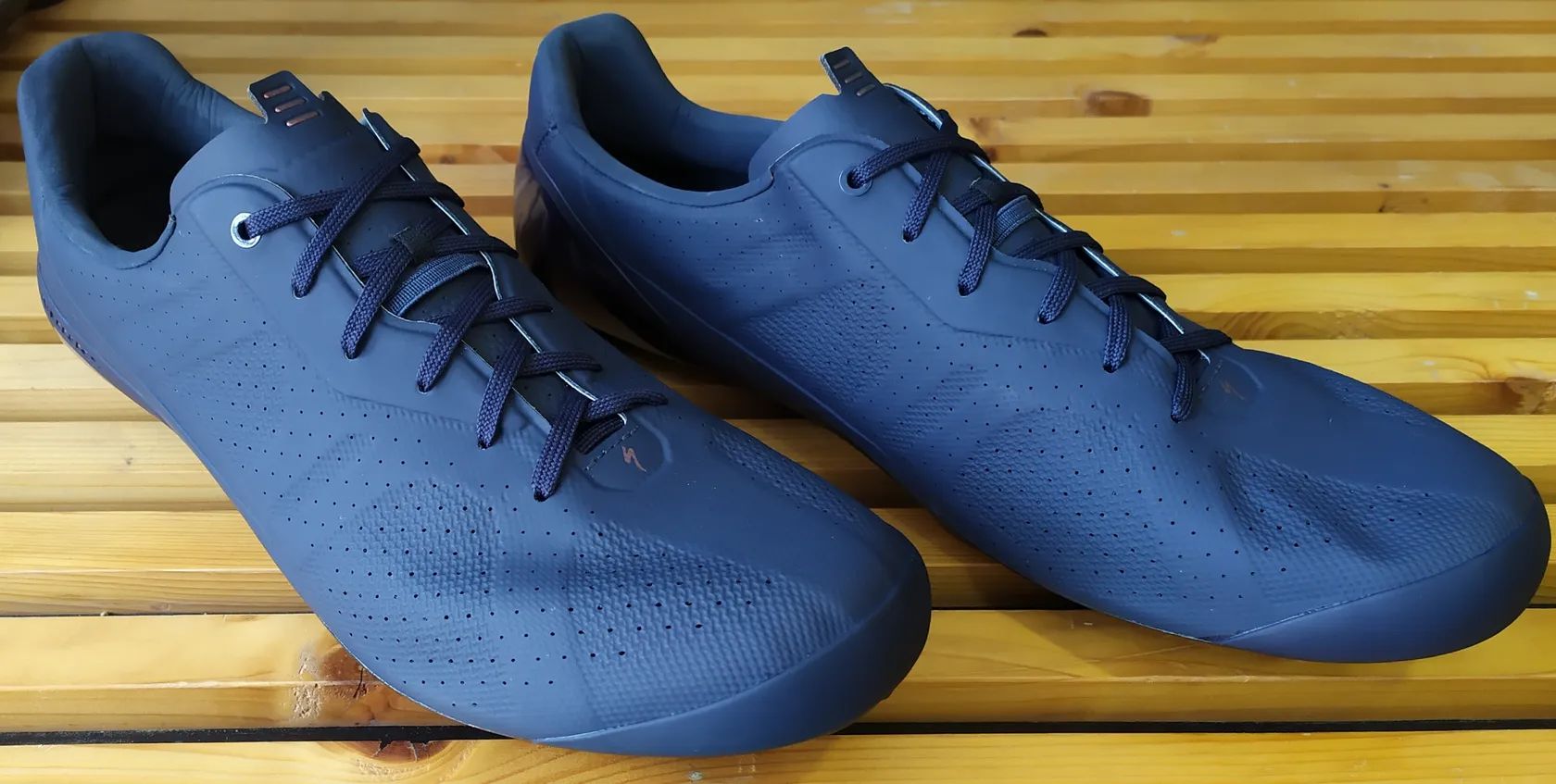 Tretry jsou ve 100% stavu, pouze opatrně vyzkoušeny na koberci. Barva je tmavě modrá (dark navy) s měděnými akcenty.