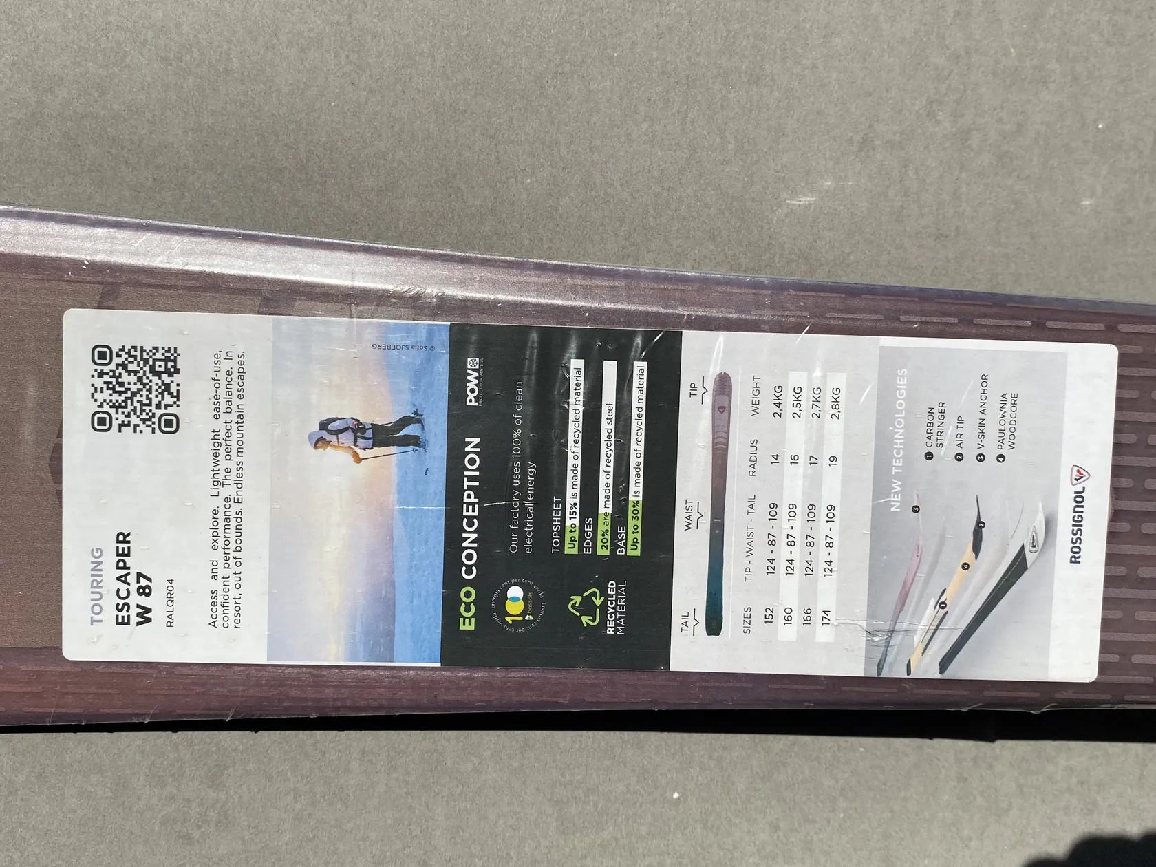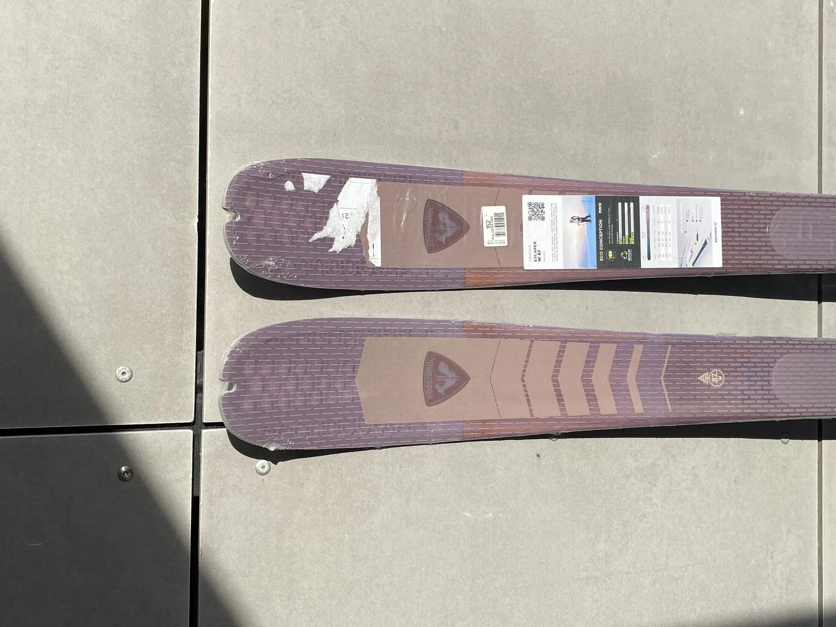 Lyže - přesné označení je - Rossignol ESCAPER W 87, 152 cm. Lyže jsou úplně nové - zcela nejeté - zatím jsou nevrtané - takže na nich nemohlo být zatím nikdy přimontováno žádné vázání. Lyže jsou ještě z výroby originálně zabalené - zatavené ve fólii.