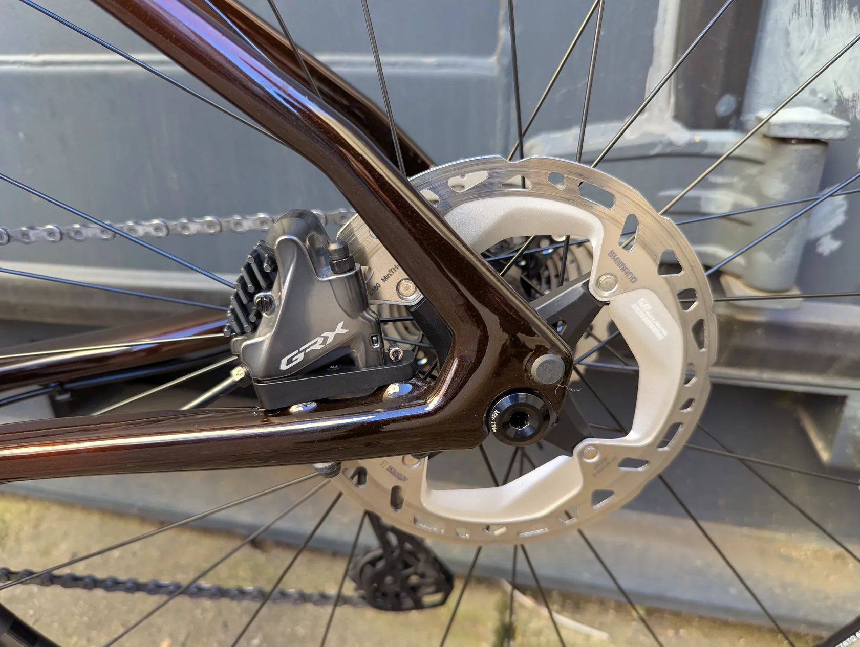 Brzdy Shimano GRX 800 s ergonomickými pákami a 160mm kotouči – výkonné a dobře dávkovatelné.