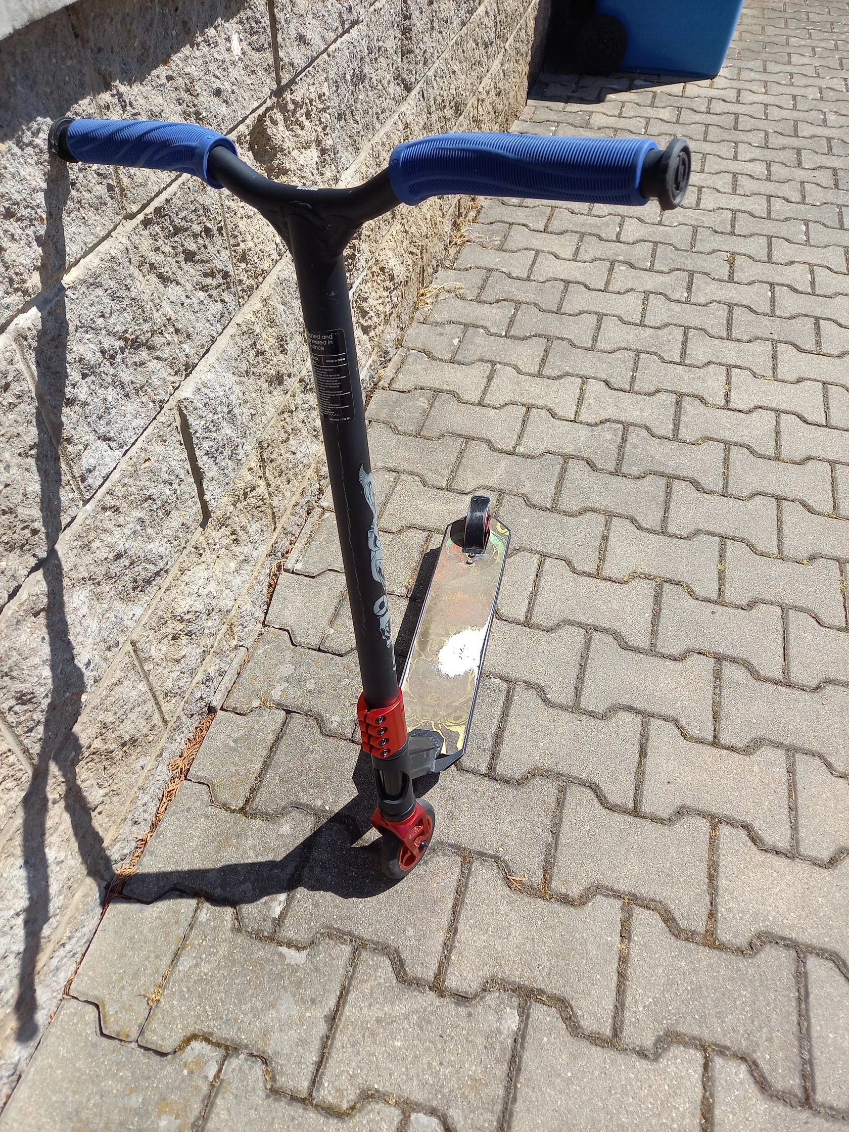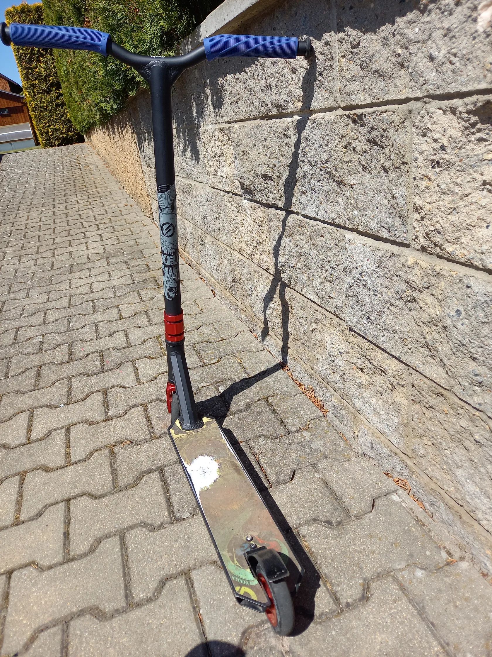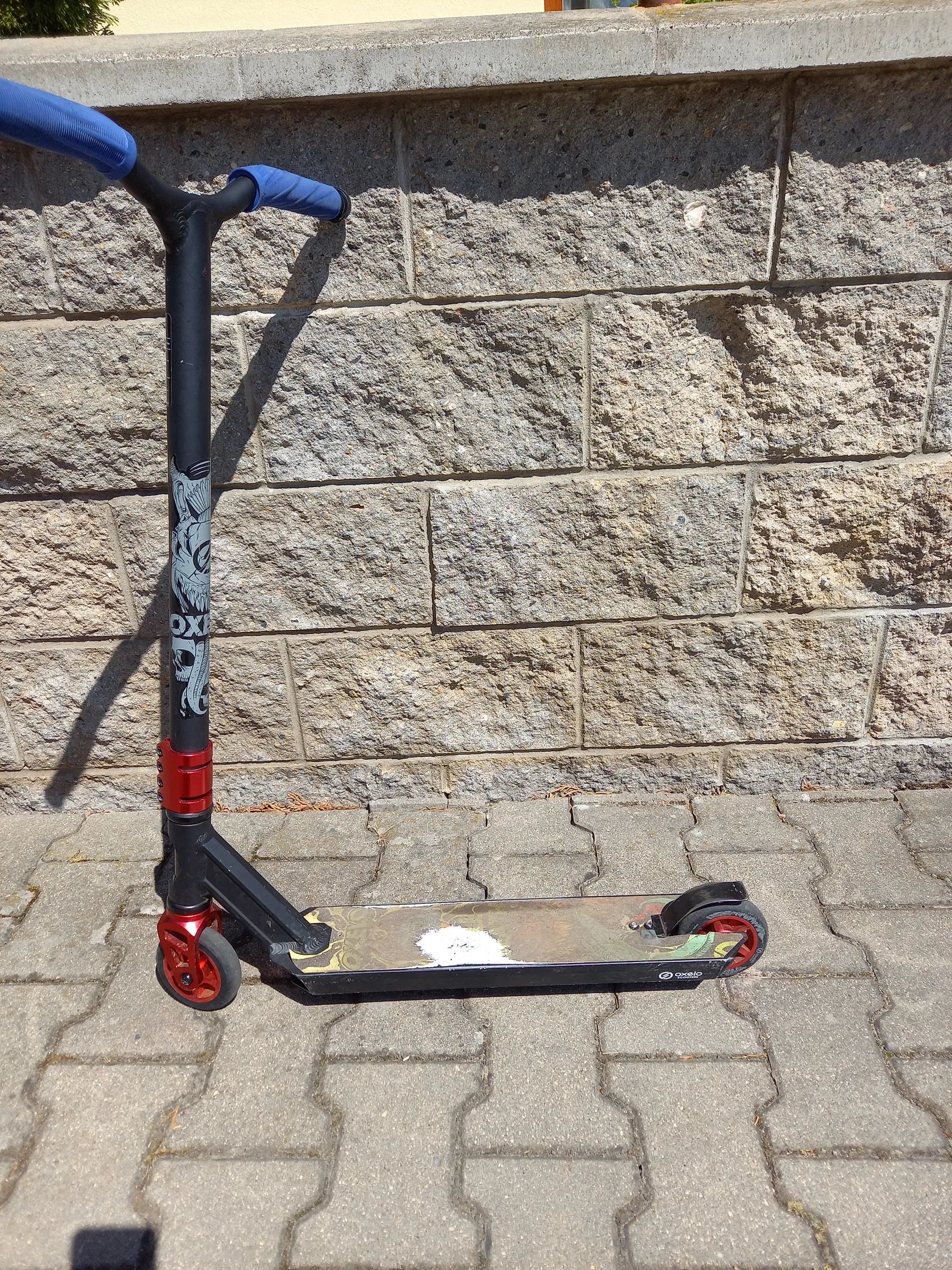 Koloběžka OXELO byla používána jeden měsíc. Výška řidítek 87cm, délka koloběžky 66 cm. Koloběžka je v perfektním stavu, pouze plocha na stání je ošoupaná, ale to se udělá hned, jak koloběžku použijete. PC 2300,-Kč + přidávám náhradní černá gumová madla na řidítka, nyní jsou modrá.