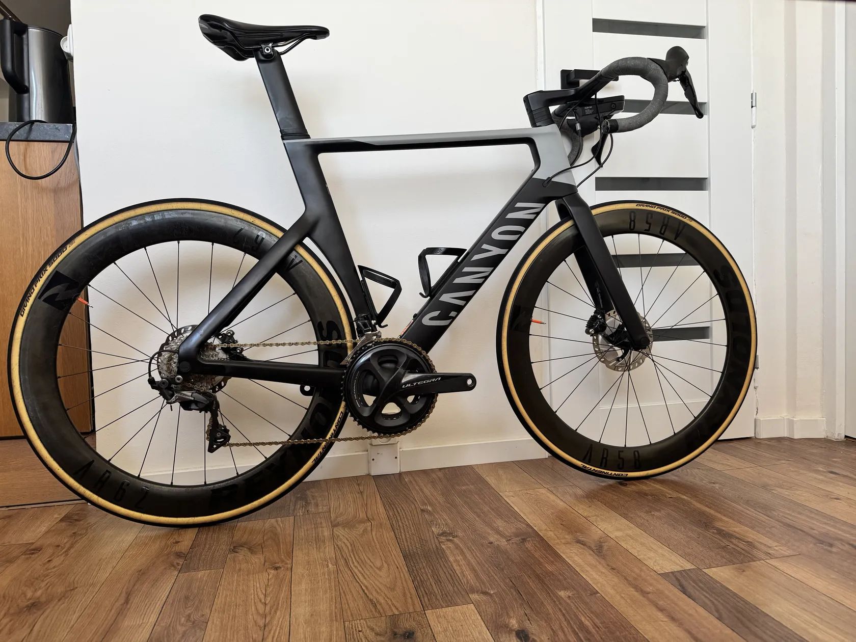 Rozdíly od továrního nastaveni: Kazeta Ultegra 11-30 Sedlo Specialized Phenom Expert 155mm Řetěz KMC gold Duše Tubolito Mount pro Garmin + přední světlo Canyon