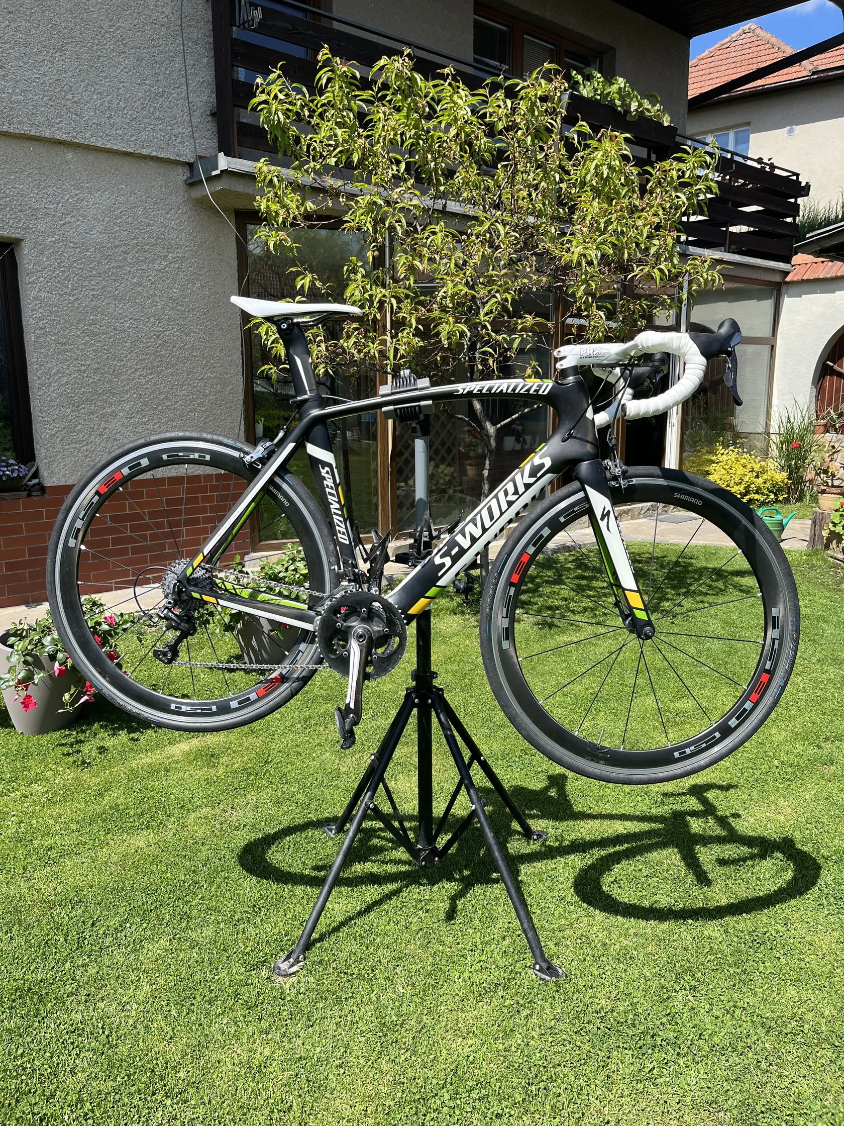Prodám plně funkční celokarbonové kolo týmu HTC-Highroad (sagan,cavendish) z roku 2012 S-works Venge + Di2. Kolo je momentálně na mechanice Ultegra na kadetských převodech v ceně kompletní Dura-ace Di2. Kolo je celokarbonové (rám, řídítka, kola, kliky, sedlo, košíky…). Kola mají hliníkovou brzdnou plochu. Pláště Pirelli zero. V ceně i computer Sigma+snímače Sigma.