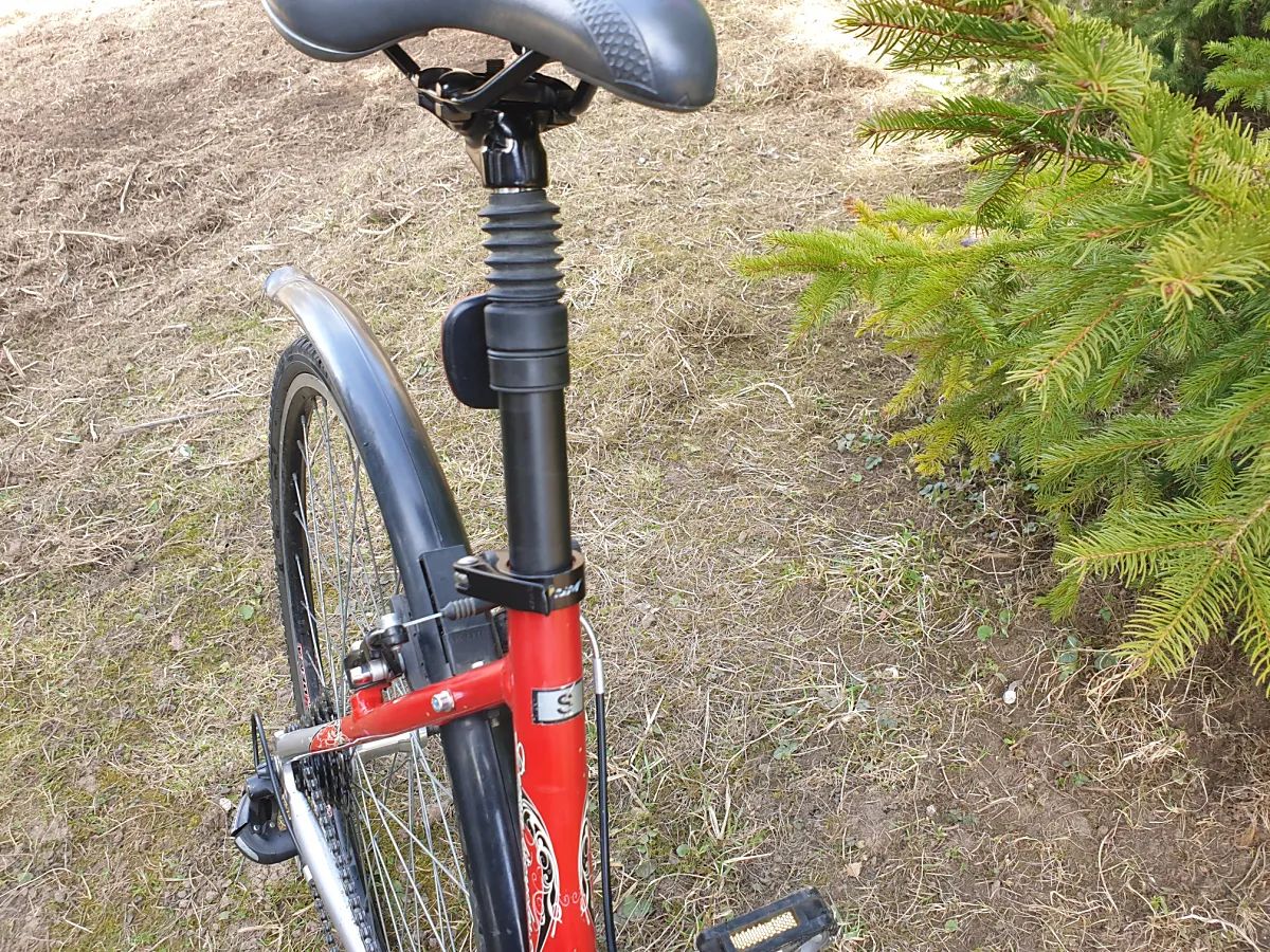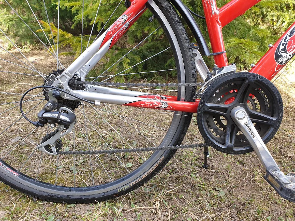 Trekingové kolo na postavu cca 165cm, 28" kola, ideální pro menší paní nebo mladou slečnu. Odpružená vidlice (nestavitelně), odpružená sedlovka (stavitelně), blatníky, stojánek. Je to pohodlný kliďas na cesty po městě nebo do lehkého terénu.