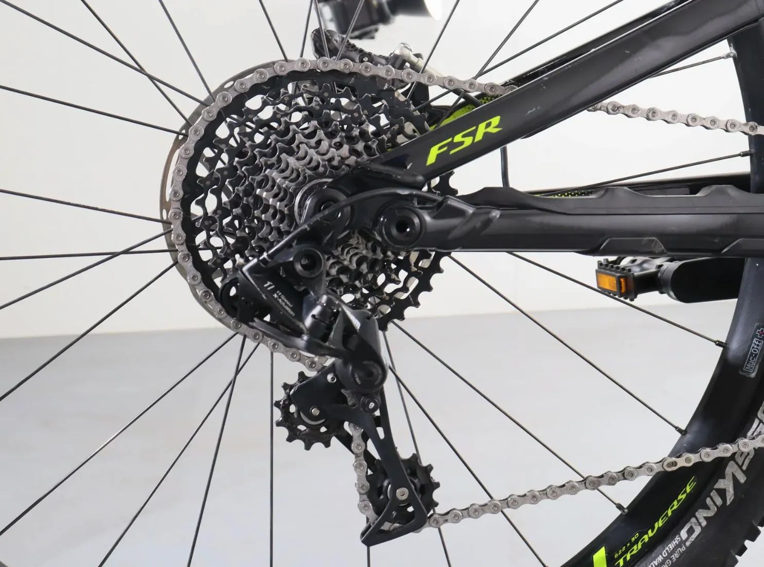 - Pohon SRAM NX 1×11 – jednoduché, robustní, dostatečný rozsah 11–42 zubů.