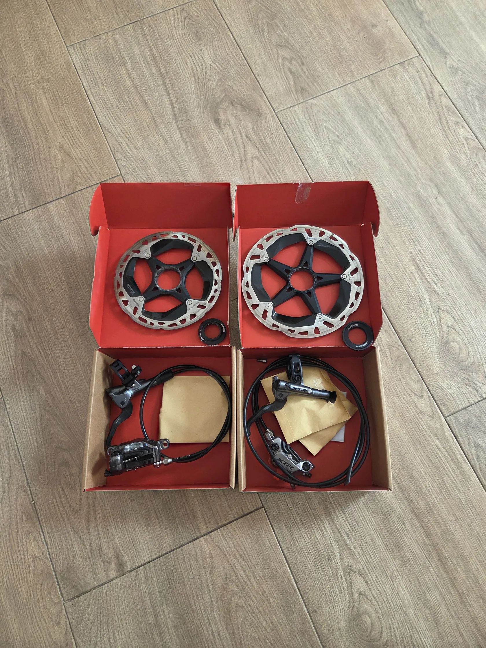 Nabízíme k prodeji zánovní brzdovou sadu Shimano XTR 4 pístové včetně kotoučů. Přední 180 mm zadní 160mm.Brzdy jsou v zachovalem stavu.Třmeny plus desky jsou úplně nové.