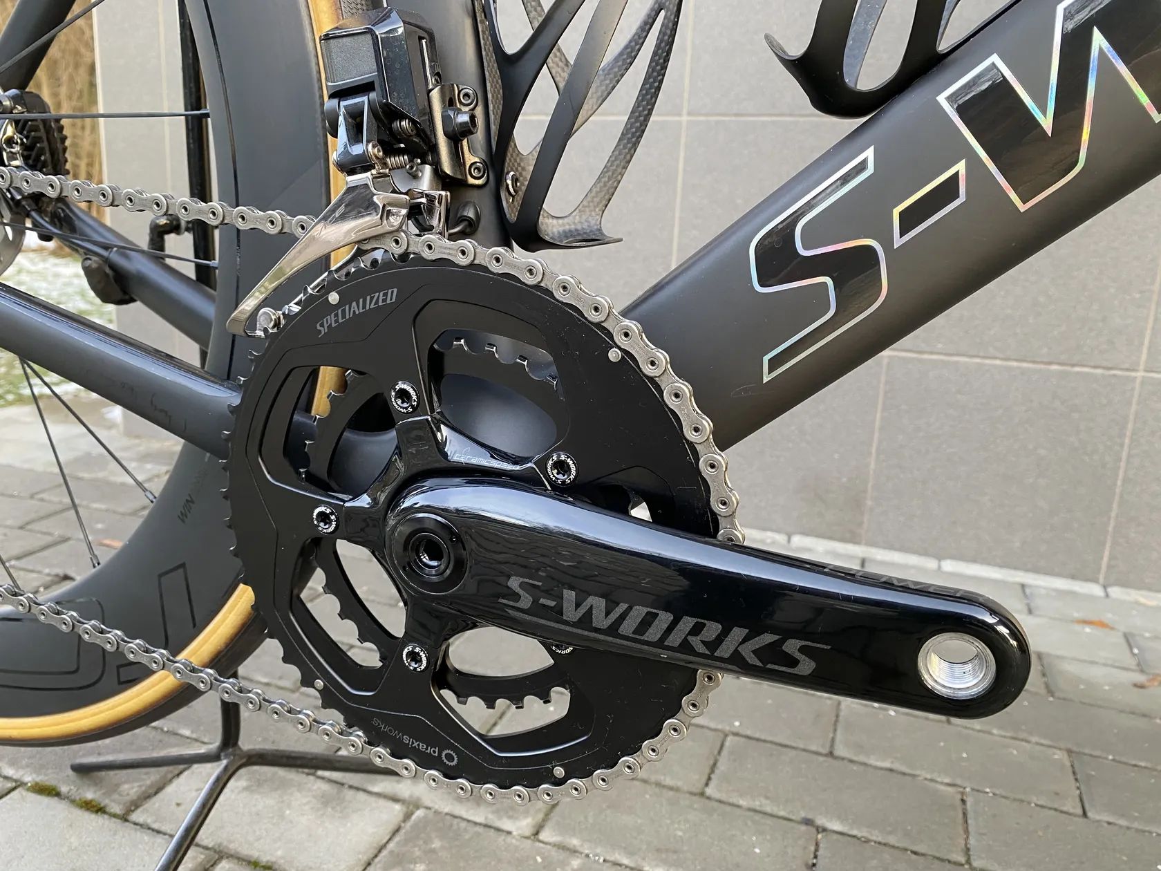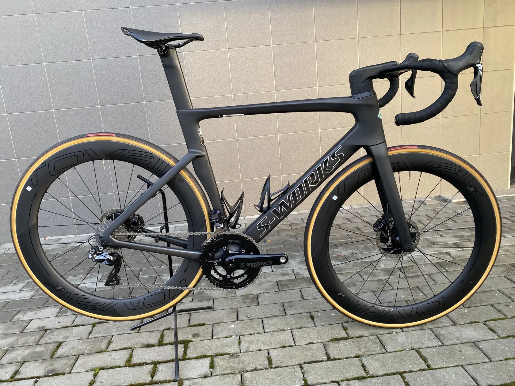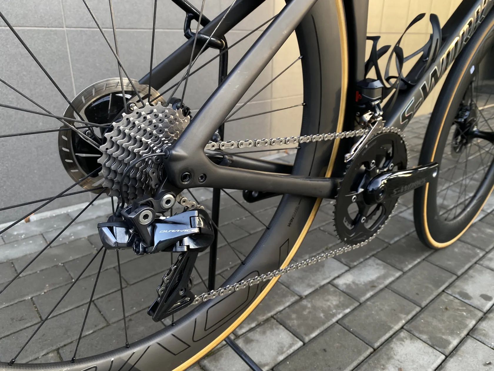 Rám : S-Works FACT 11r carbon Sada : Shimano Dura-Ace Di2 R9150 Kliky : S-Works Power Cranks 172,5mm, oboustranný wattmetr, převodníky 52:36, středové složení Ceramicspeed Kazeta : Shimano Dura-Ace R9100, 11sp, 11:28 Zapletená kola : Roval CLX 64, tubeless ready, výška profilu 64mm, náboje Roval CLX, ložiska Ceramicspeed Pláště : Turbo Cotton 26mm Kokpit : S-Works Aerofly II Sedlo : S-Works Power 143mm Sedlovka : S-Works Venge Aero Seatpost, FACT Carbon
