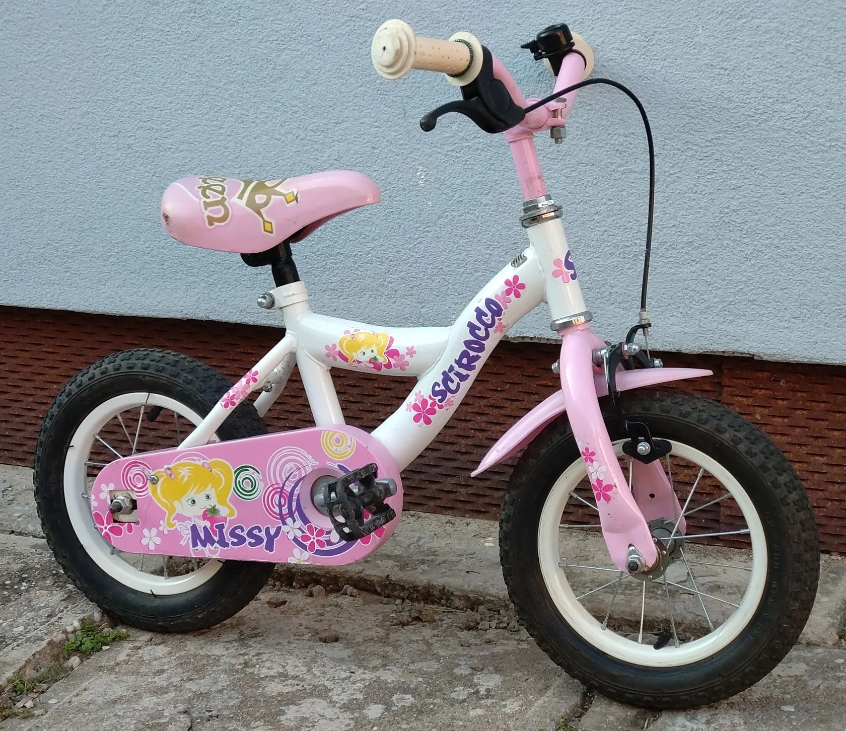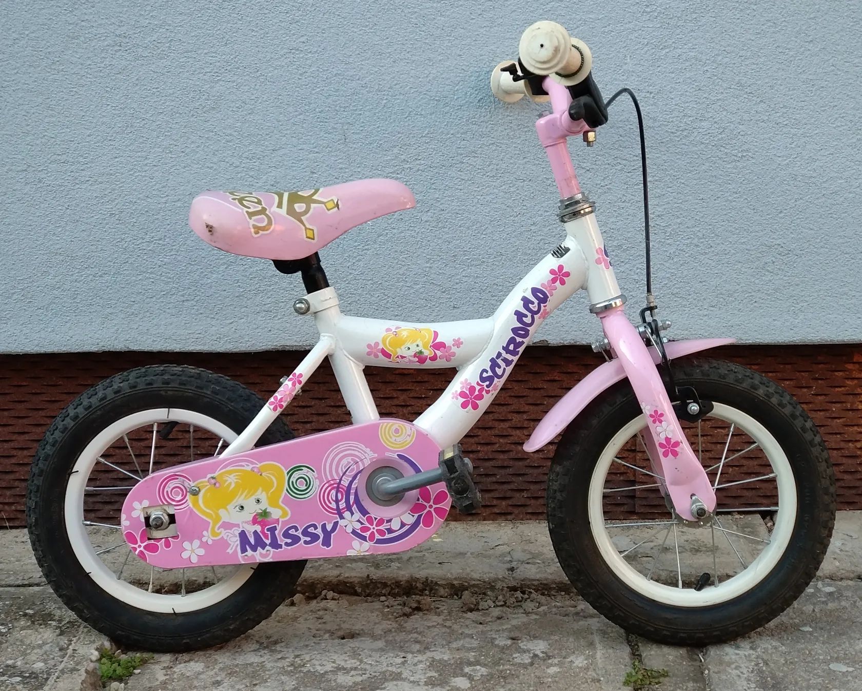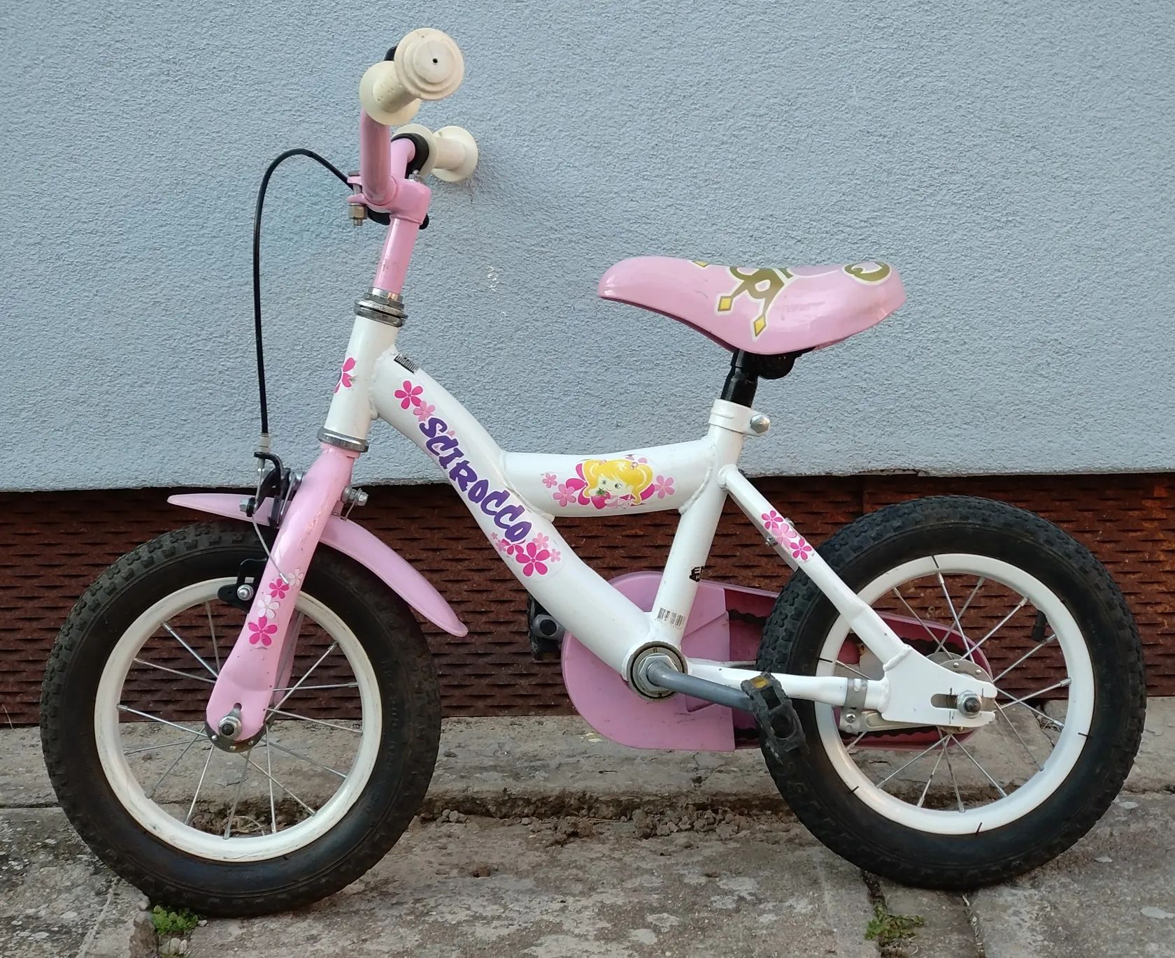 Růžovo-bílý stroj, na kterém cyklistice postupně propadly tři mé děti. Nemá postranní kolečka, protože rovnováhu natrénovaly už na odrážedle (také v prodeji v mých inzerátech). Otlučené, ale funkční. Protišlapná zadní brzda.