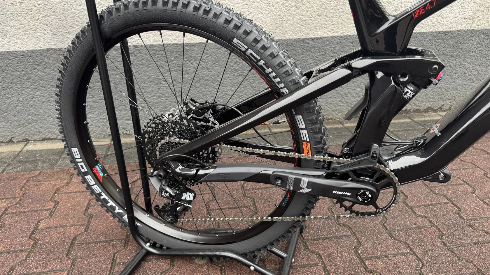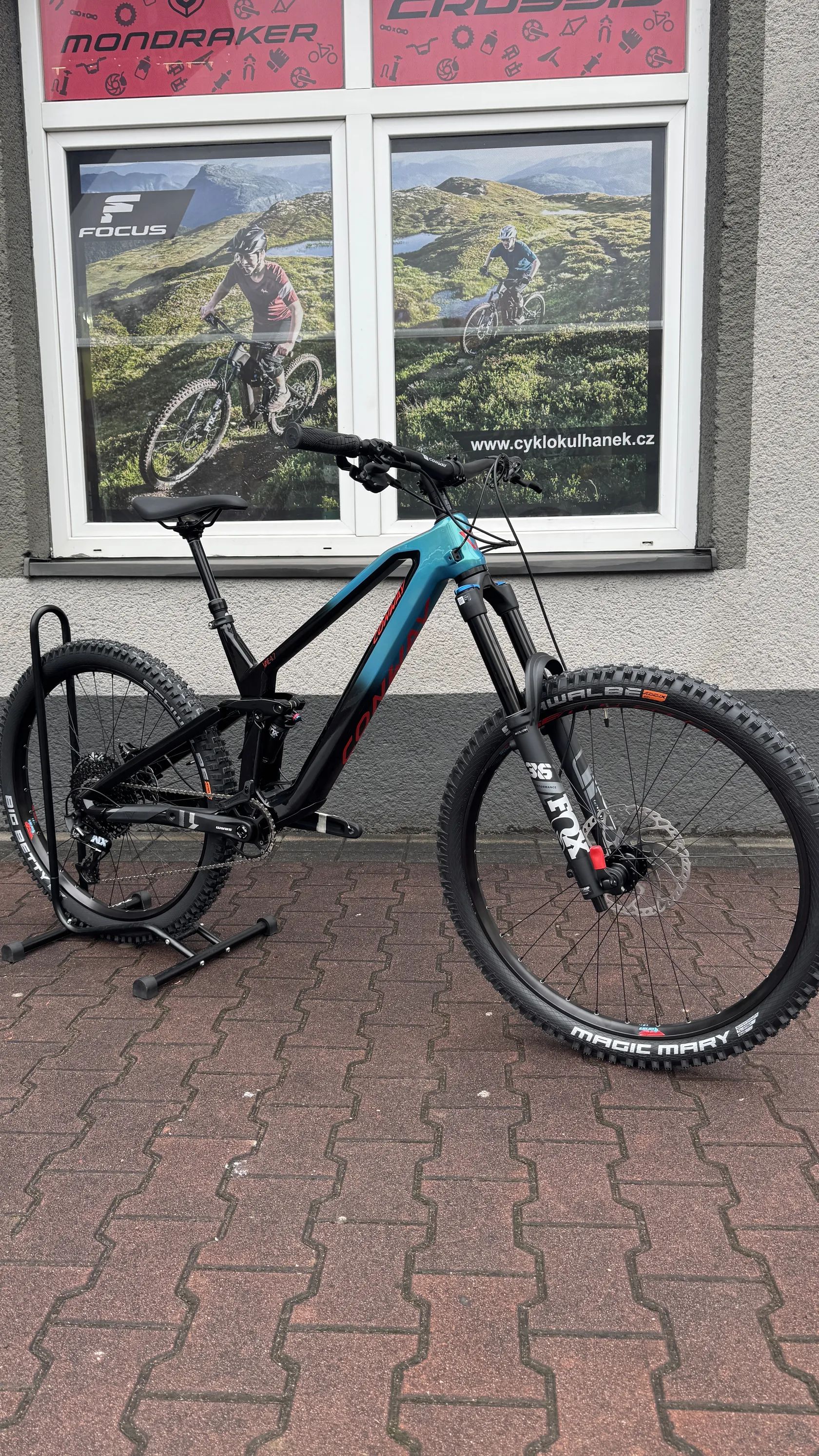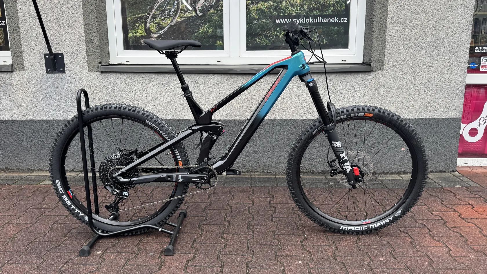 - Bezdušově připravené ráfky Rodi Ready 35 + pláště Schwalbe Magic Mary / Big Betty – osazení cílené na enduro a sjezd.